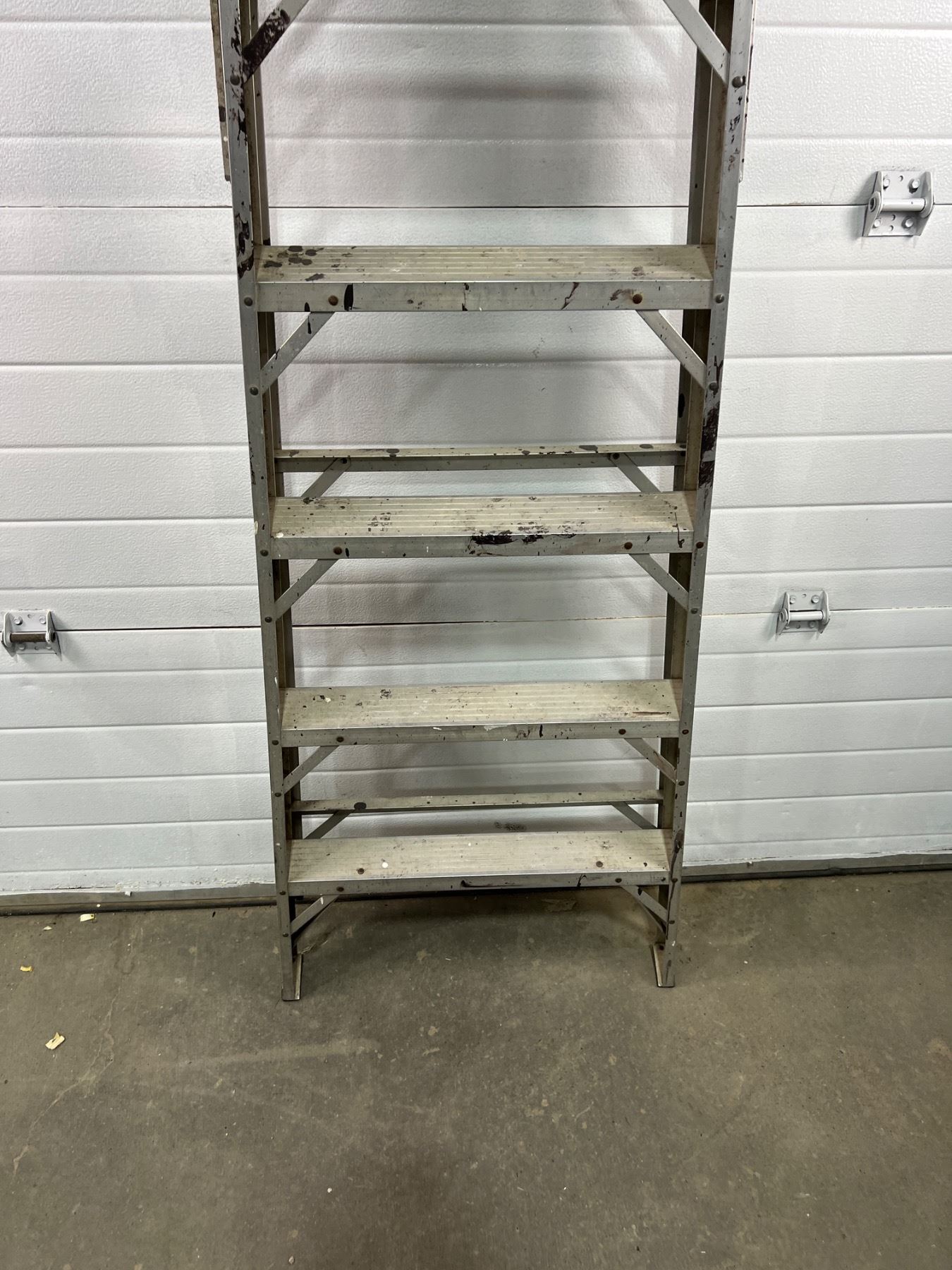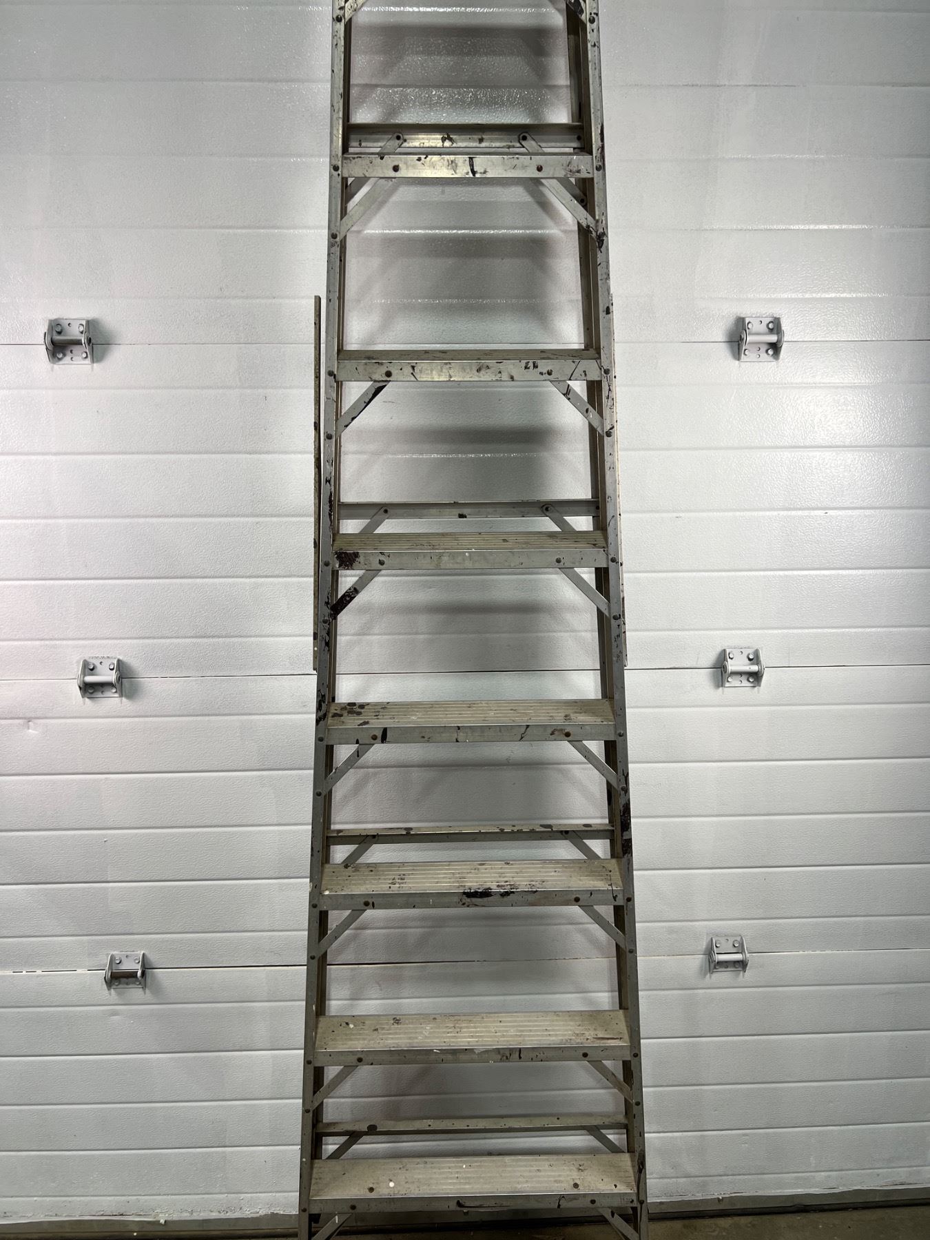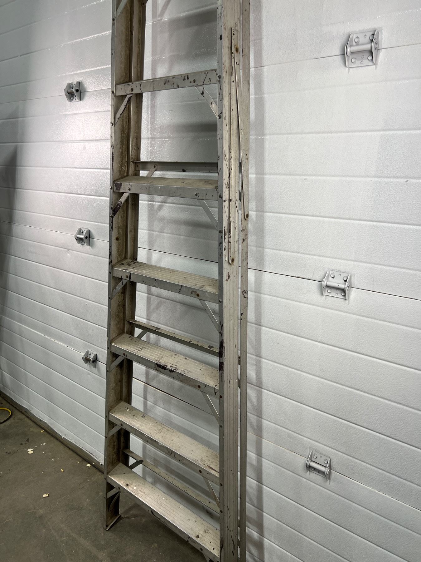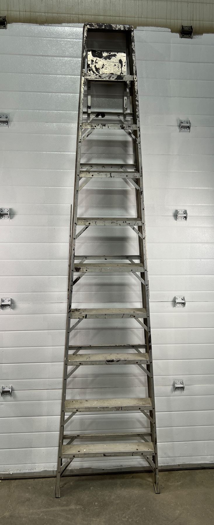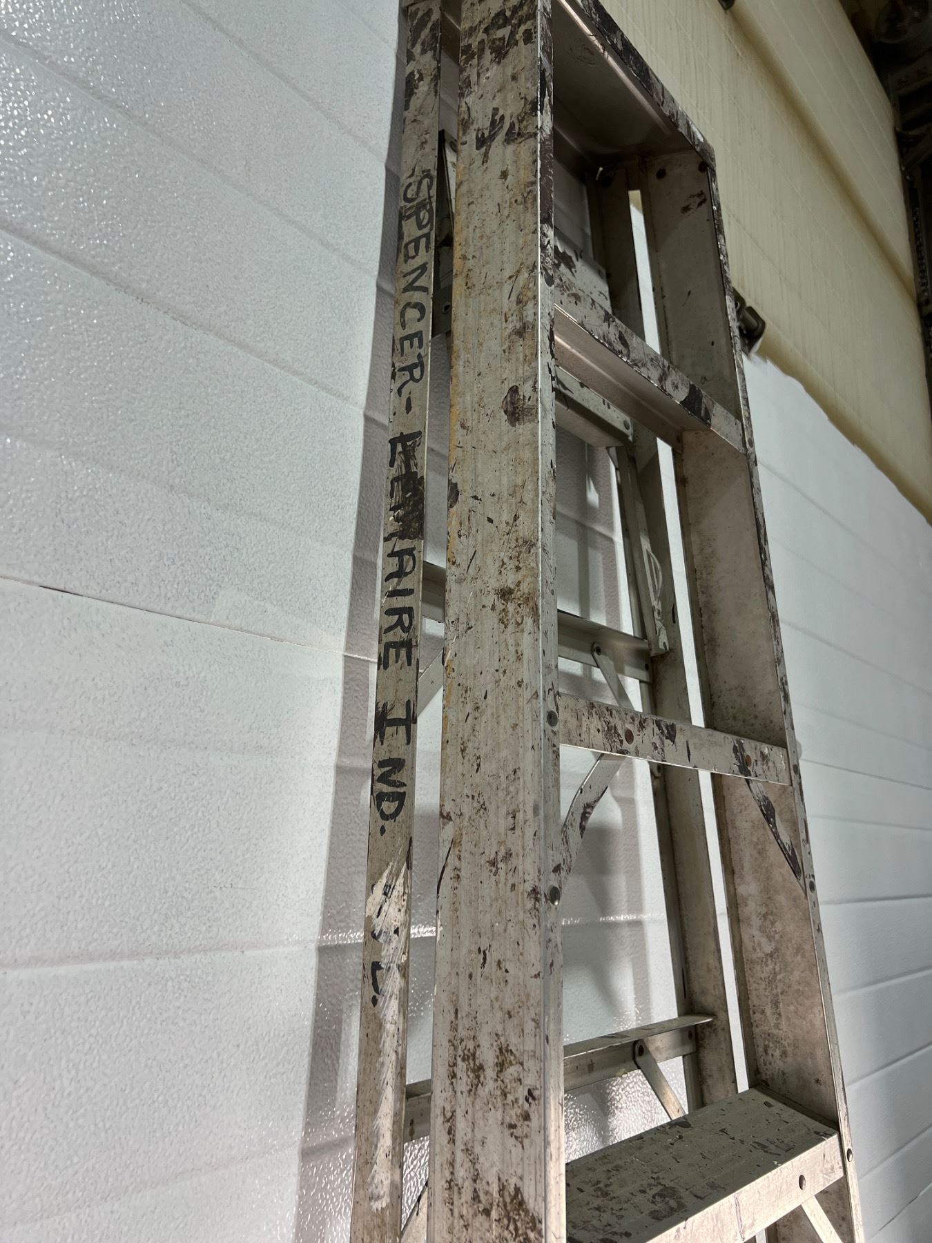 Paint staining and corrosion to ladder. Writing on edge of ladder.