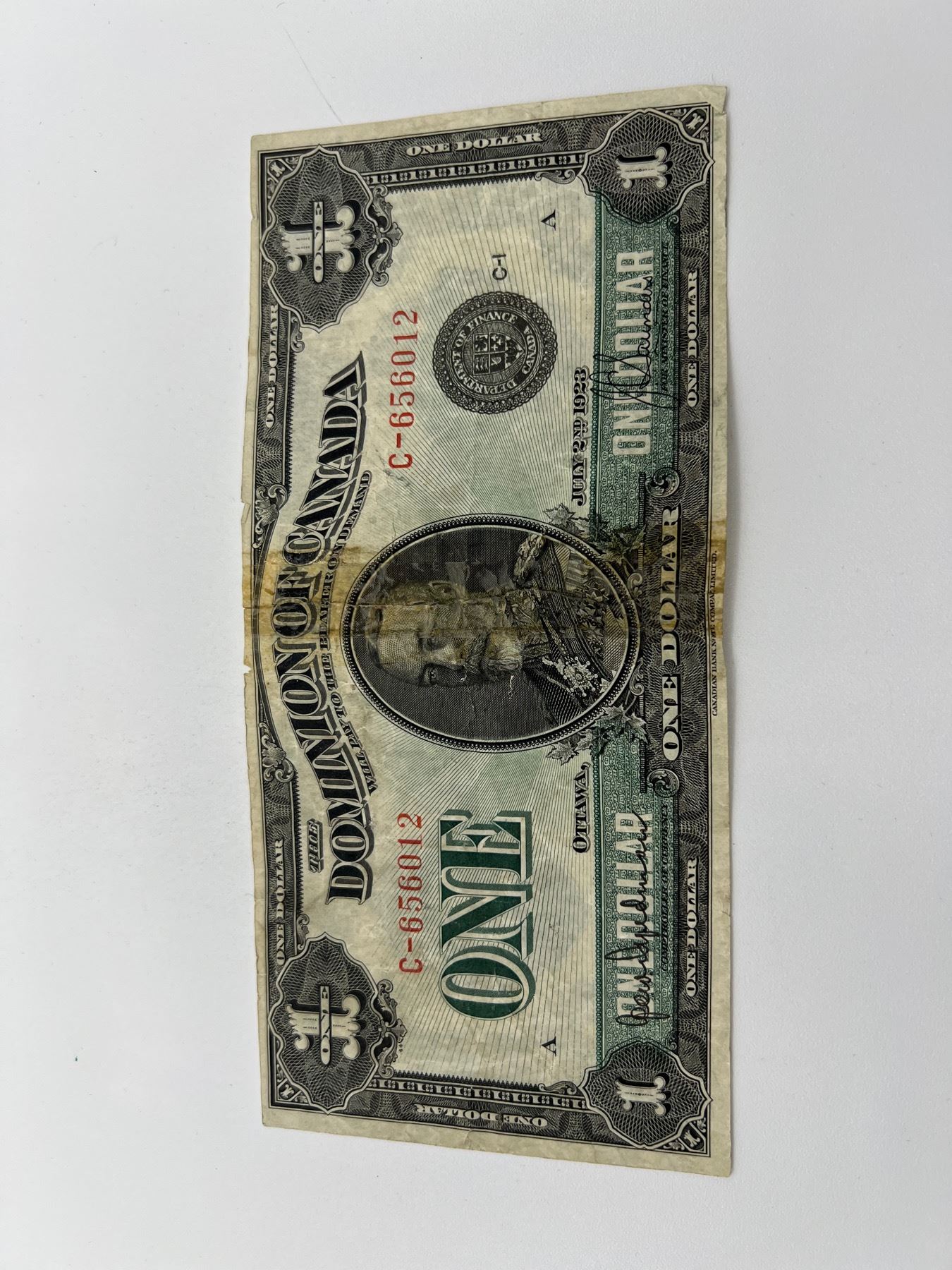 Large size Canada $1 banknote Measuring 8.5cmx17.75cm. Called a "horse blanket" due to the large size. Hyndman Saunders Signatures, Series C. King George V and Library of parliament.