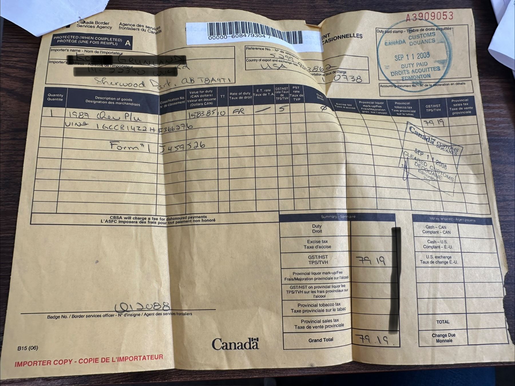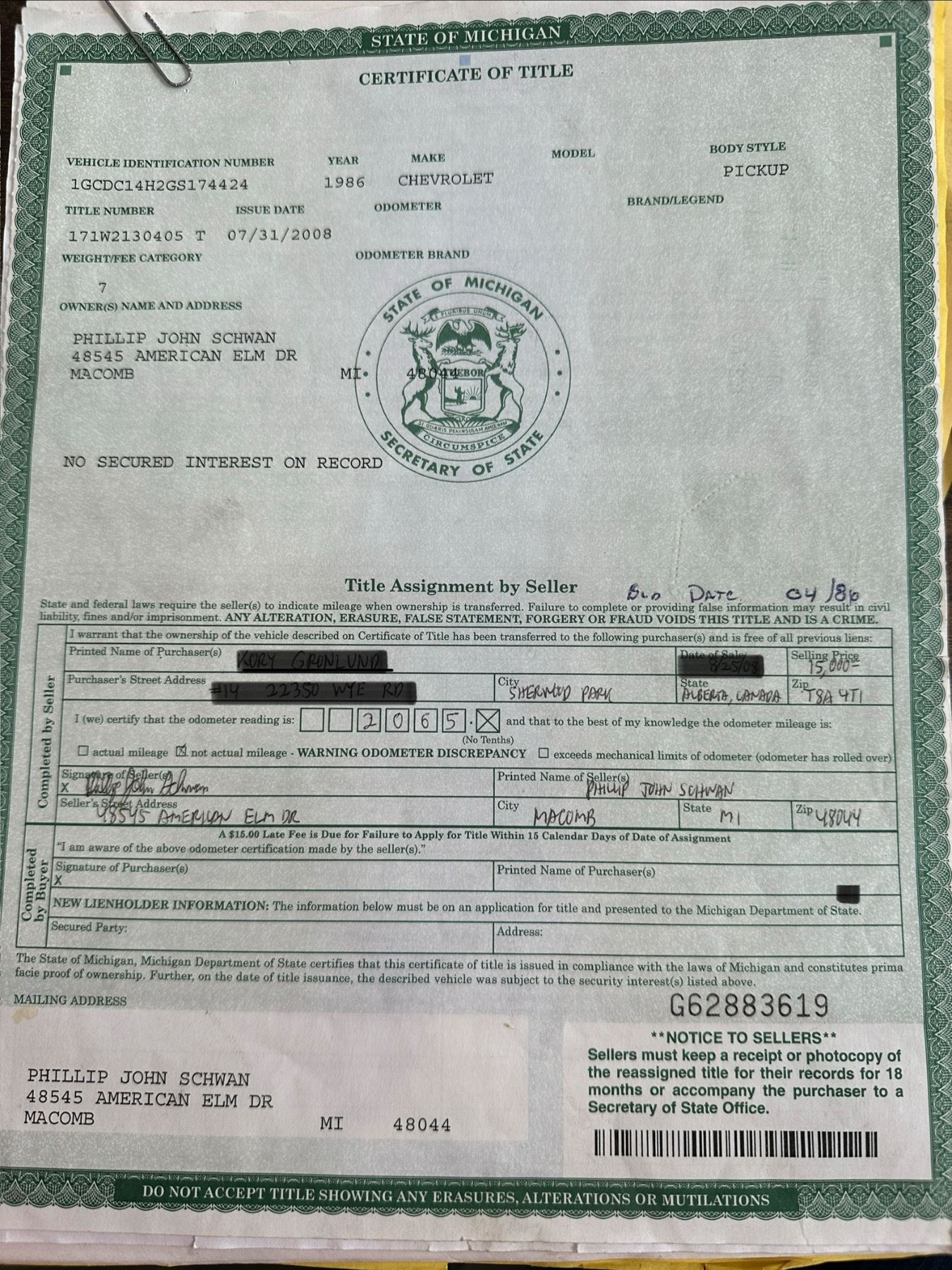 Not currently registered in Alberta, Bill of Sale will be provided