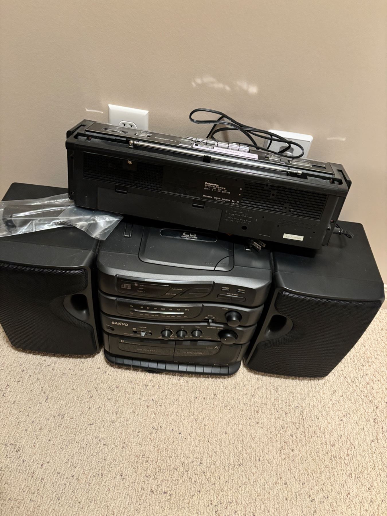 Includes, Panasonic cassette recorder Model No. RX-FM16, Sanyo Model No. MCD-S870 (includes remote), both turn on