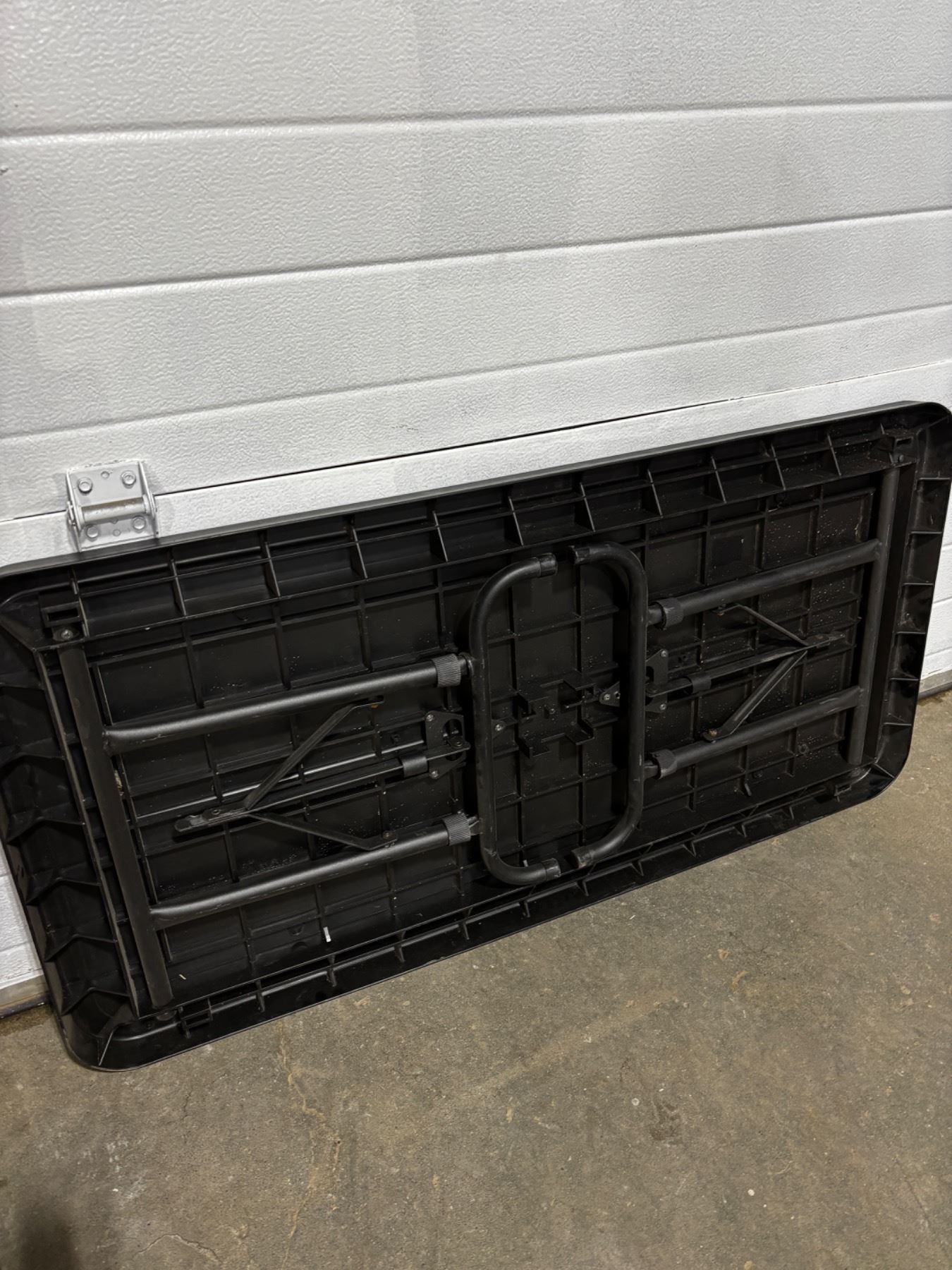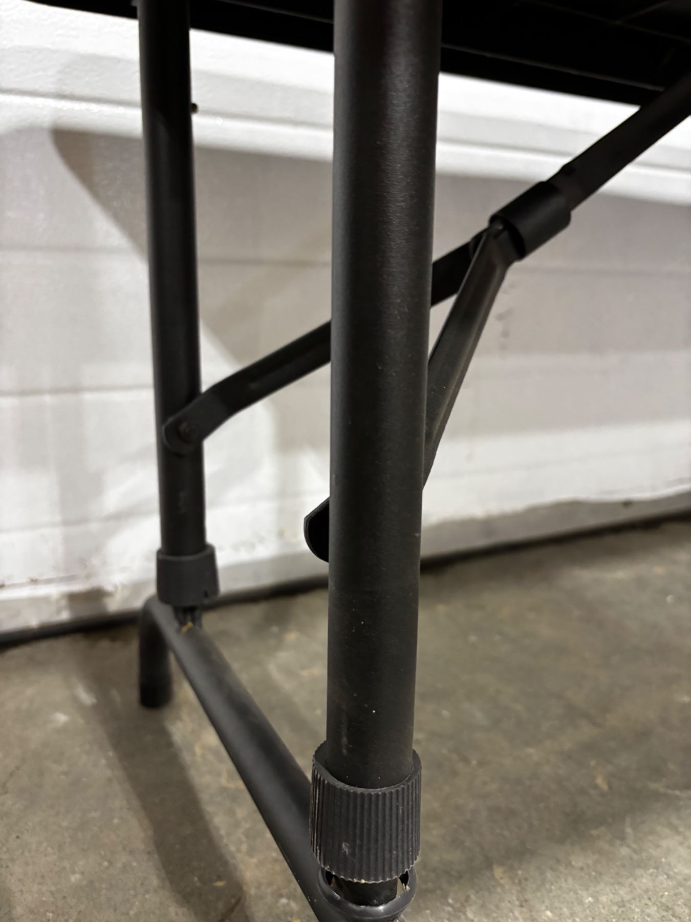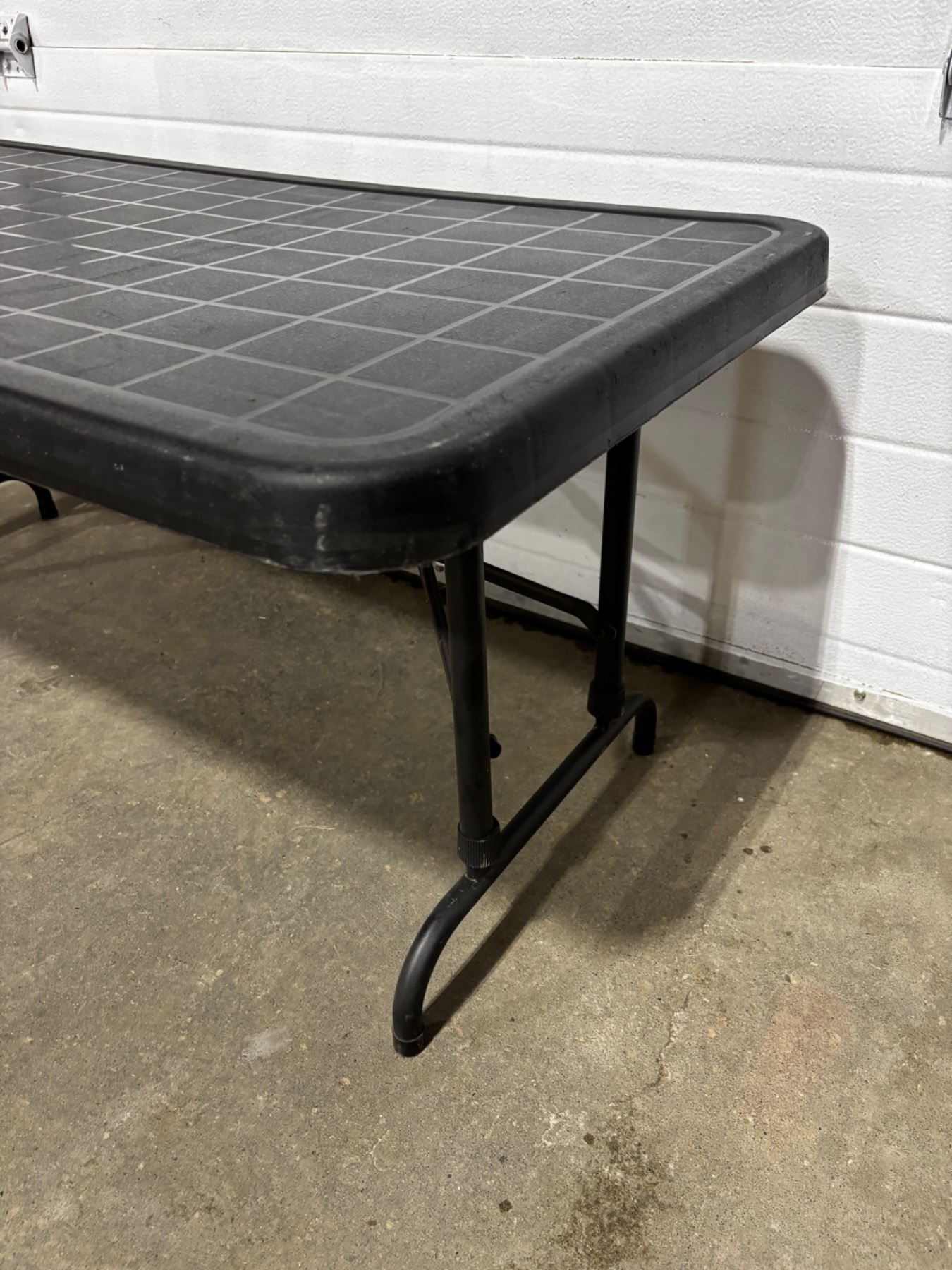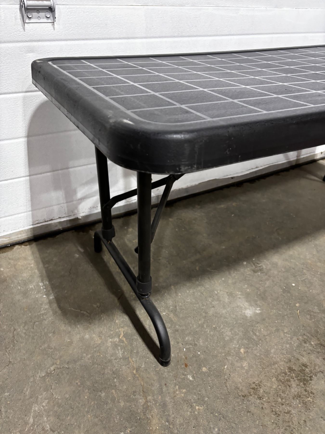 Has some stains and wear, leg height is adjustable, 4'L x 24"W x 21"H