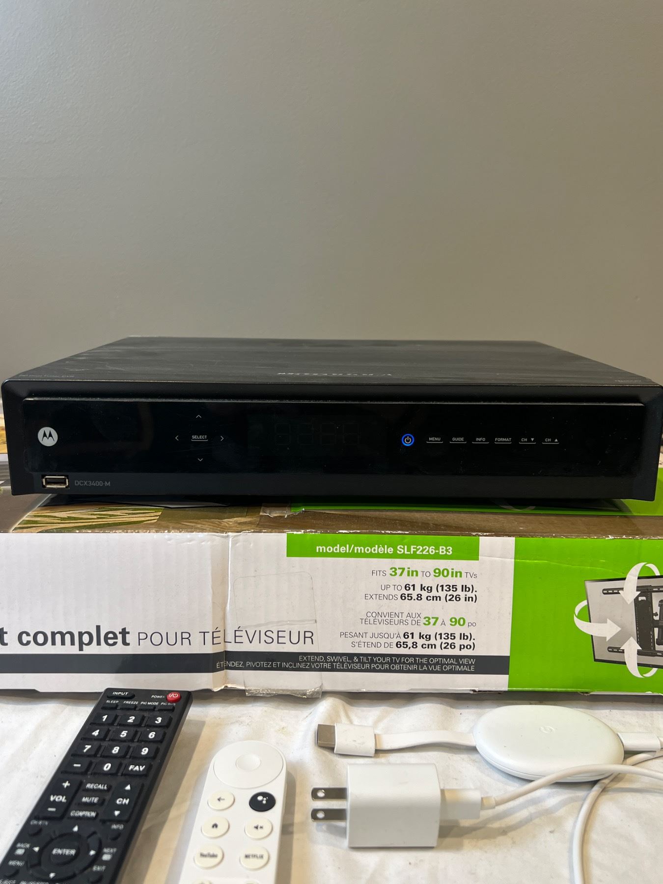 Powers on and works, has working remote as well. DVR powers on. Please be prepared to take off of the hangers on the roof. Model # 49L310U. Includes working chrome cast as well as Sanus wall mount. Unknown if mount has all hardware to mount.