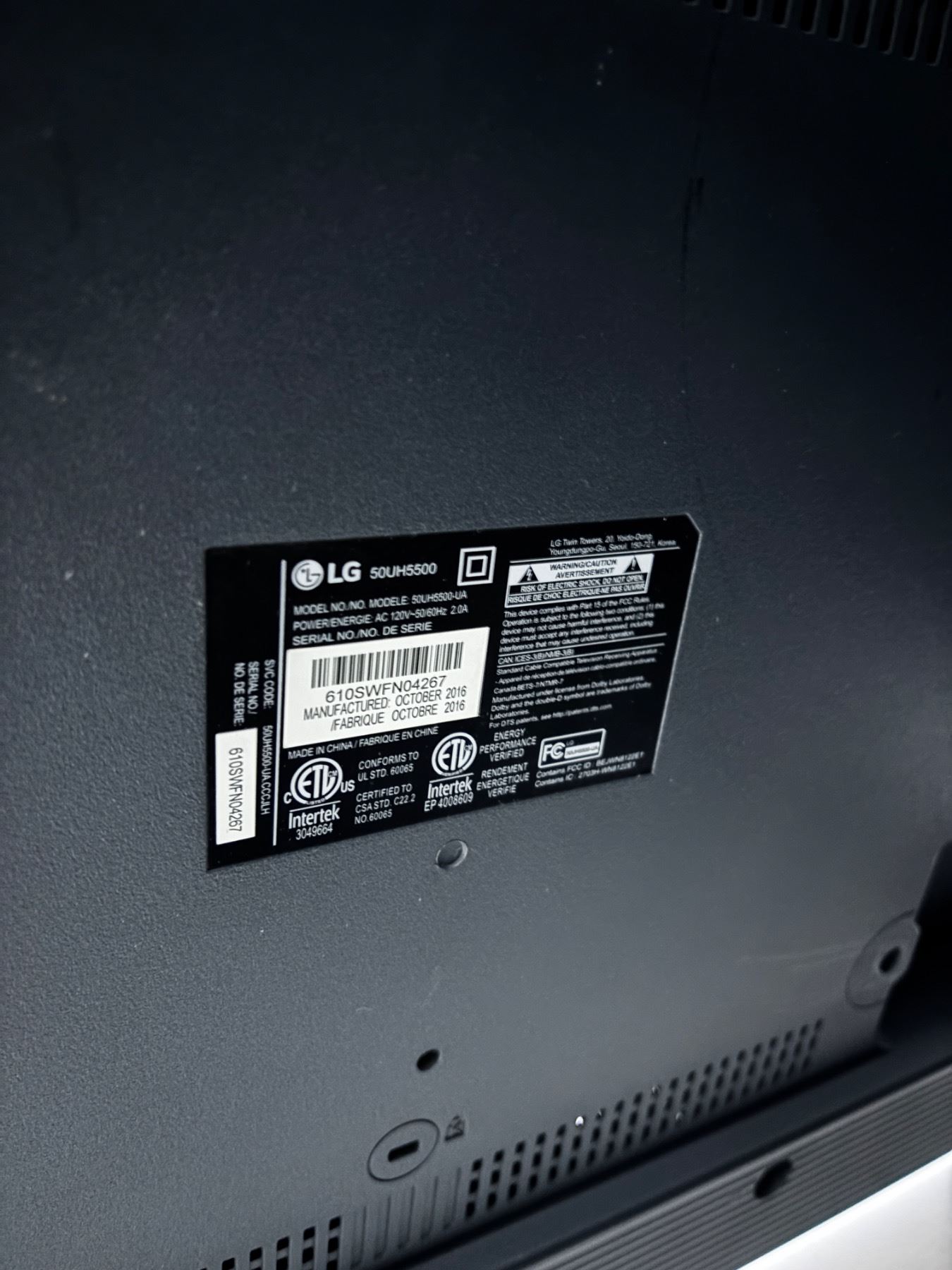 No remote, Turns on, Model No. 50UH5500-UA