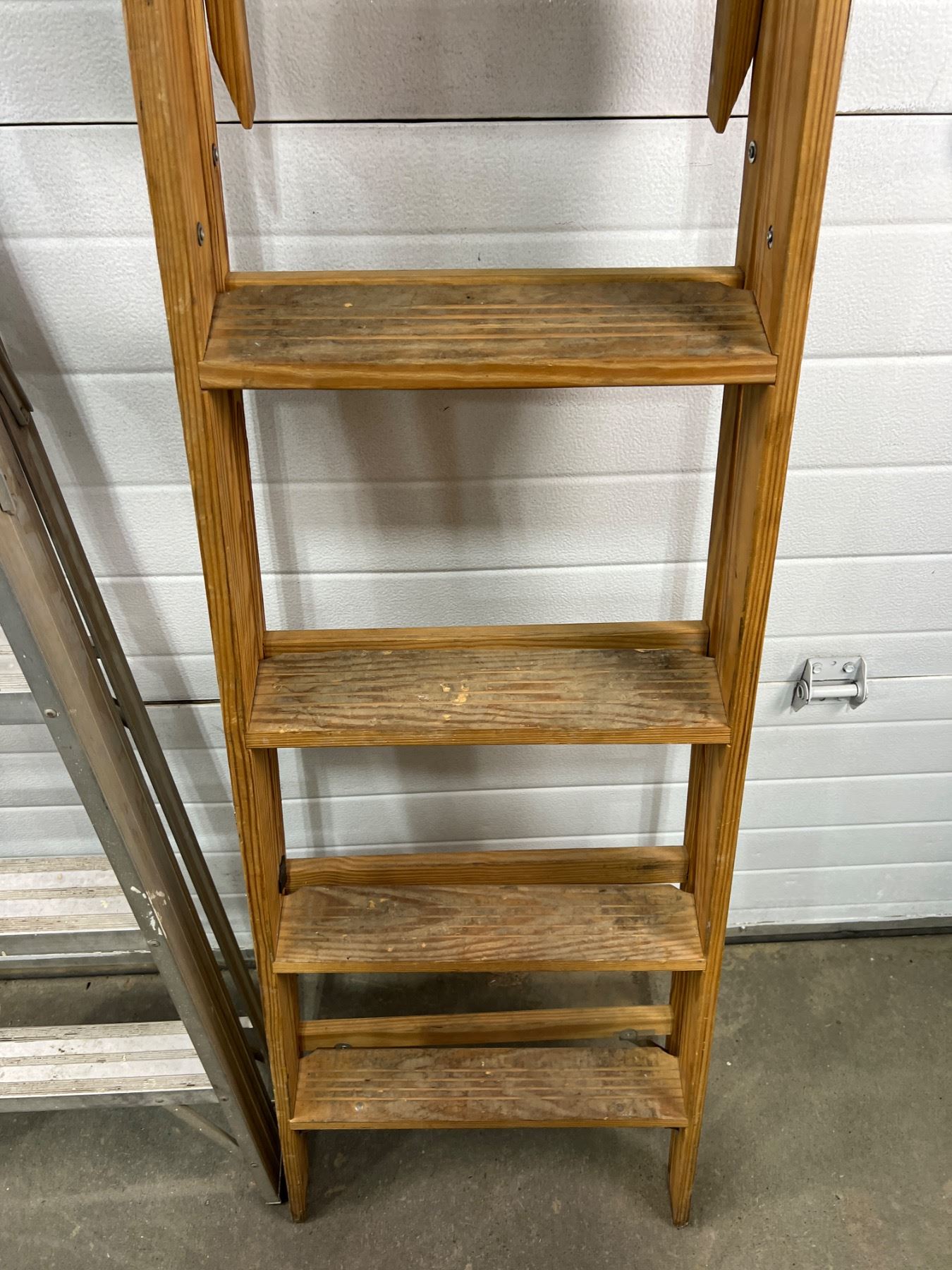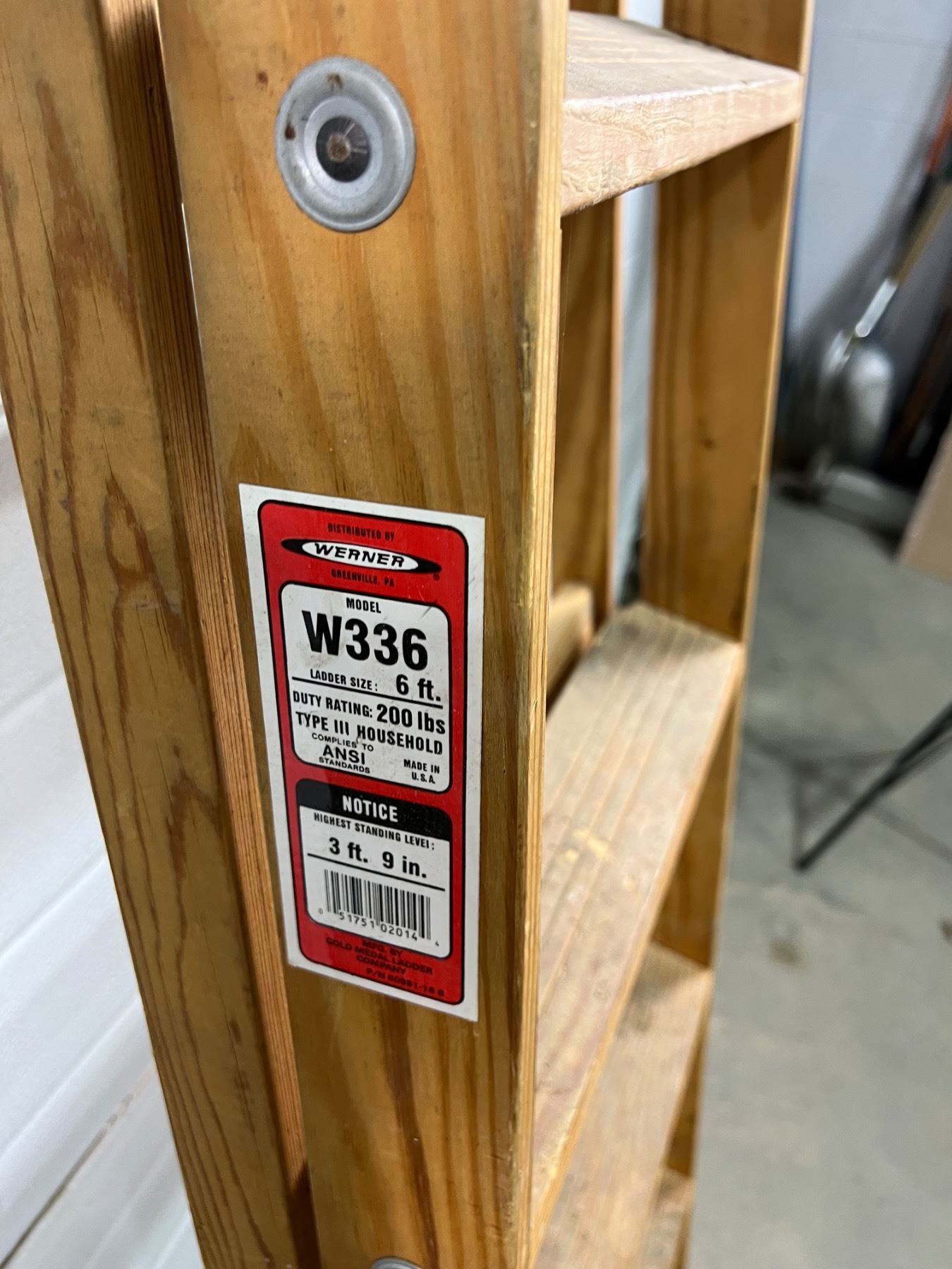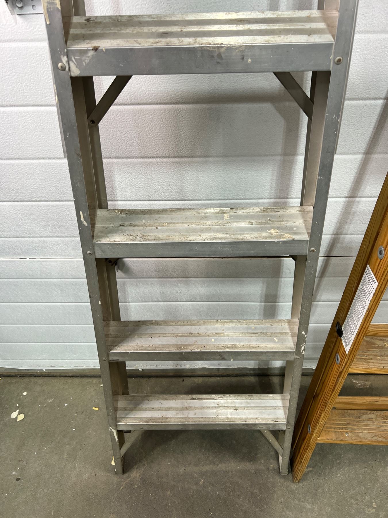 One metal one Werner wood ladder. Metal ladder has some wear and marks on it. Wood ladder has marks to wood.