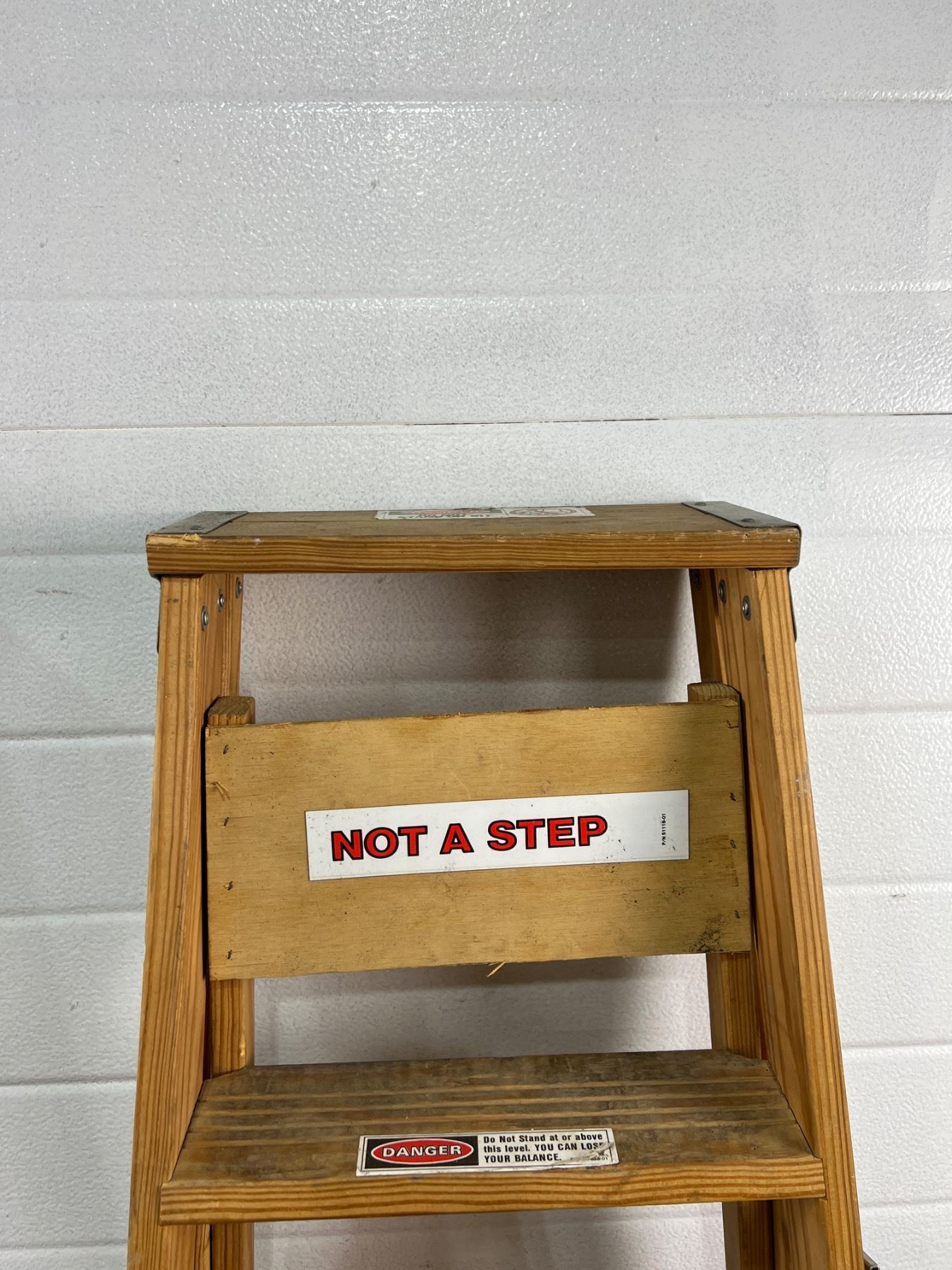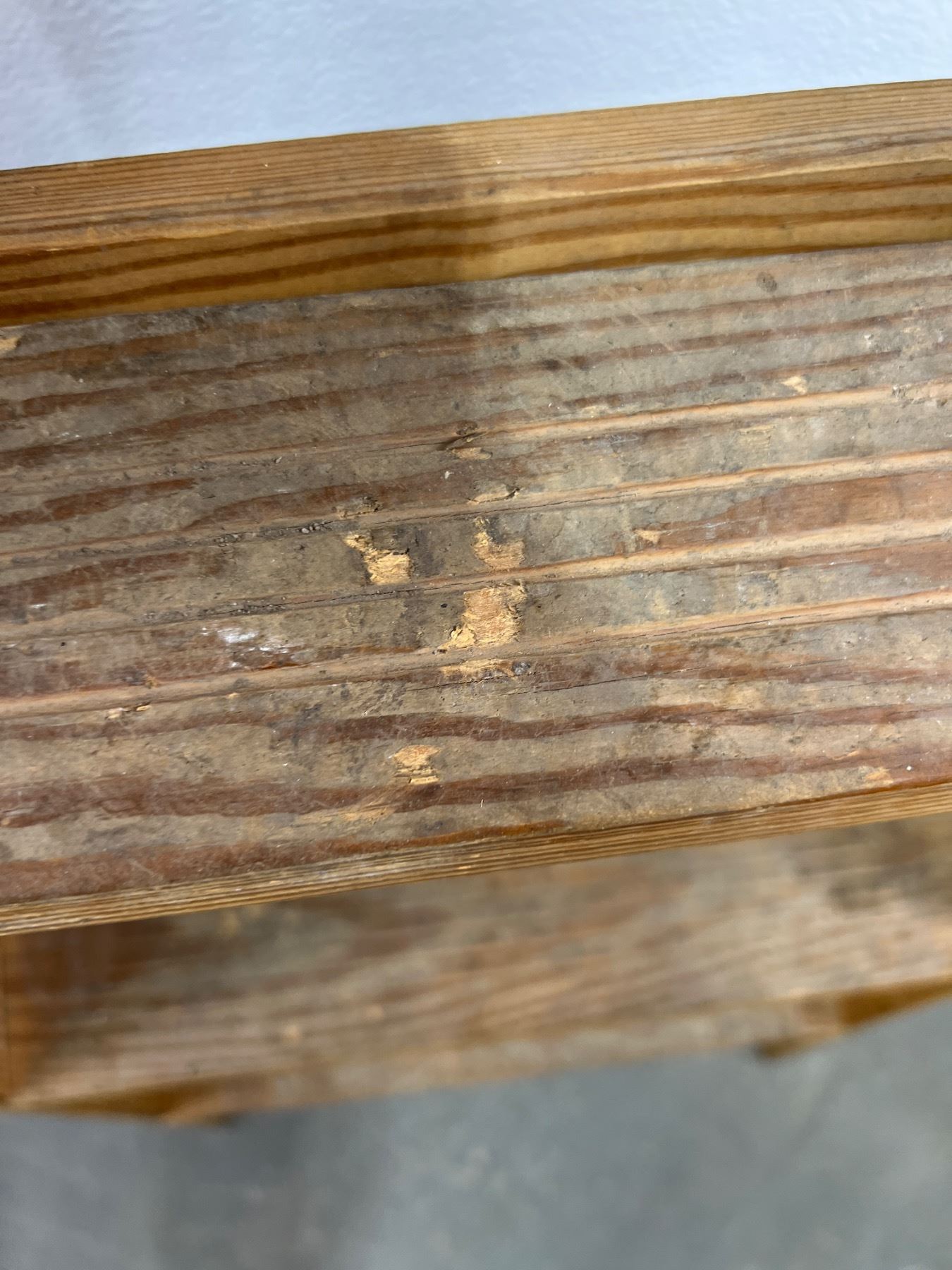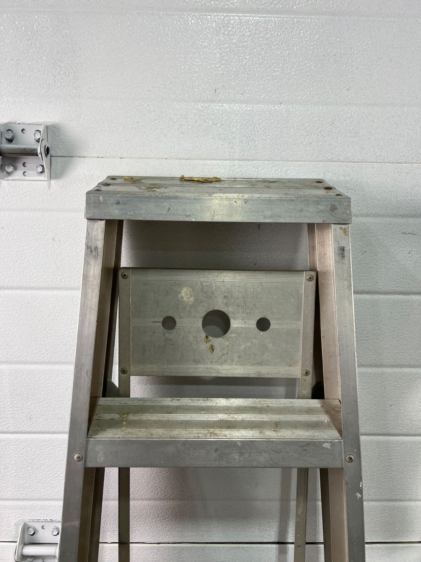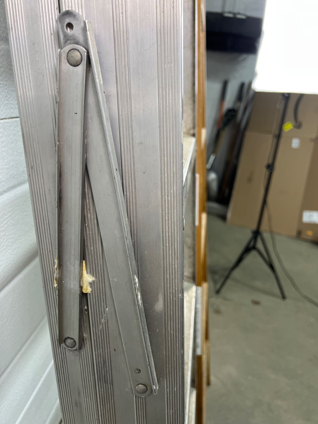 One metal one Werner wood ladder. Metal ladder has some wear and marks on it. Wood ladder has marks to wood.