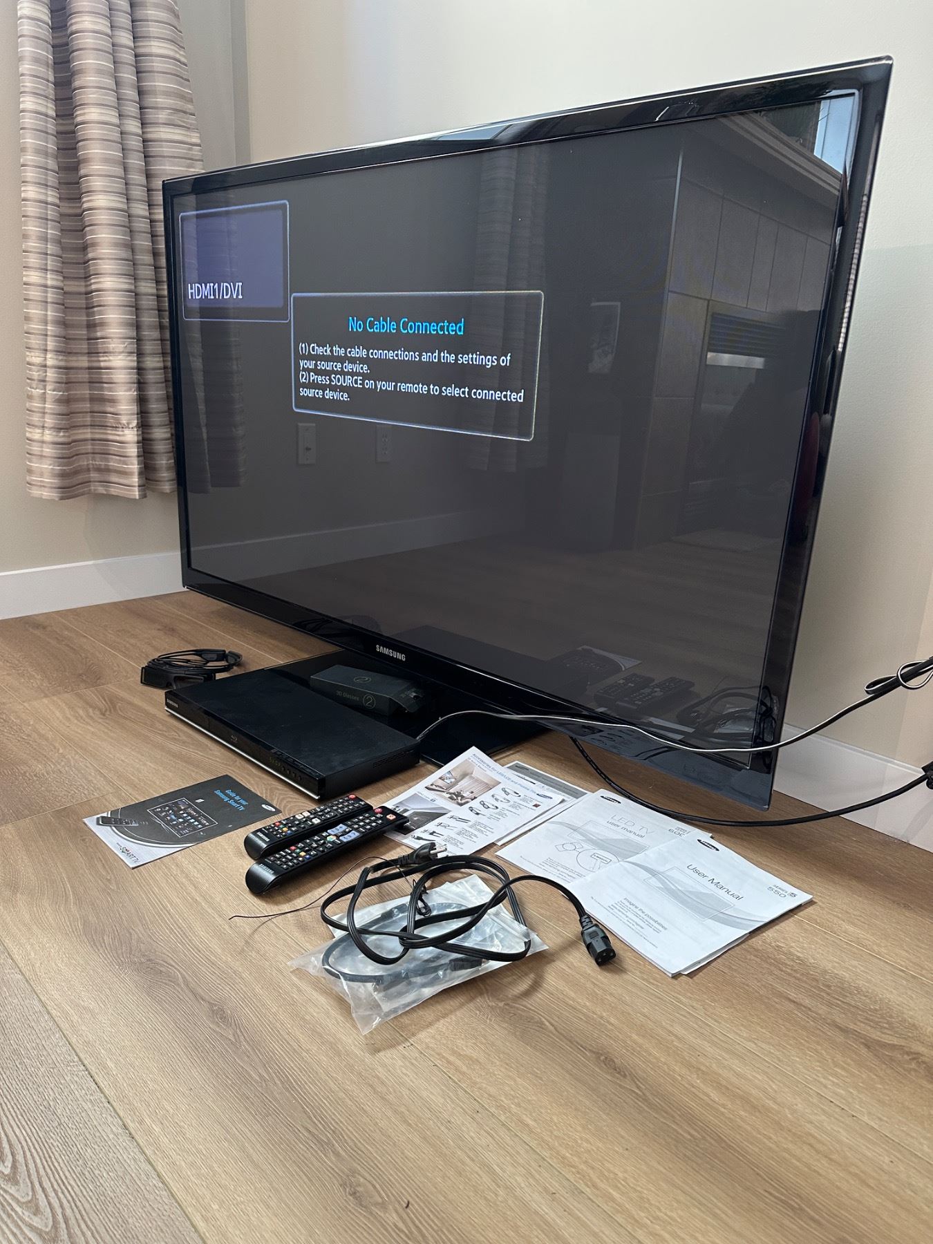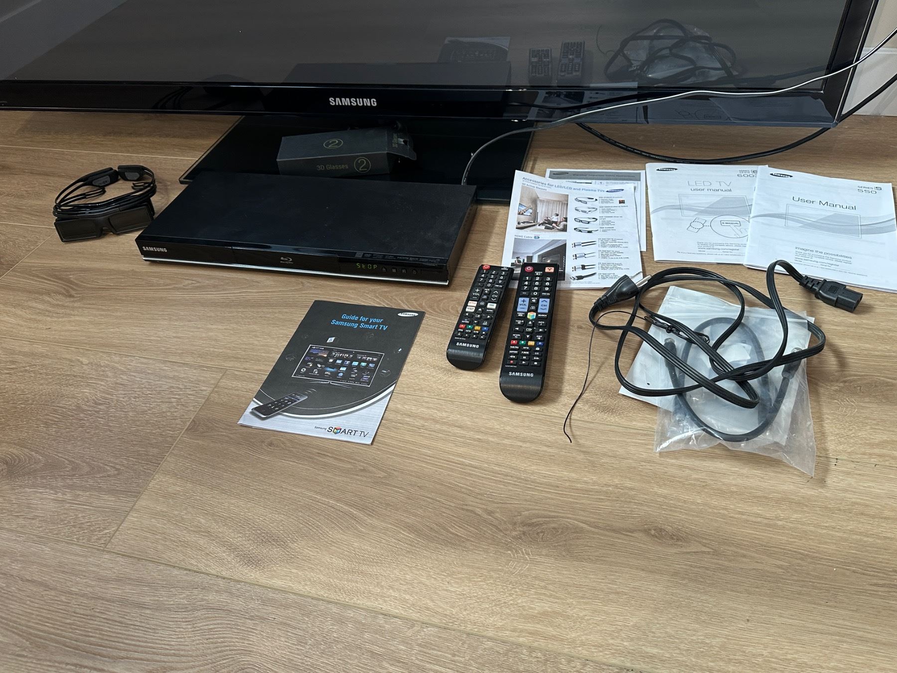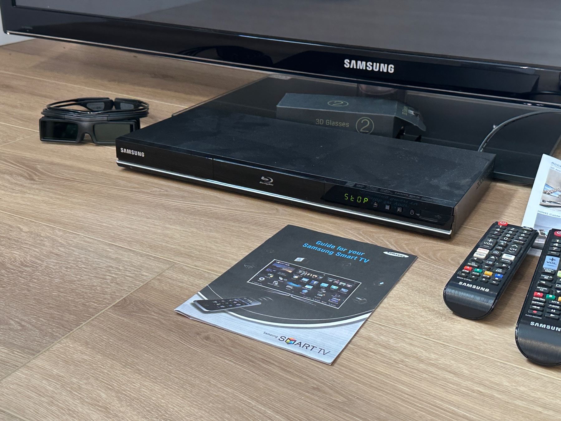 Both turn on - Samsung Smart TV includes 3D glasses, user manual, remote (needs batteries). Blu-ray Disc Player includes remote (needs batteries)