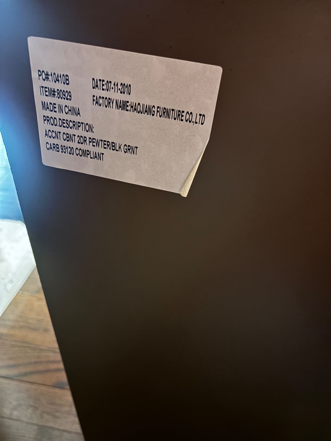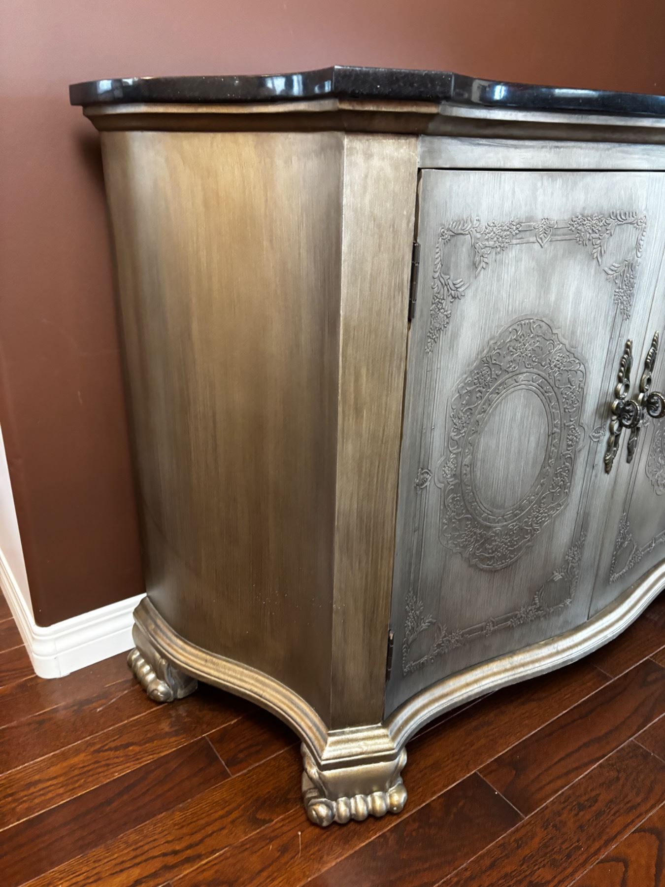 Made by Haojiang Furniture Co. Black Granite countertop. Approximately 41.5" long by 17" wide by 31" tall. Some marks on surface of granite counter, and some wear around feet. Very heavy, please bring help and be careful on the floors.