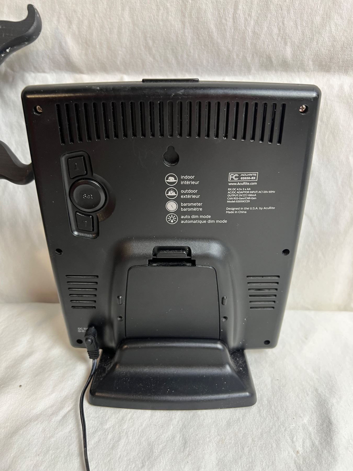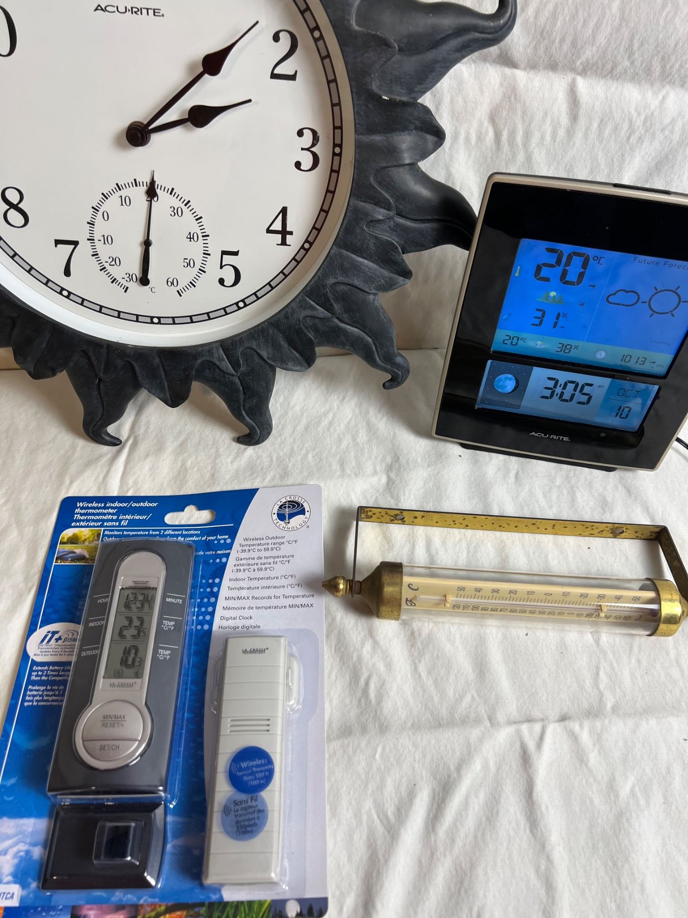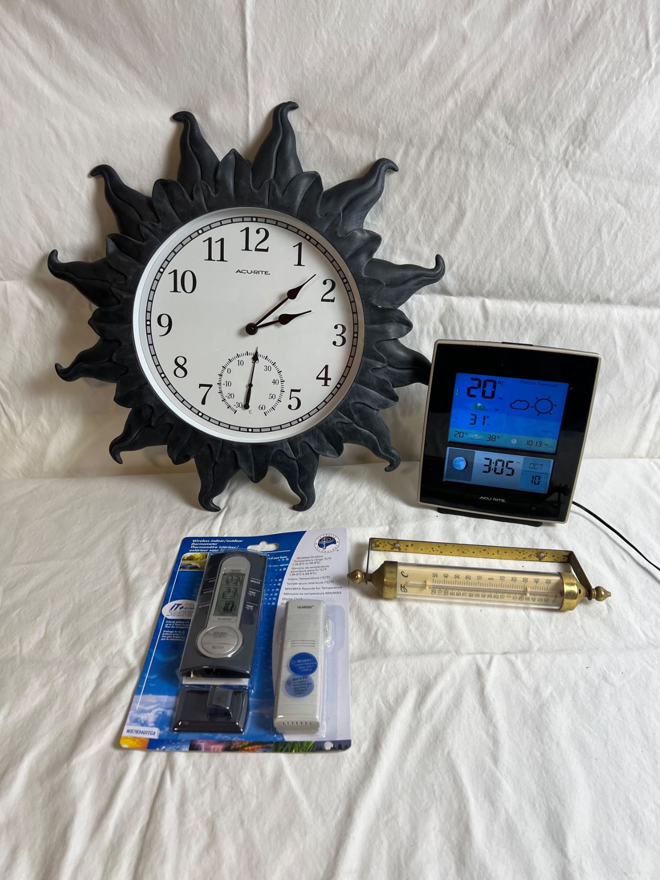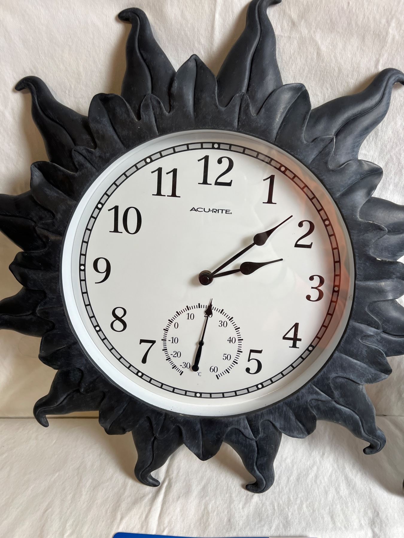Also includes new LaCrosse thermometer and vintage brass thermometer. Clock and display work. Clock is 18" at widest points. Clock was kept outside which is reason for rust on rear.