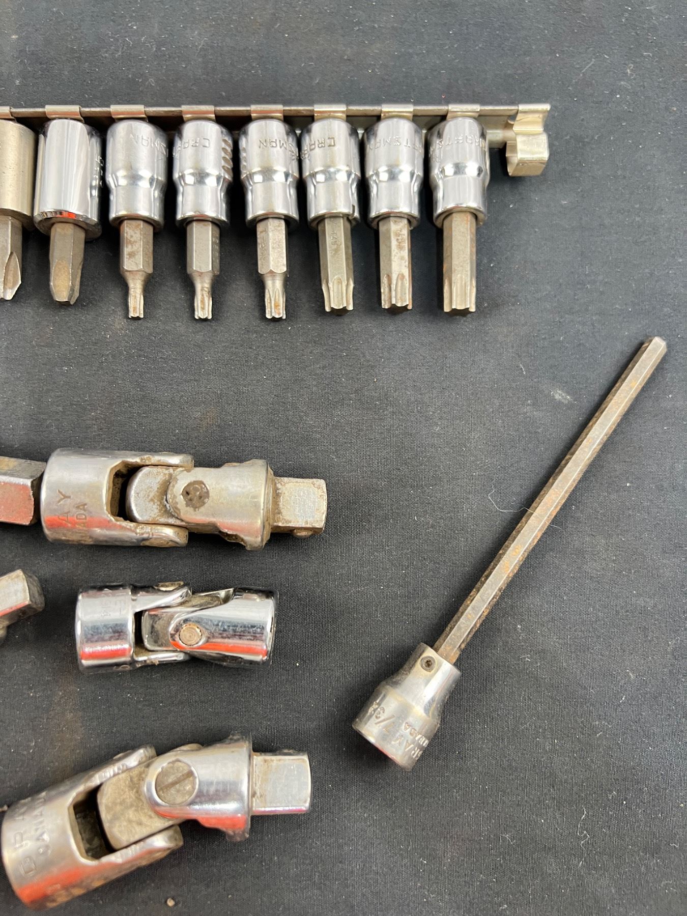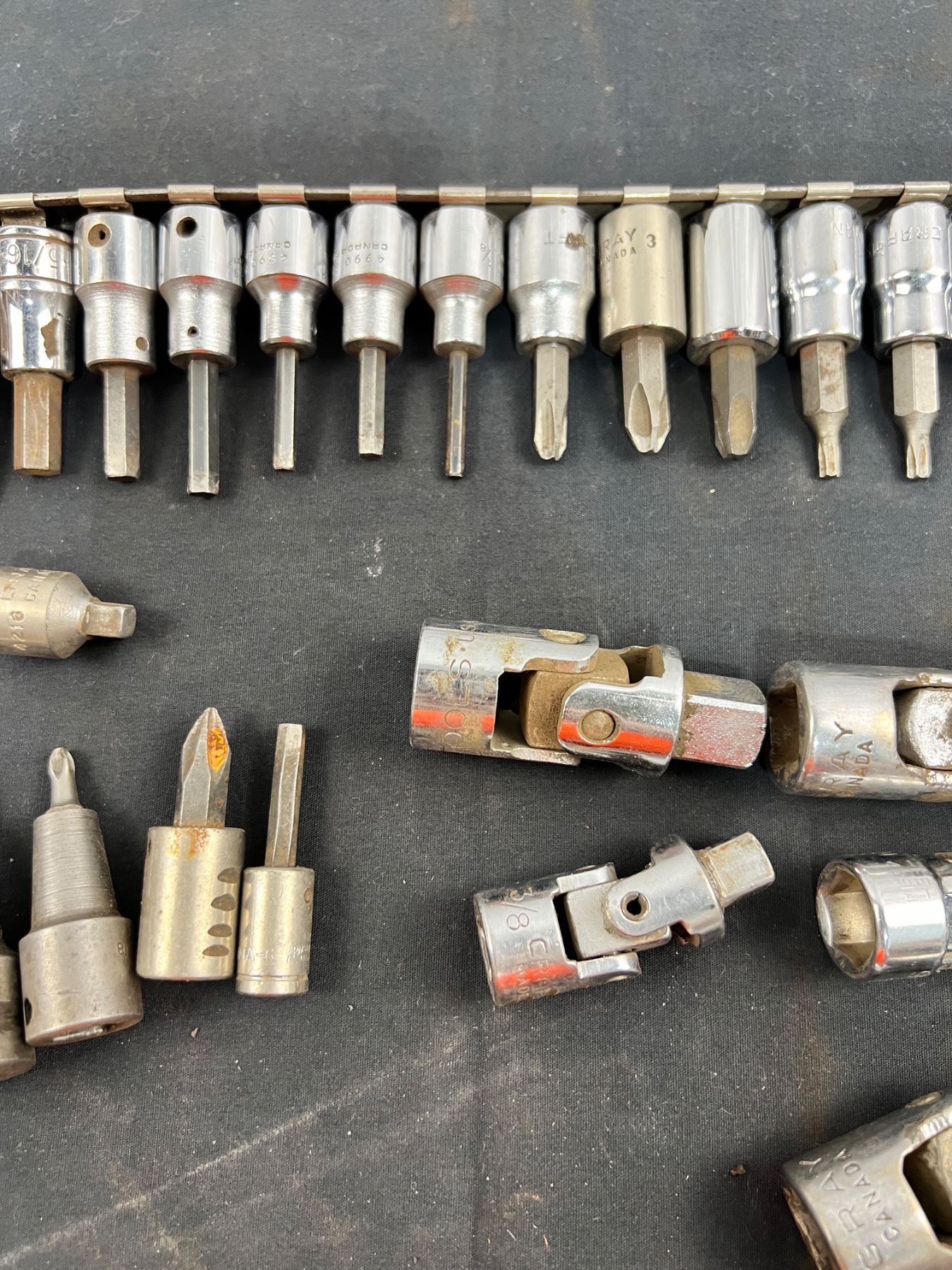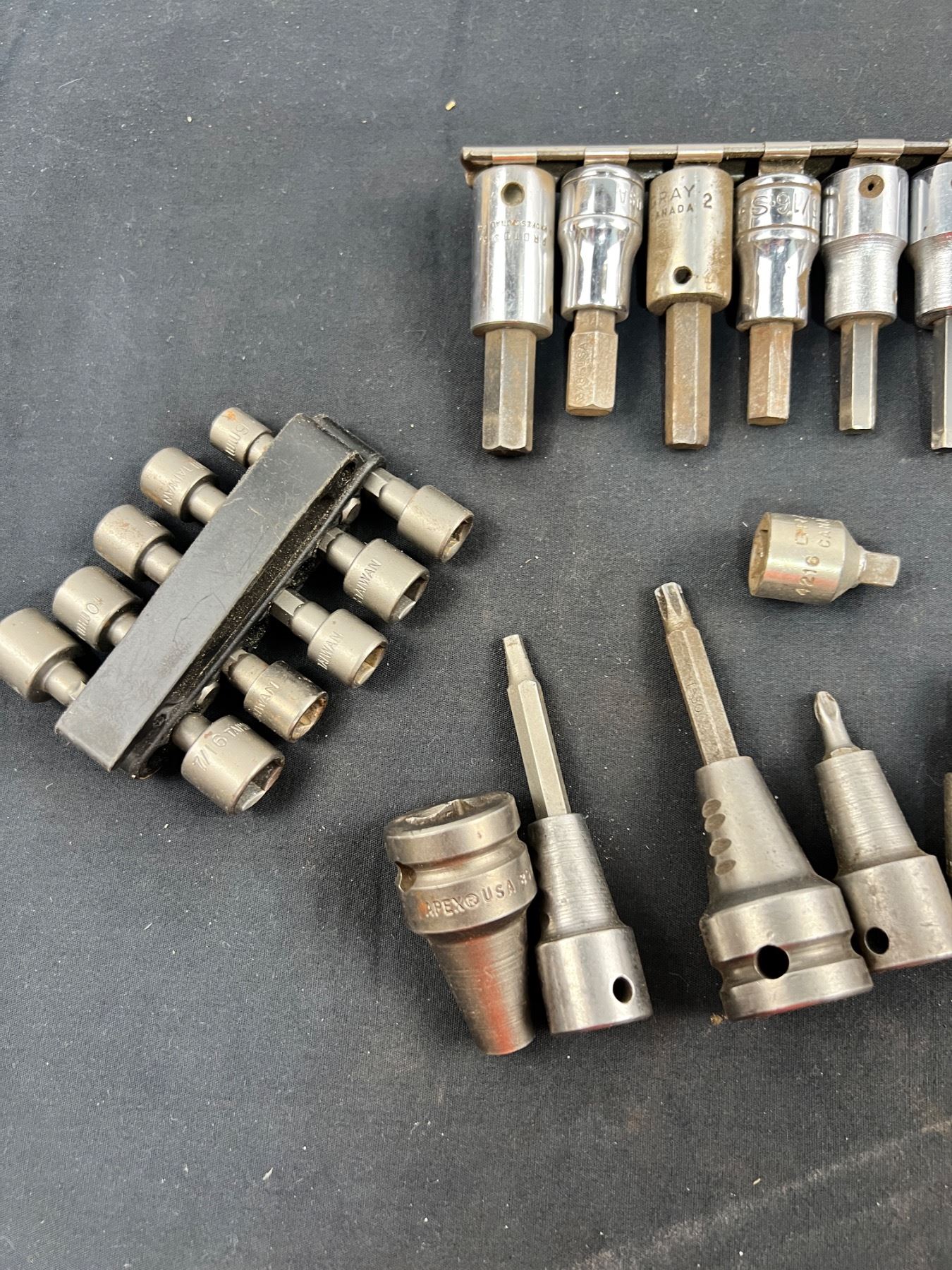 Assortment of flexible neck adapters. Driver set is not complete. Brands include Craftsman, Grey's and Mastercraft.All in varying states of wear.