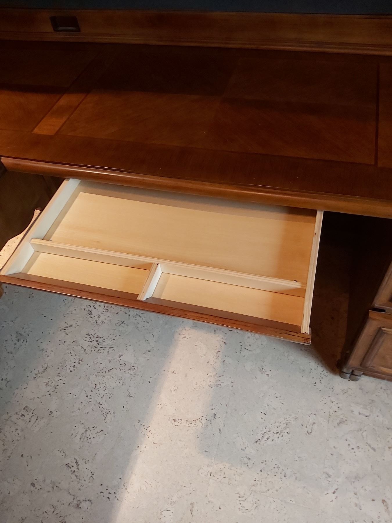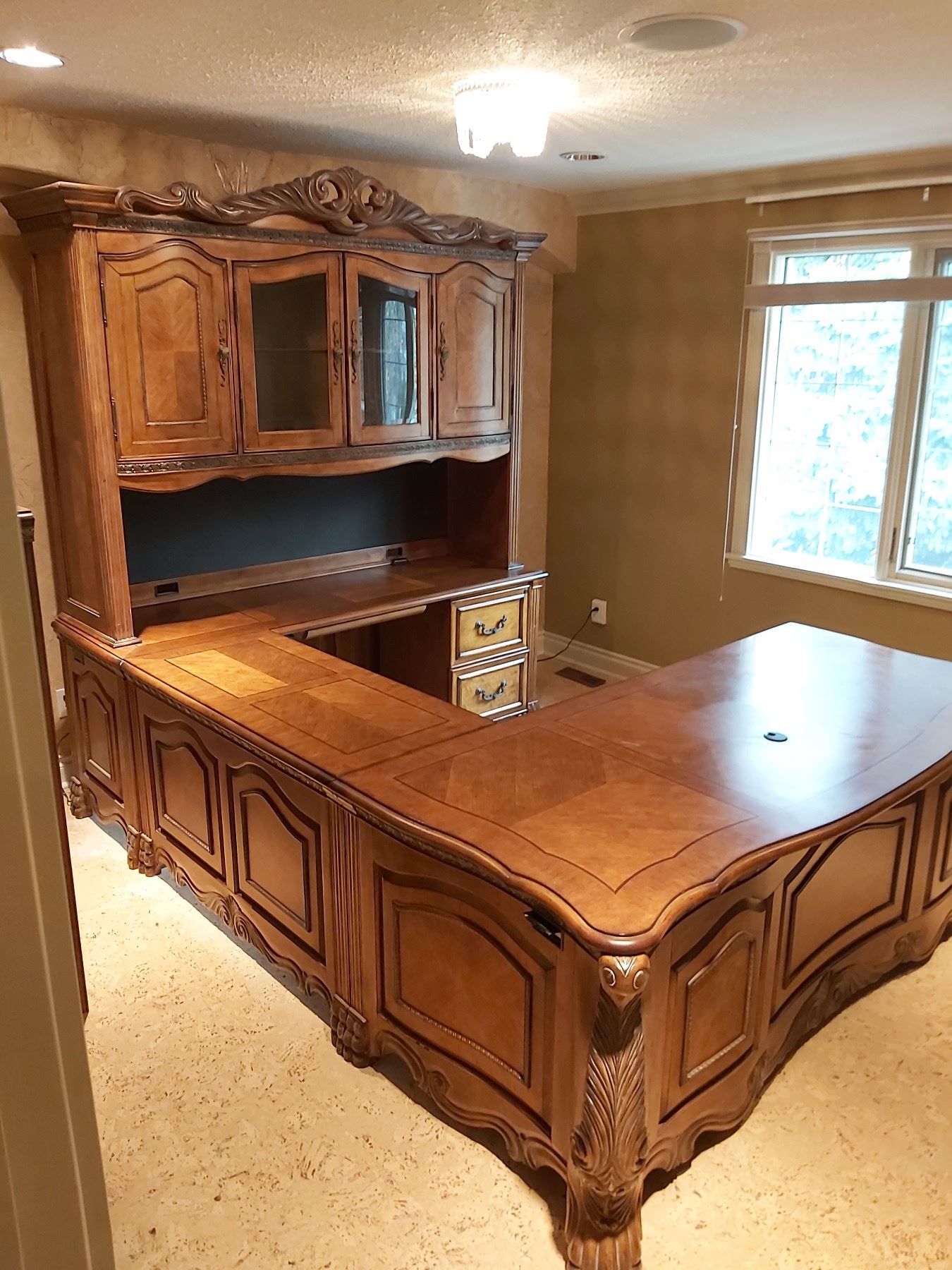 Comes apart into 4 pieces, 81"W x 106"L x 91"H, keyboard drawer is broken, some water stains, includes extra hardware and manuals, filing cabinet drawers have one key, back piece has an interior light, (tools required for disassembly)