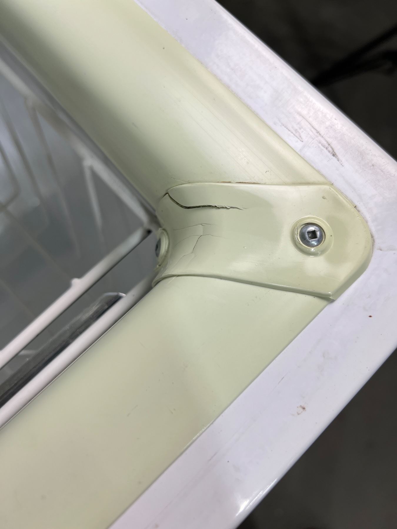 Measures 60"L by 29"D and 41"H. Includes keys, powers on. Some rust and corrosion marks. Hinges squeak. Some damage to plastic.
