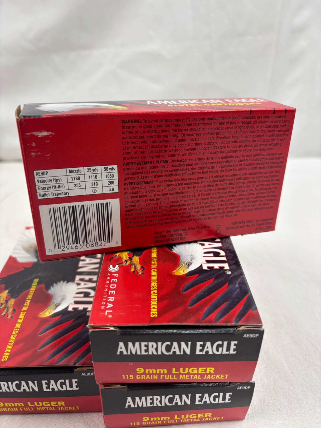 9mm Luger 115 Grain Full Metal Jacket, Includes four new boxes of 50 cartridges each