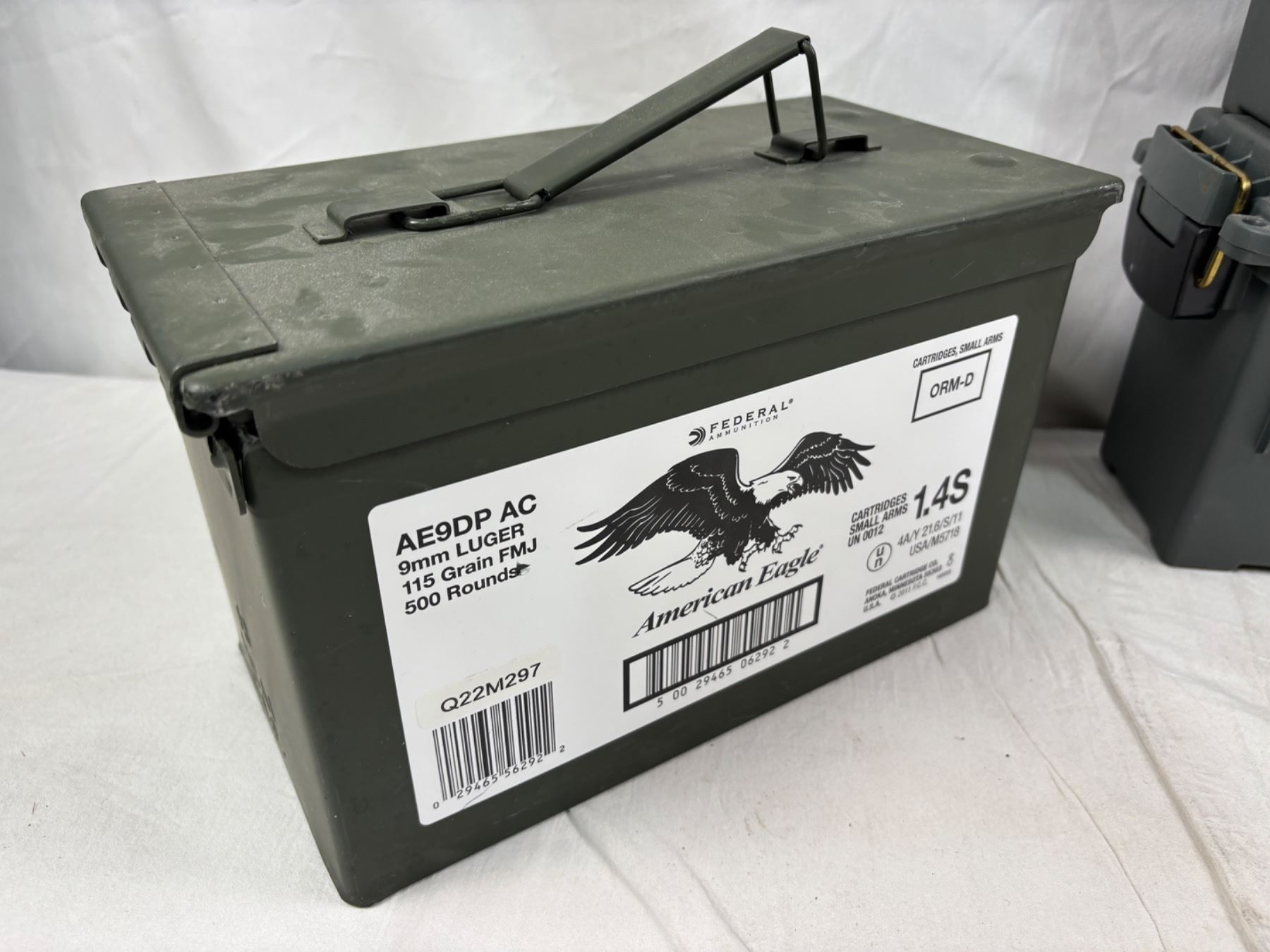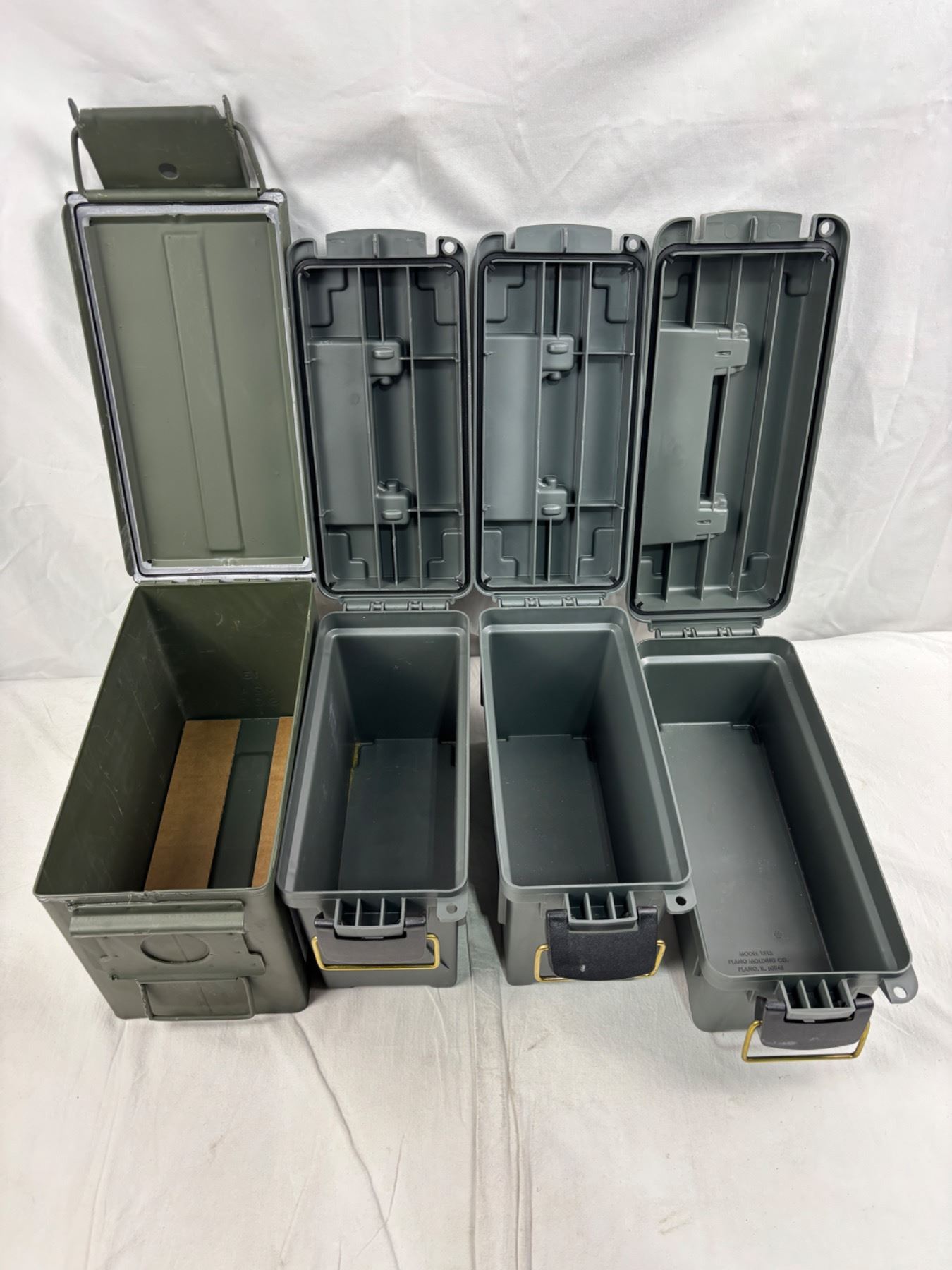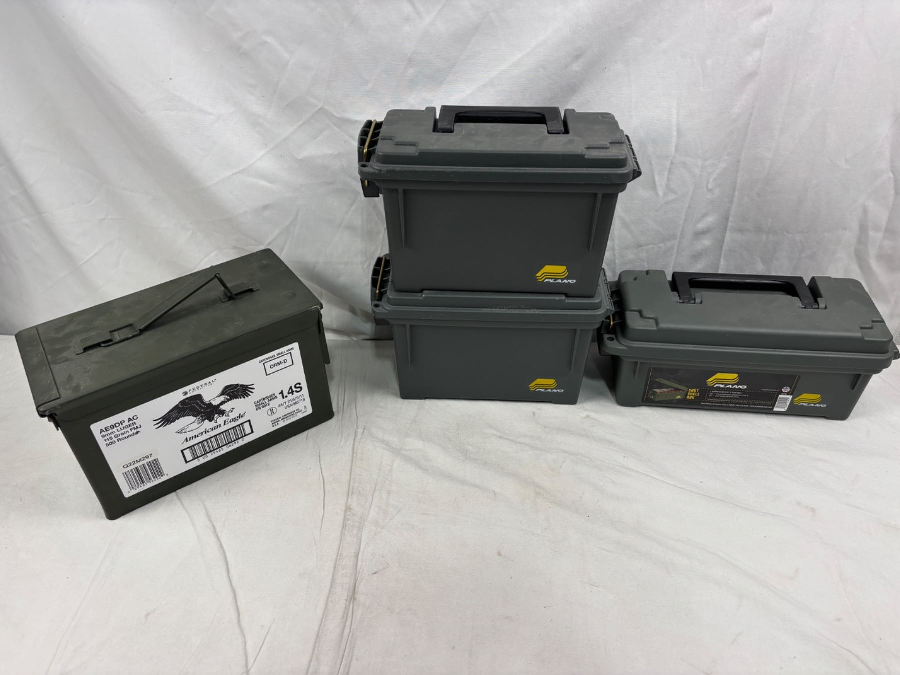Includes empty Metal Federal Ammunition box (12"L x 6"W x 7"H), Three Plastic Plano boxes (Lg: 11"x7"x5", Sm: 13"x5.5"x6")