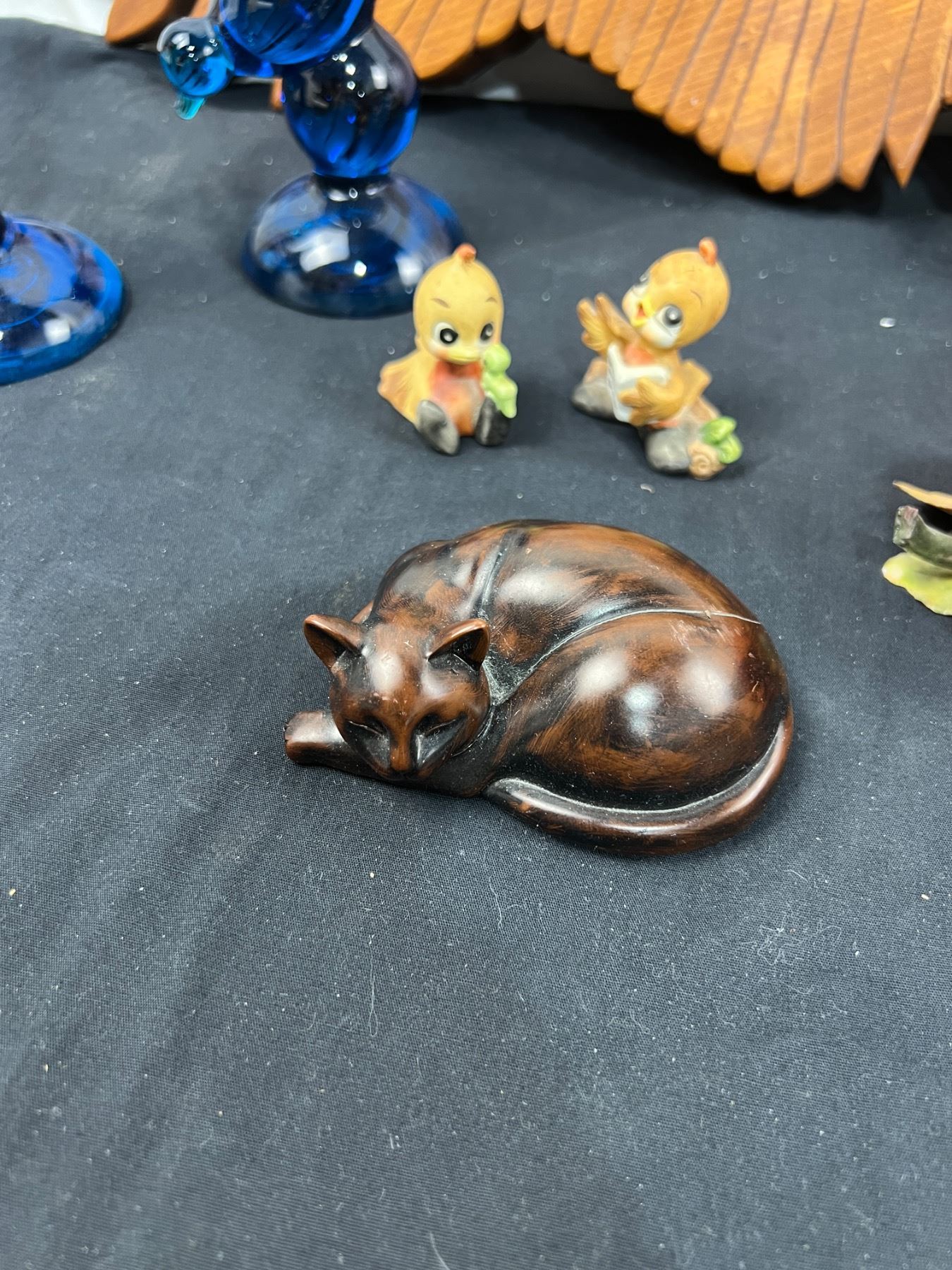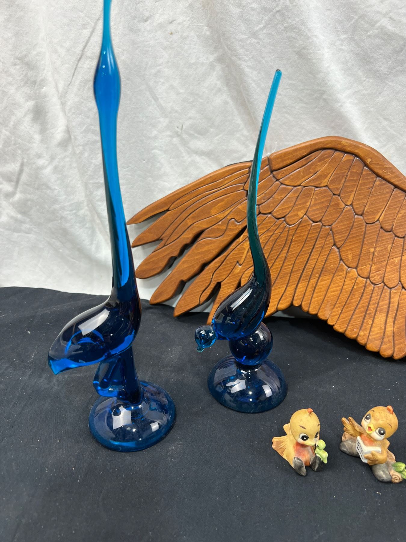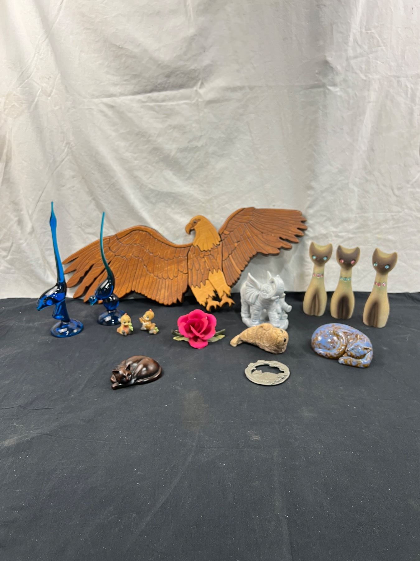 Includes, Wooden bird carving 23"L x 9"W, ceramic and glass figures, Birks China rose (has some chips), and more