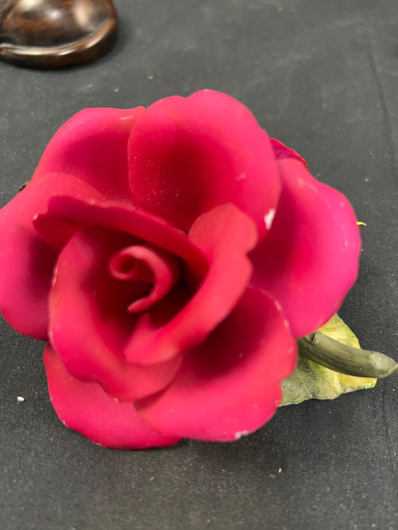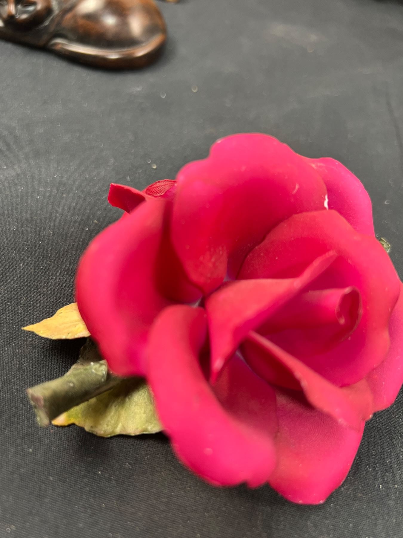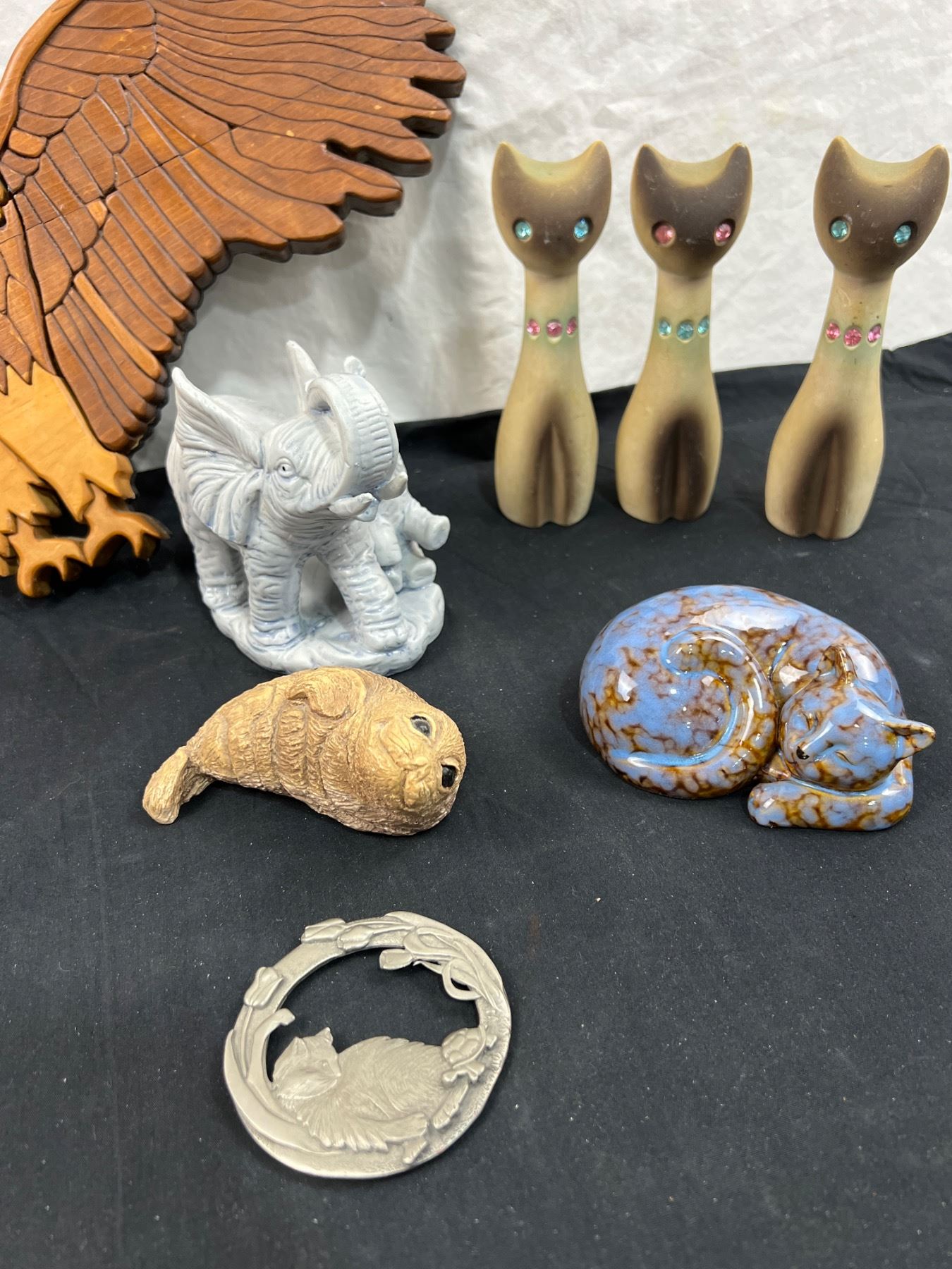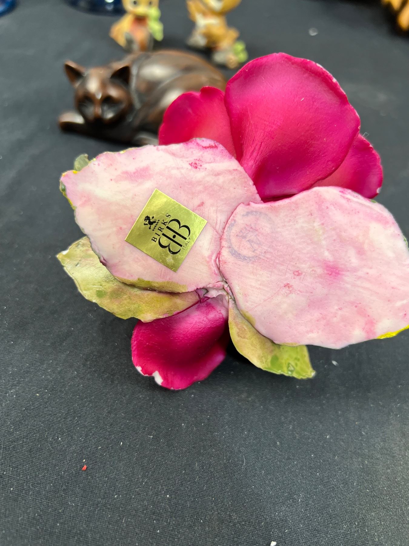 Includes, Wooden bird carving 23"L x 9"W, ceramic and glass figures, Birks China rose (has some chips), and more