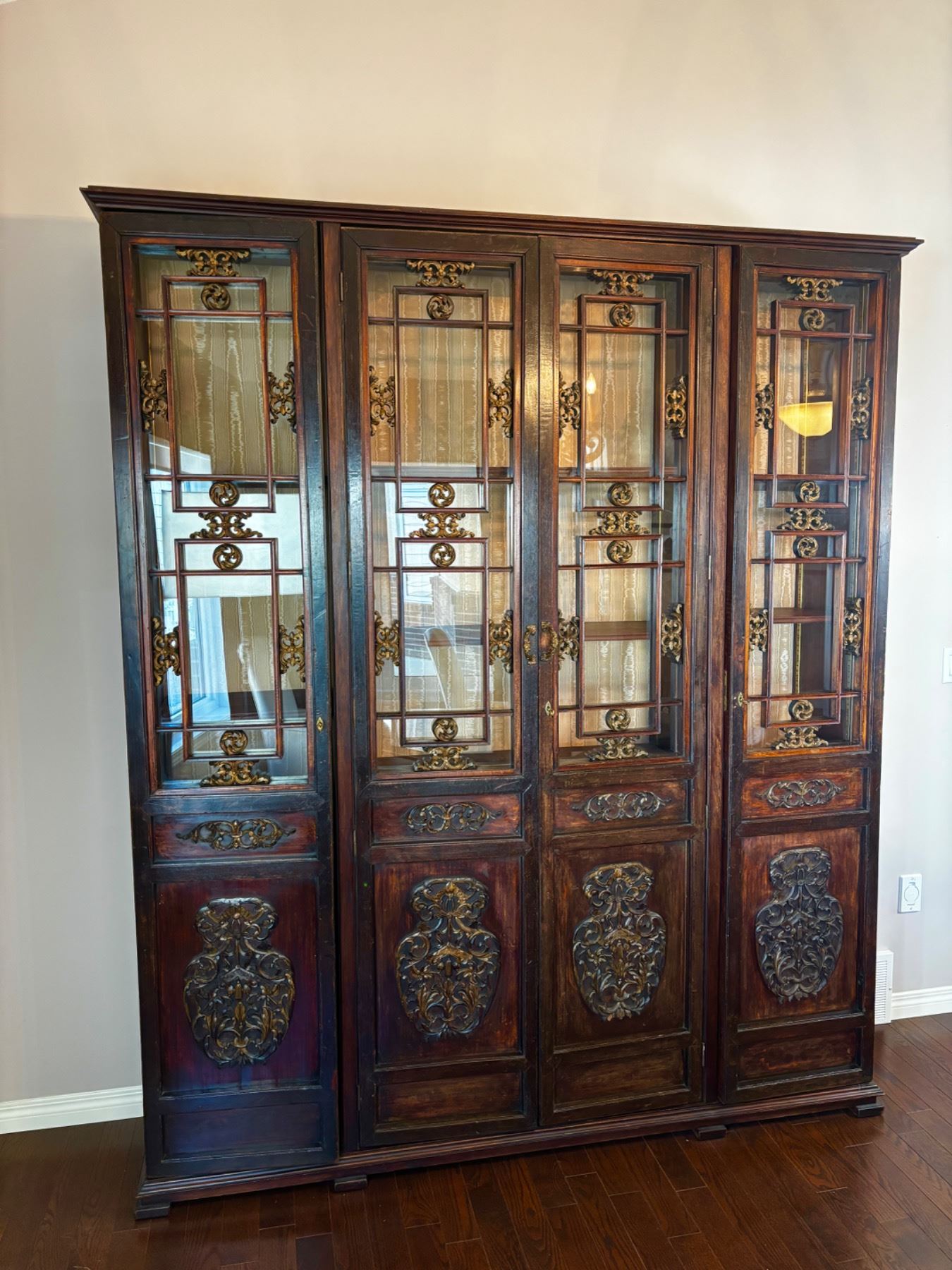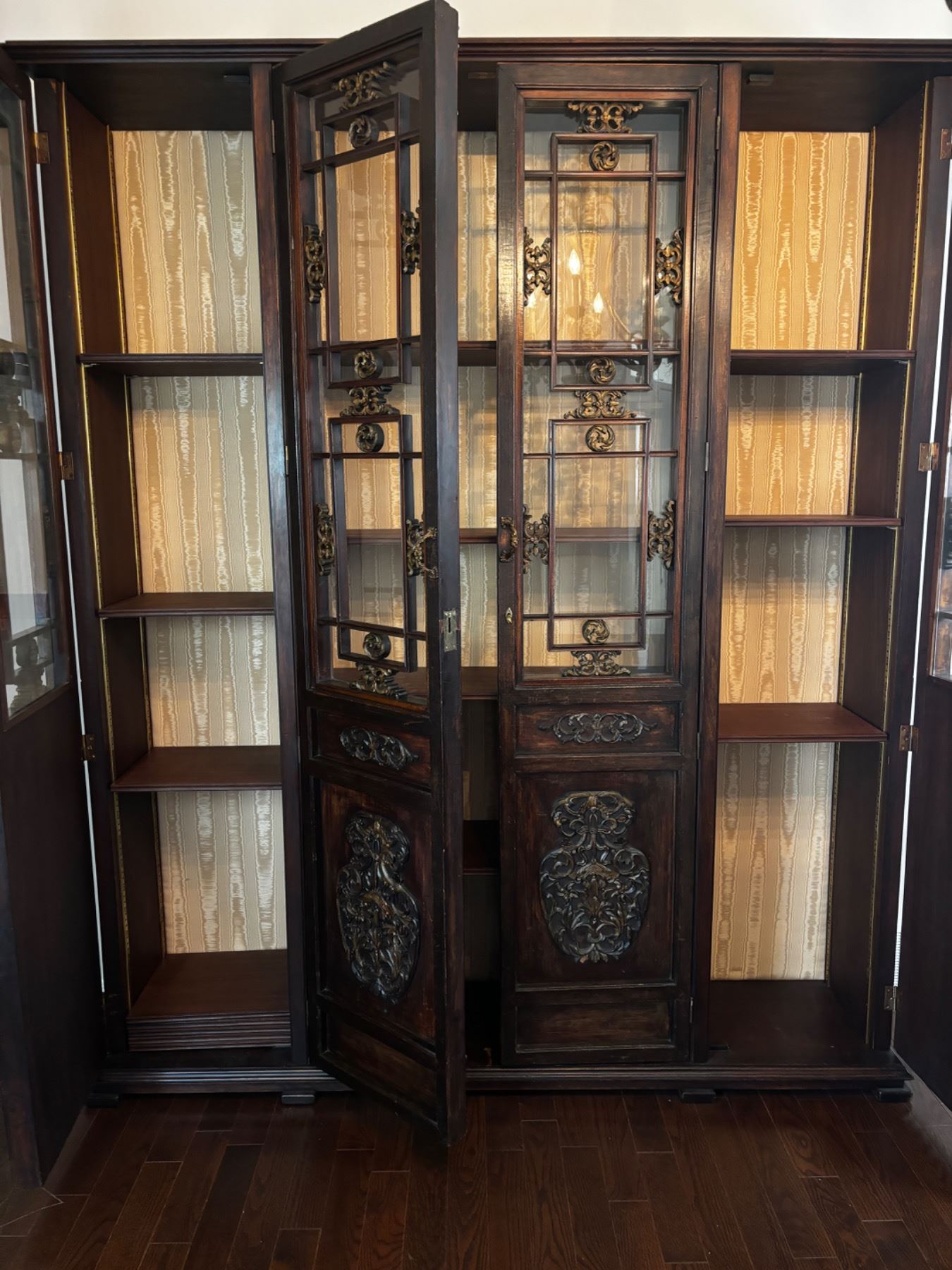 The cabinet has a locking mechanism for each of the three doors, comes with spare shelfs that are adjustable,