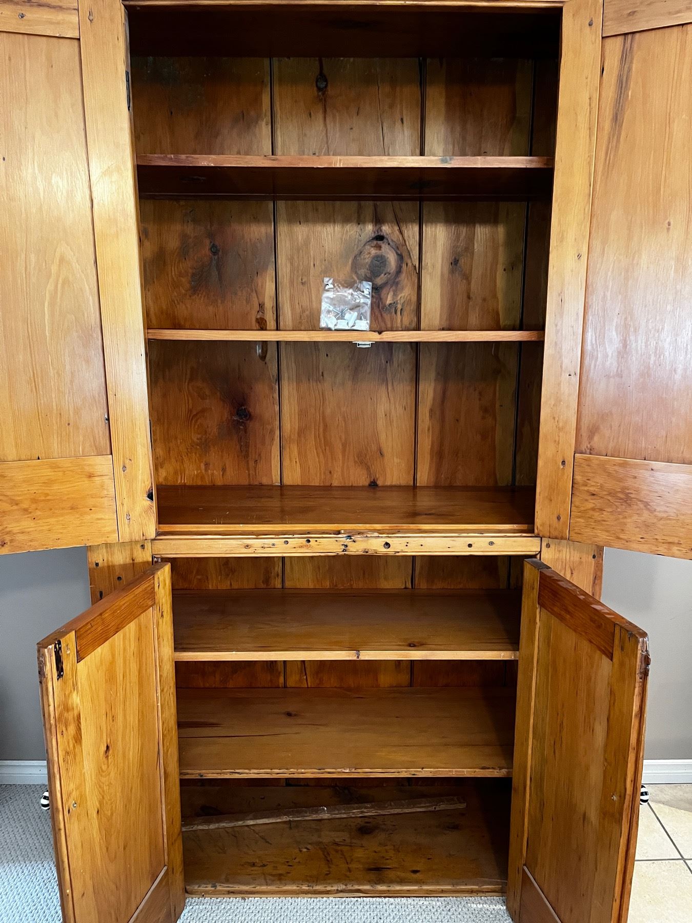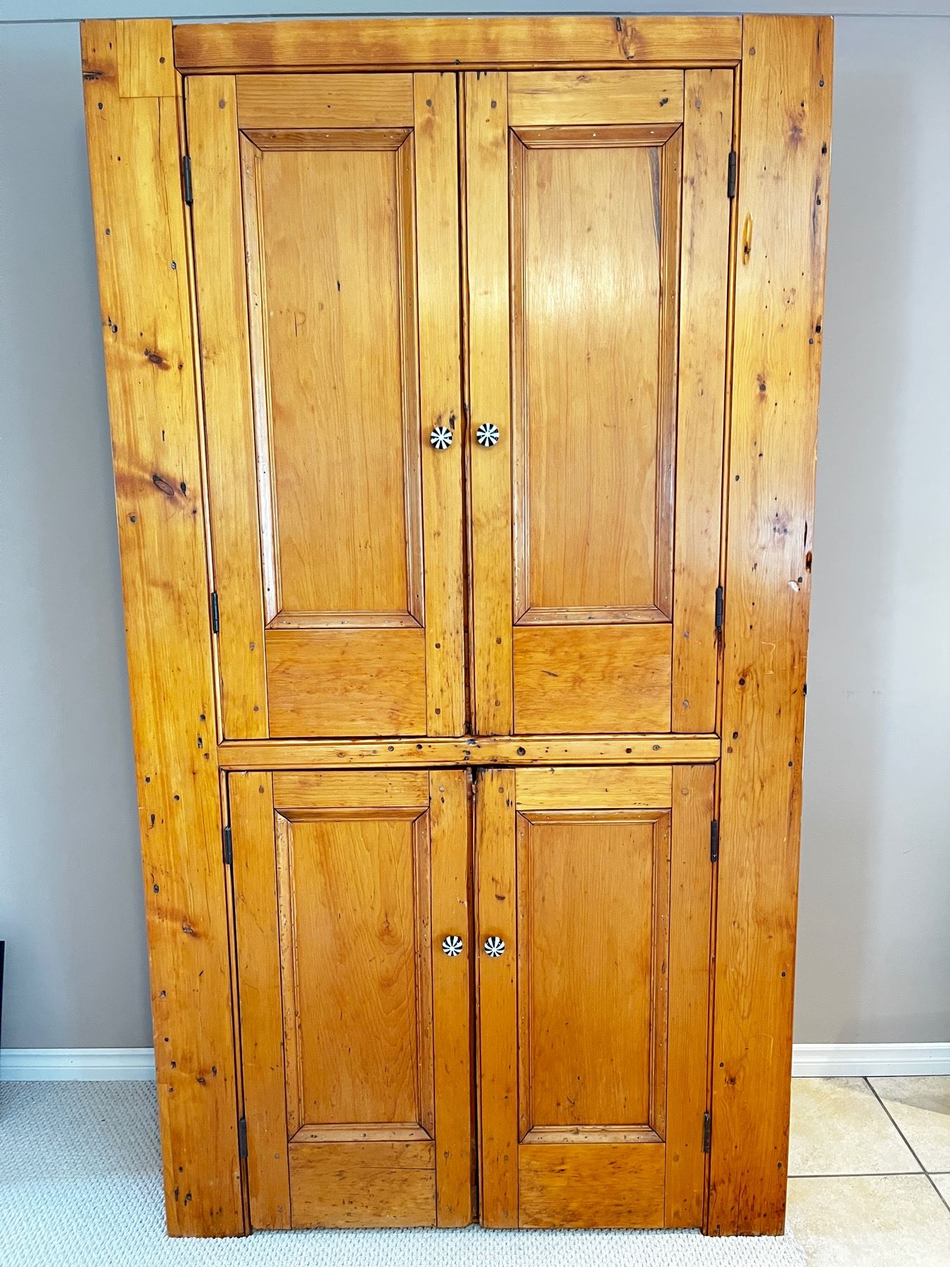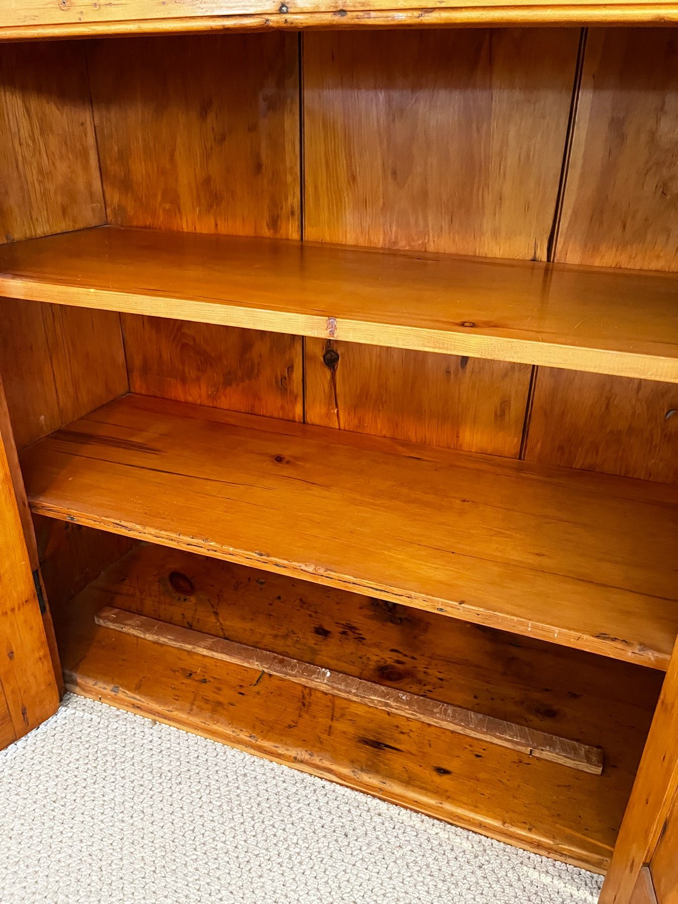 7' tall x 46 1/2" long x 18" wide - 1 1/4 inch solid pine with decorative porcelain knobs - forged fasteners - four doors and six interior shelves - semi-glaze clear finish
