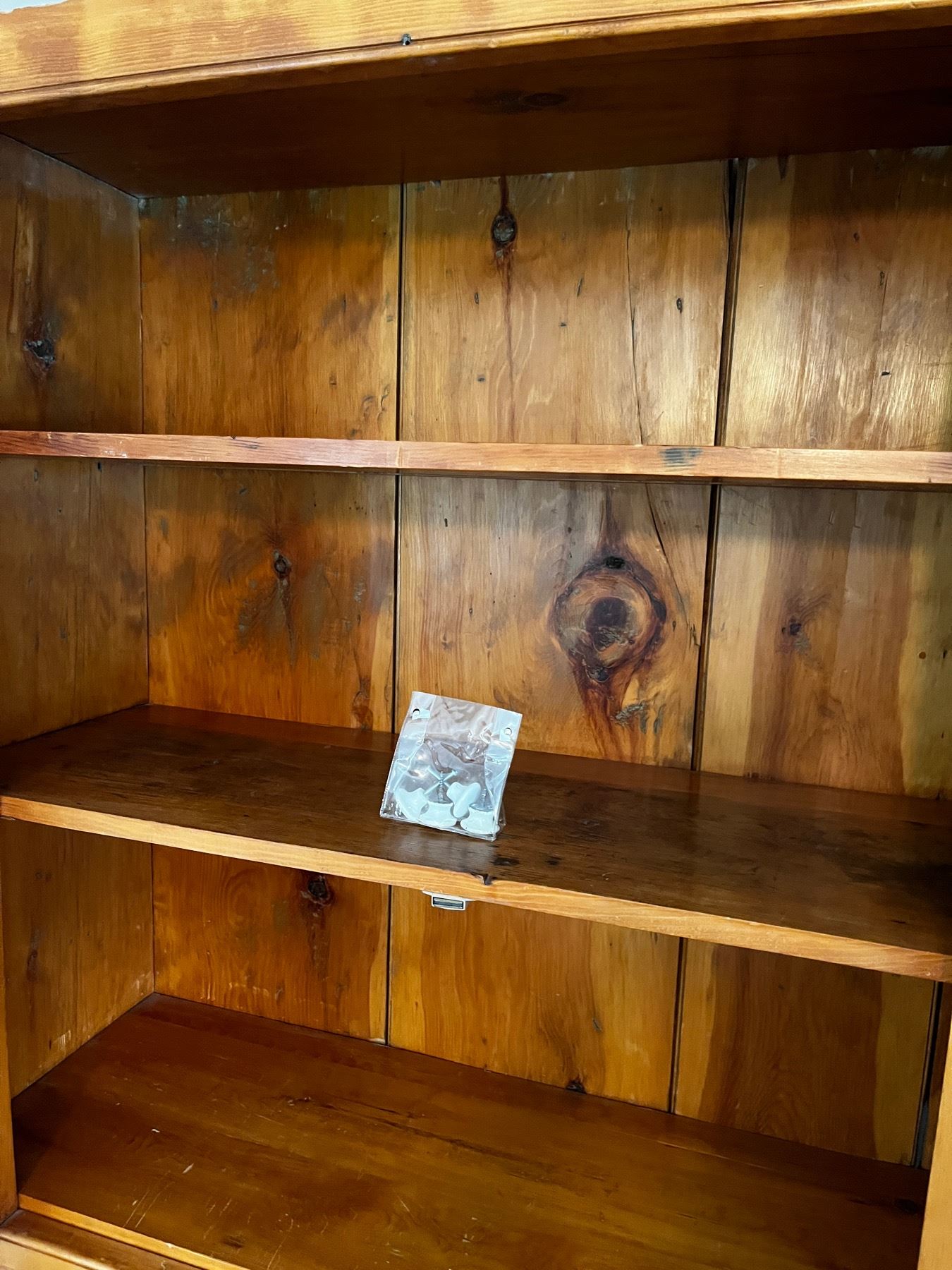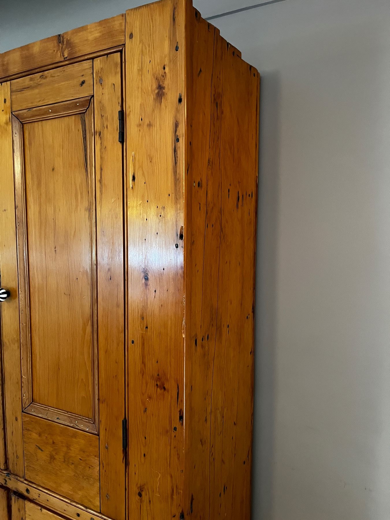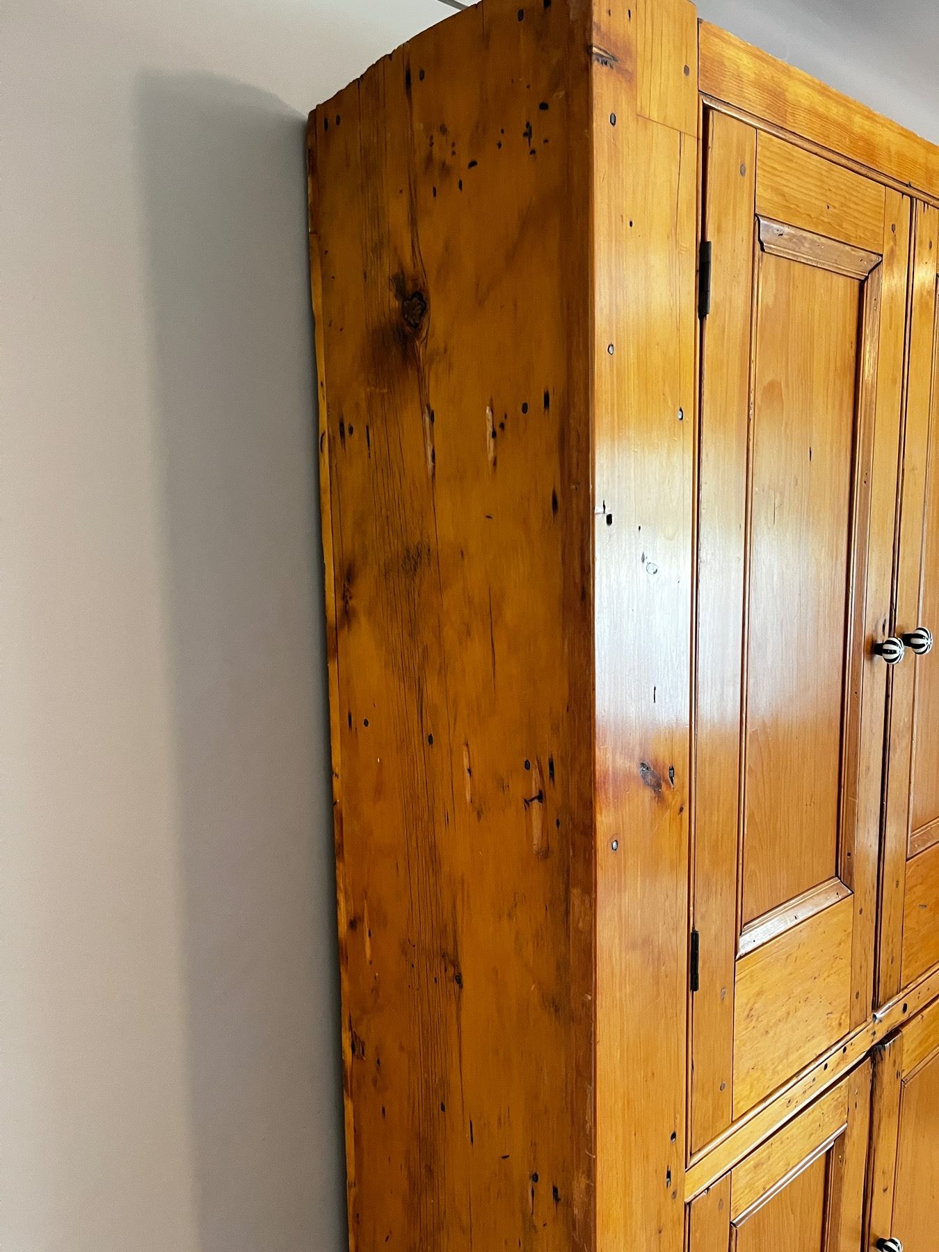 7' tall x 46 1/2" long x 18" wide - 1 1/4 inch solid pine with decorative porcelain knobs - forged fasteners - four doors and six interior shelves - semi-glaze clear finish