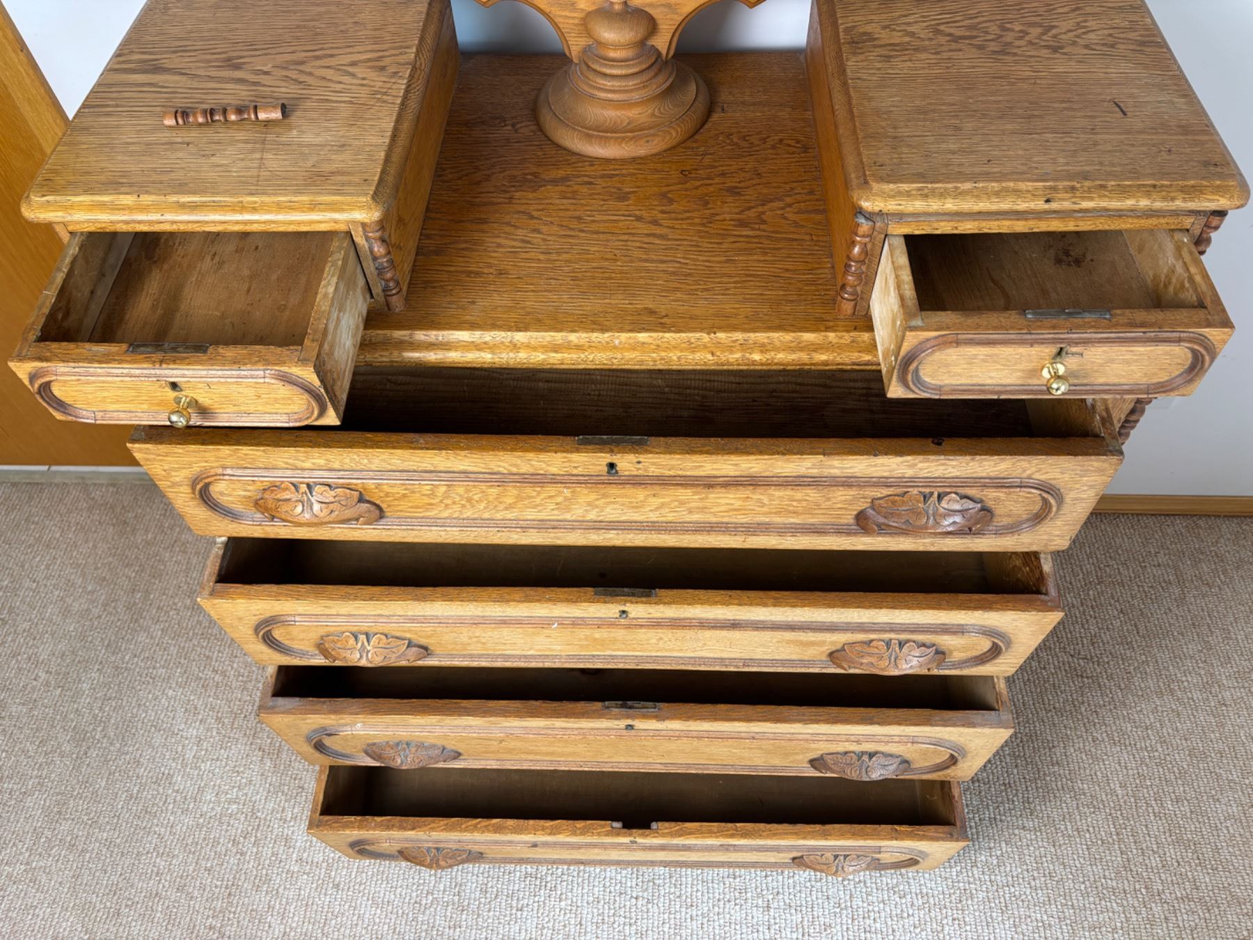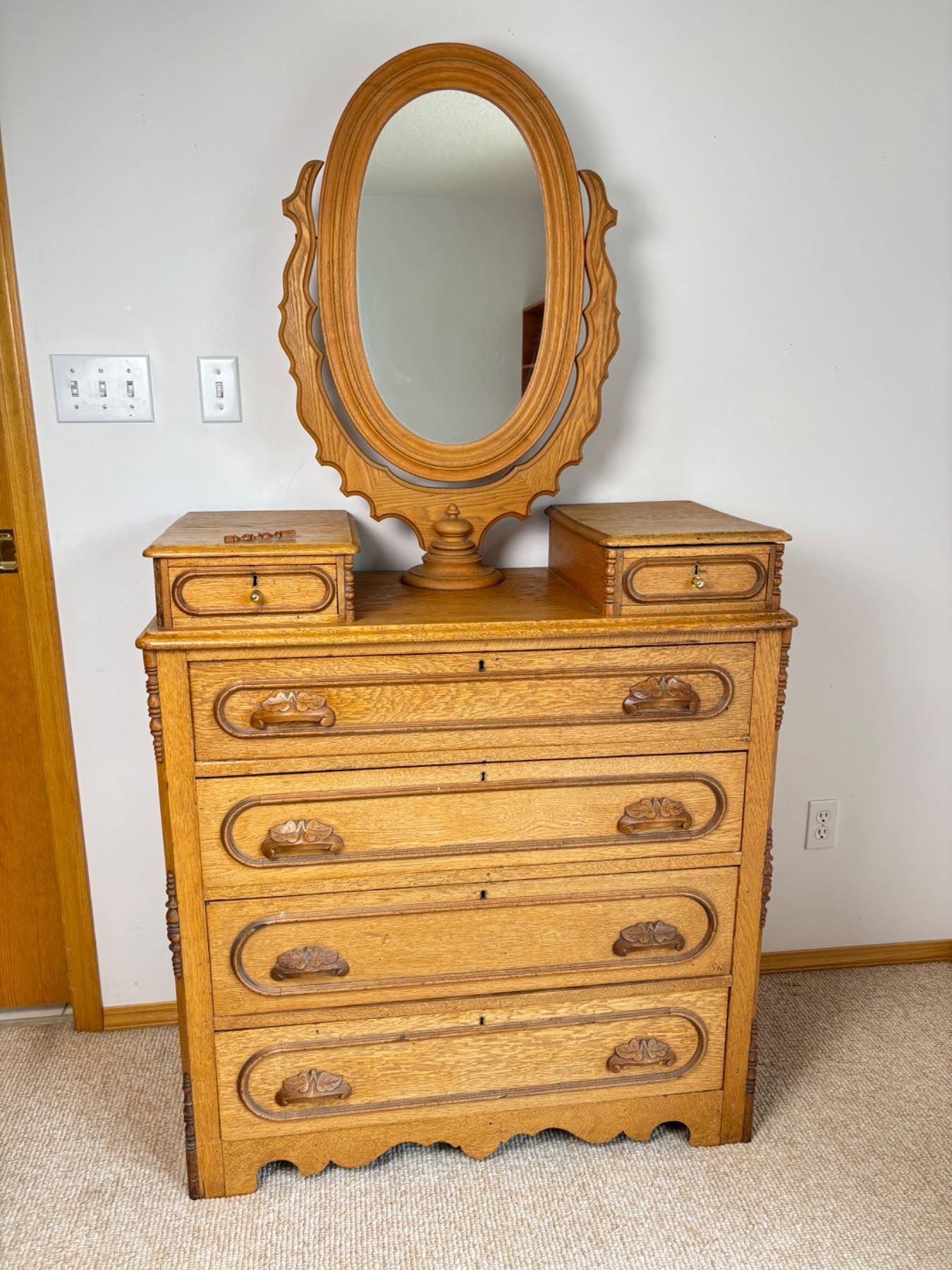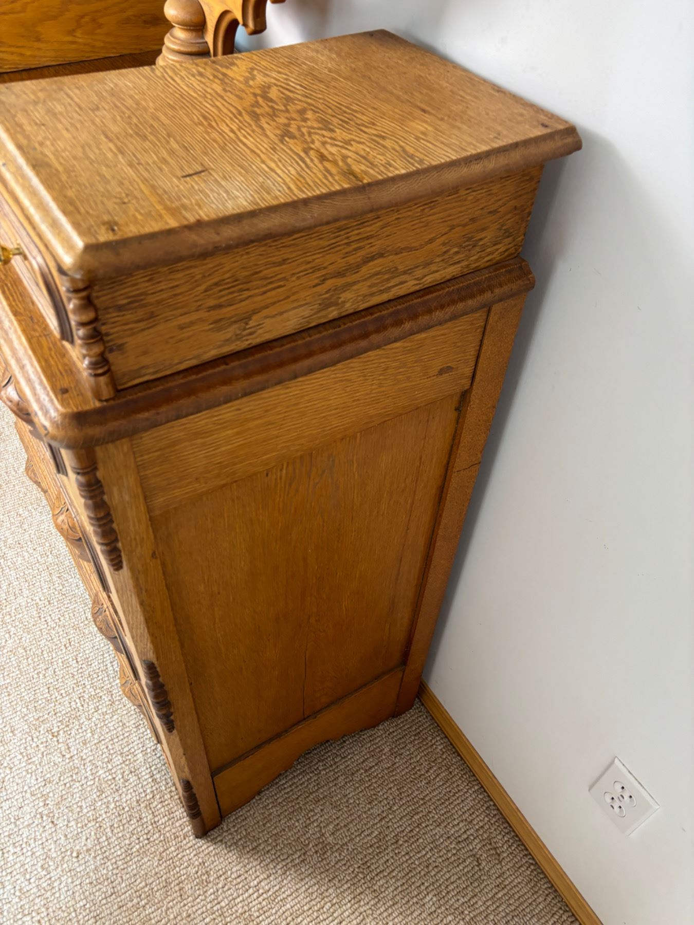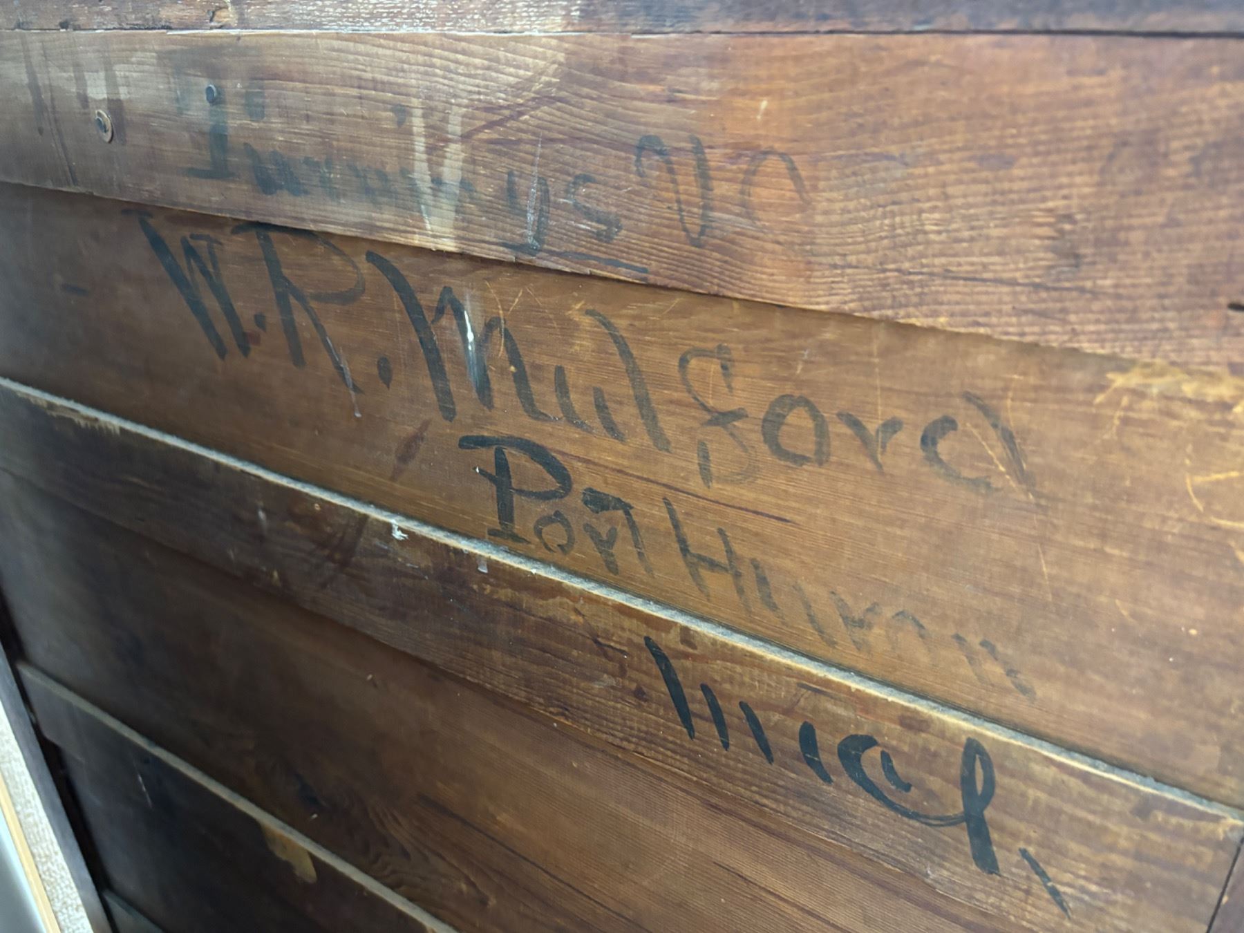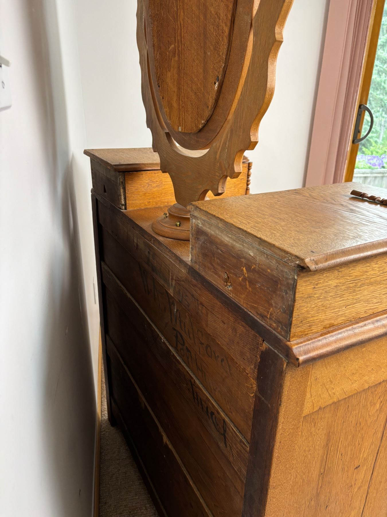 No keys, one trim piece has fallen off (can be re-glued), Writing on the backside (see photos), measures 38"L x 18"W x 70"H