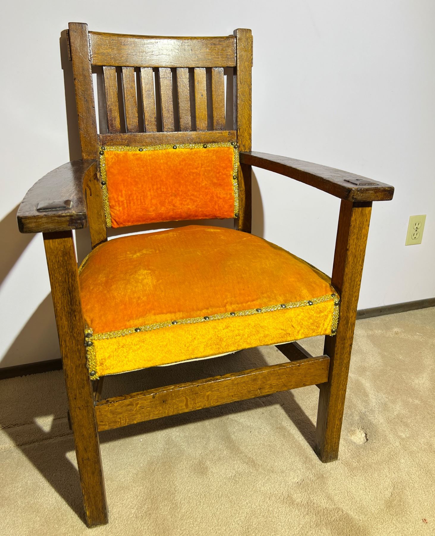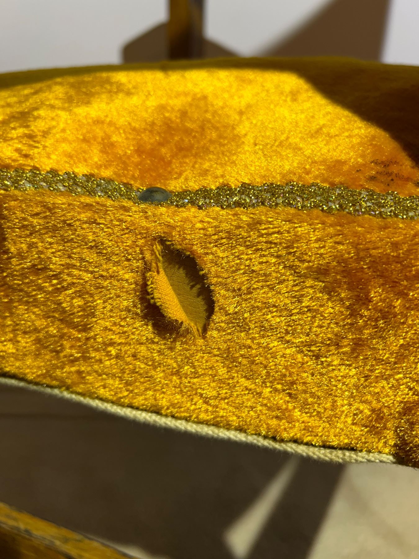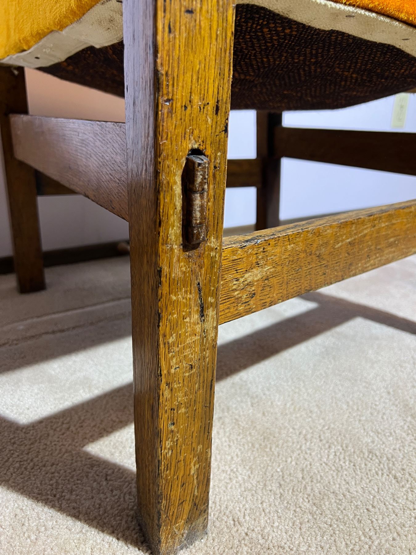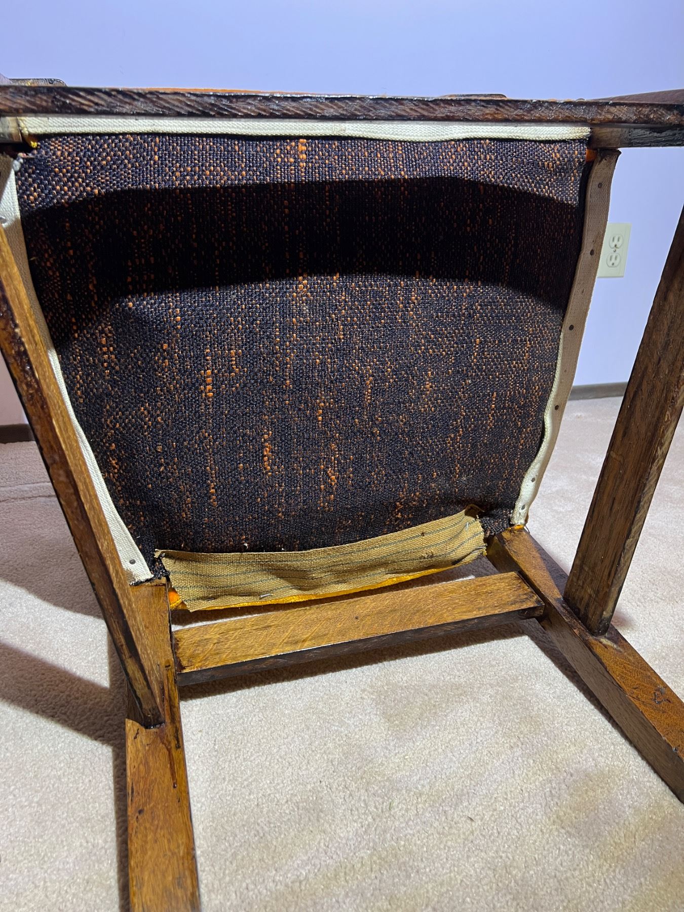 The upholstery has a small tear on the left side of the seat, some scuffs and wear to the wood frame, measures 26"L x 21"W x 38"H