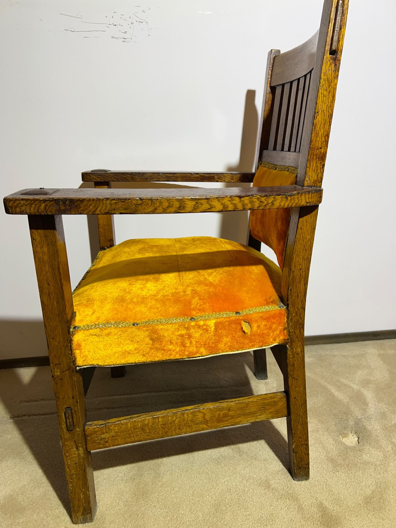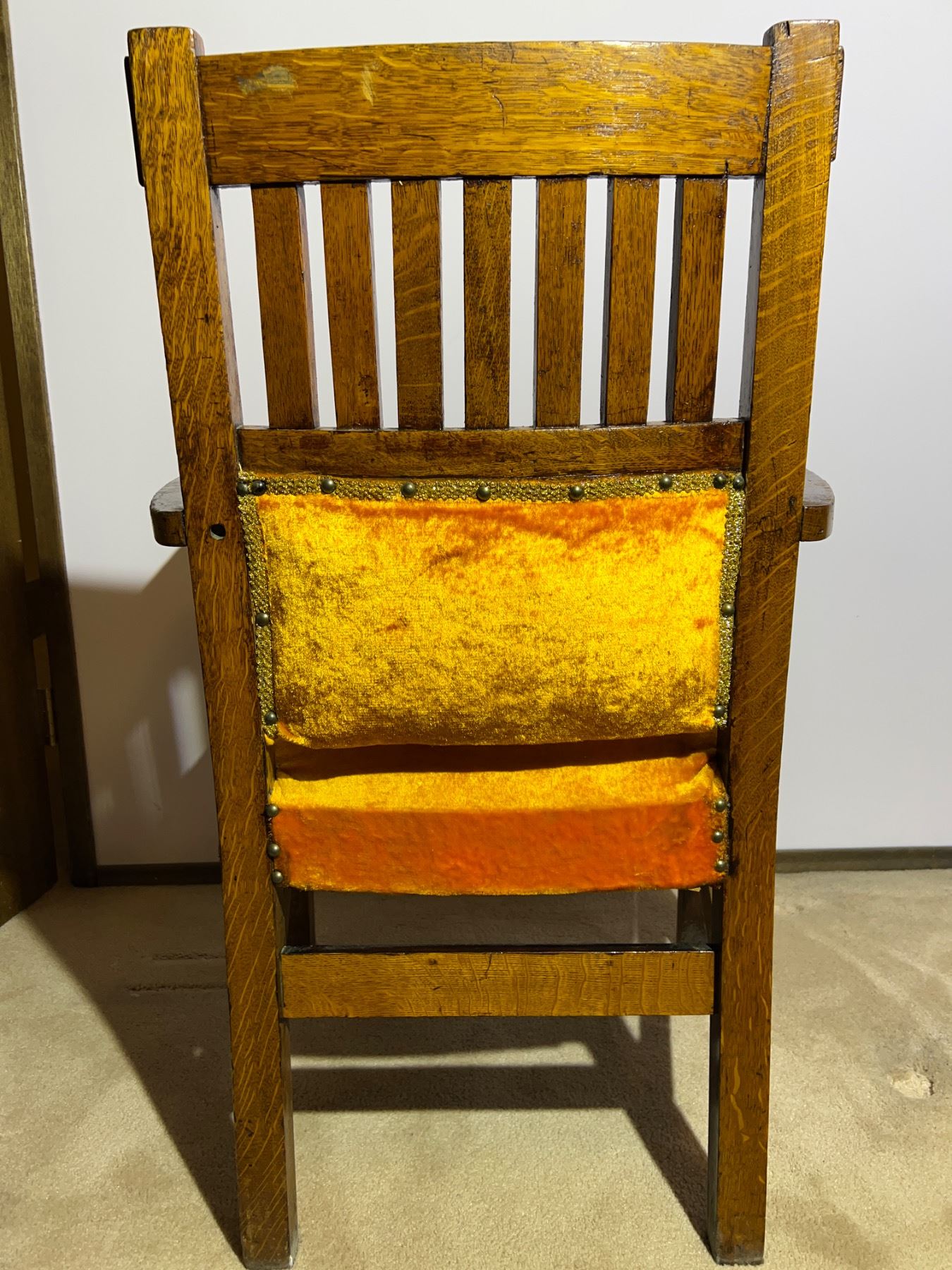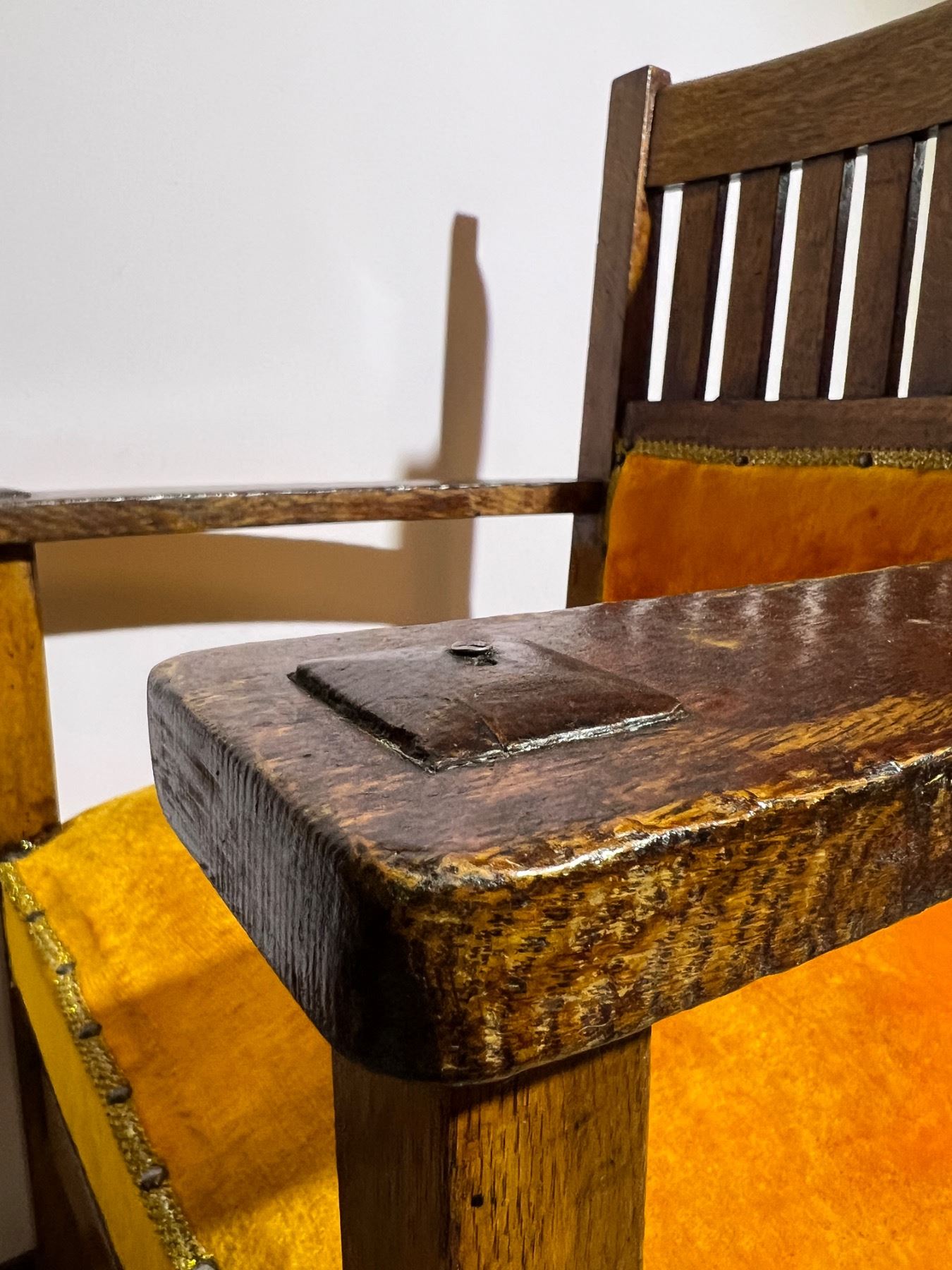 The upholstery has a small tear on the left side of the seat, some scuffs and wear to the wood frame, measures 26"L x 21"W x 38"H