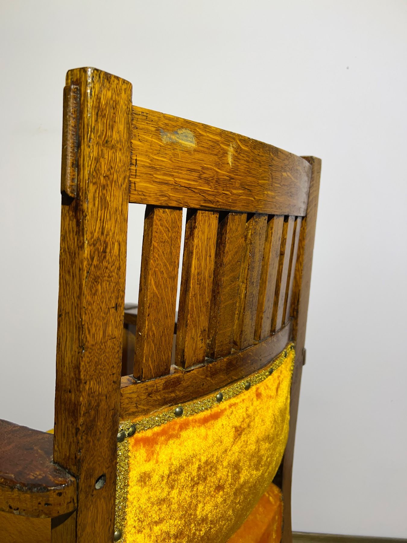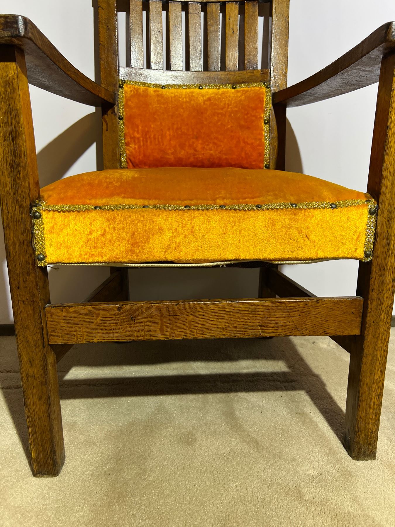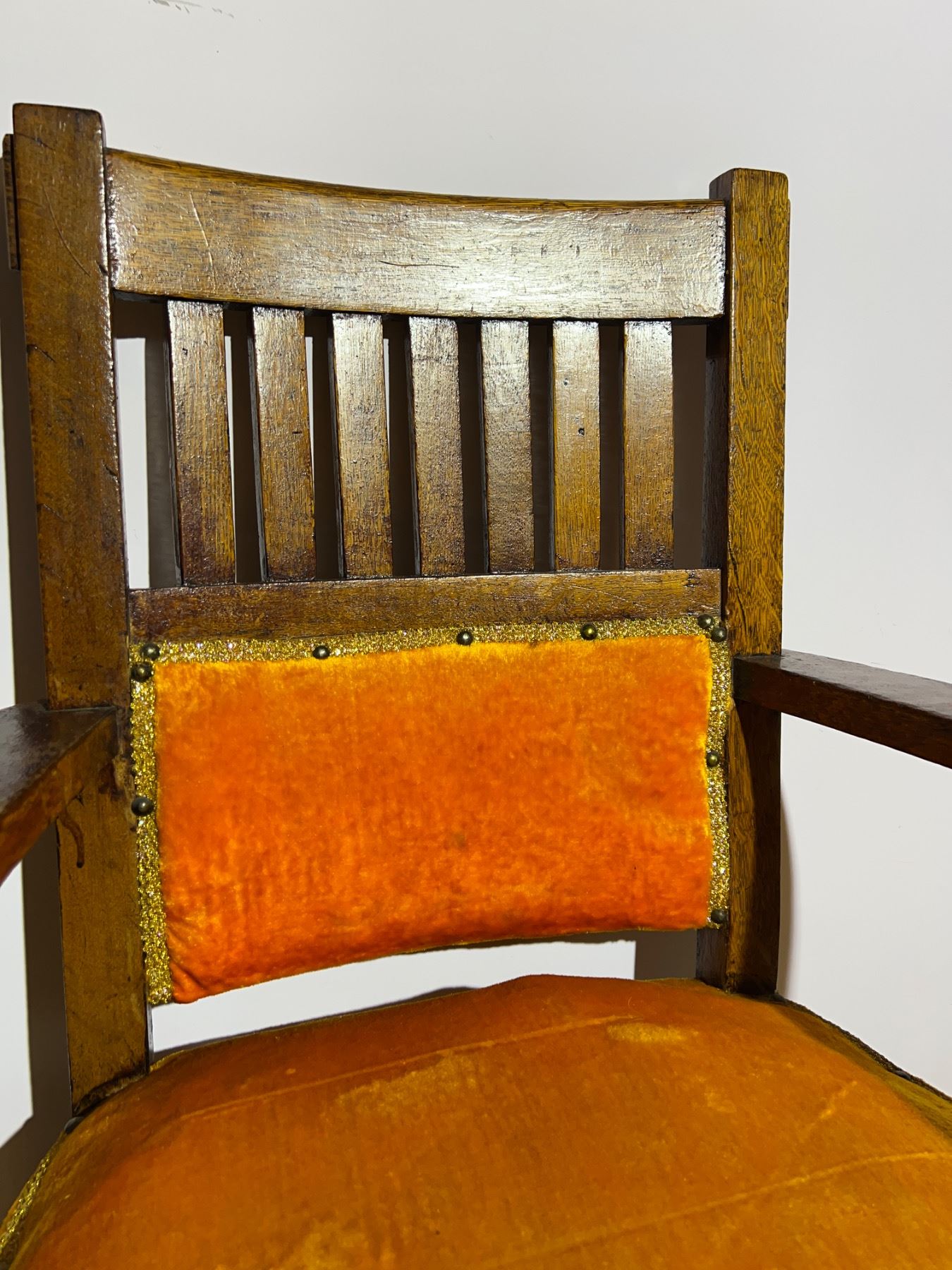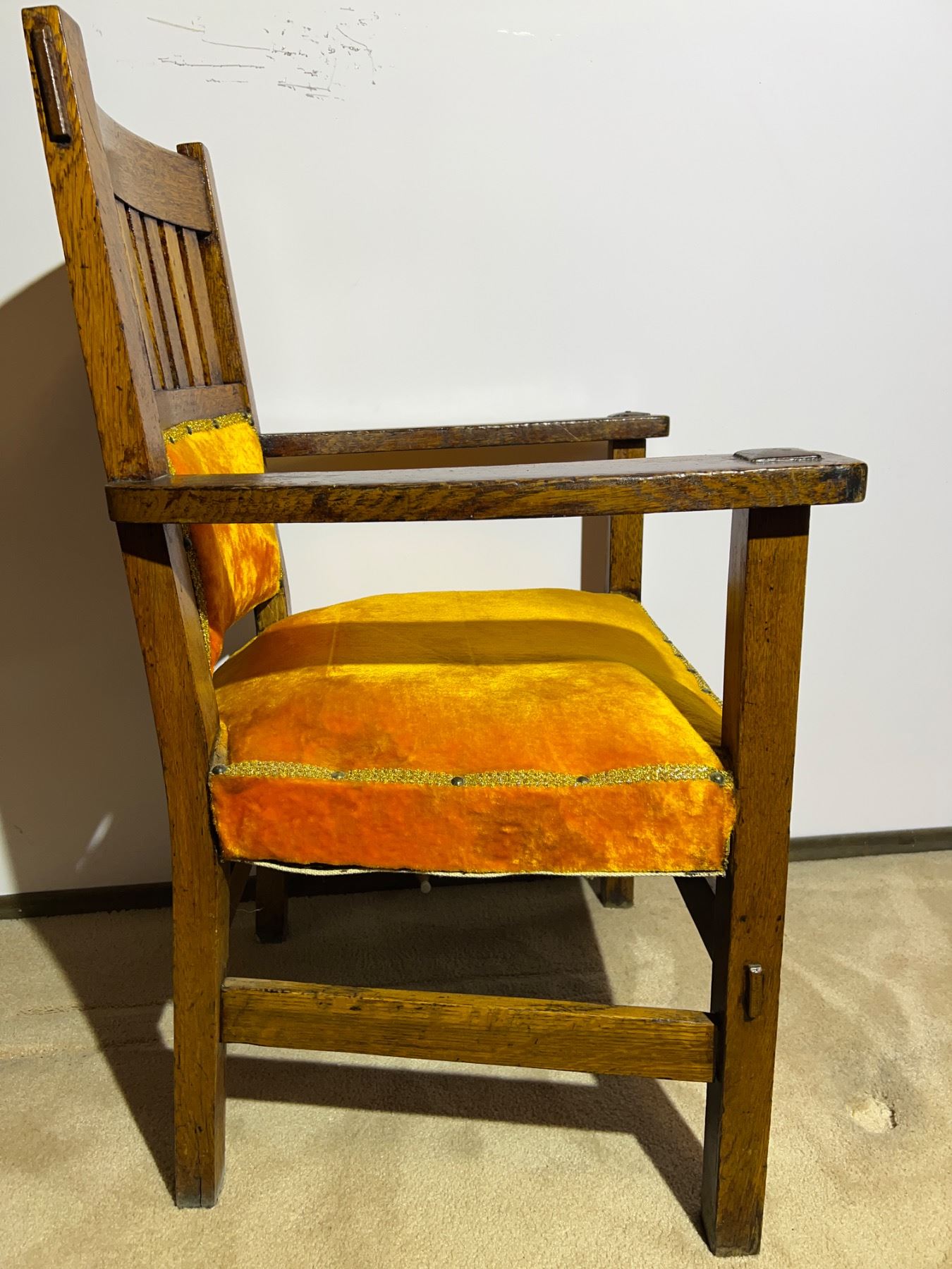The upholstery has a small tear on the left side of the seat, some scuffs and wear to the wood frame, measures 26"L x 21"W x 38"H