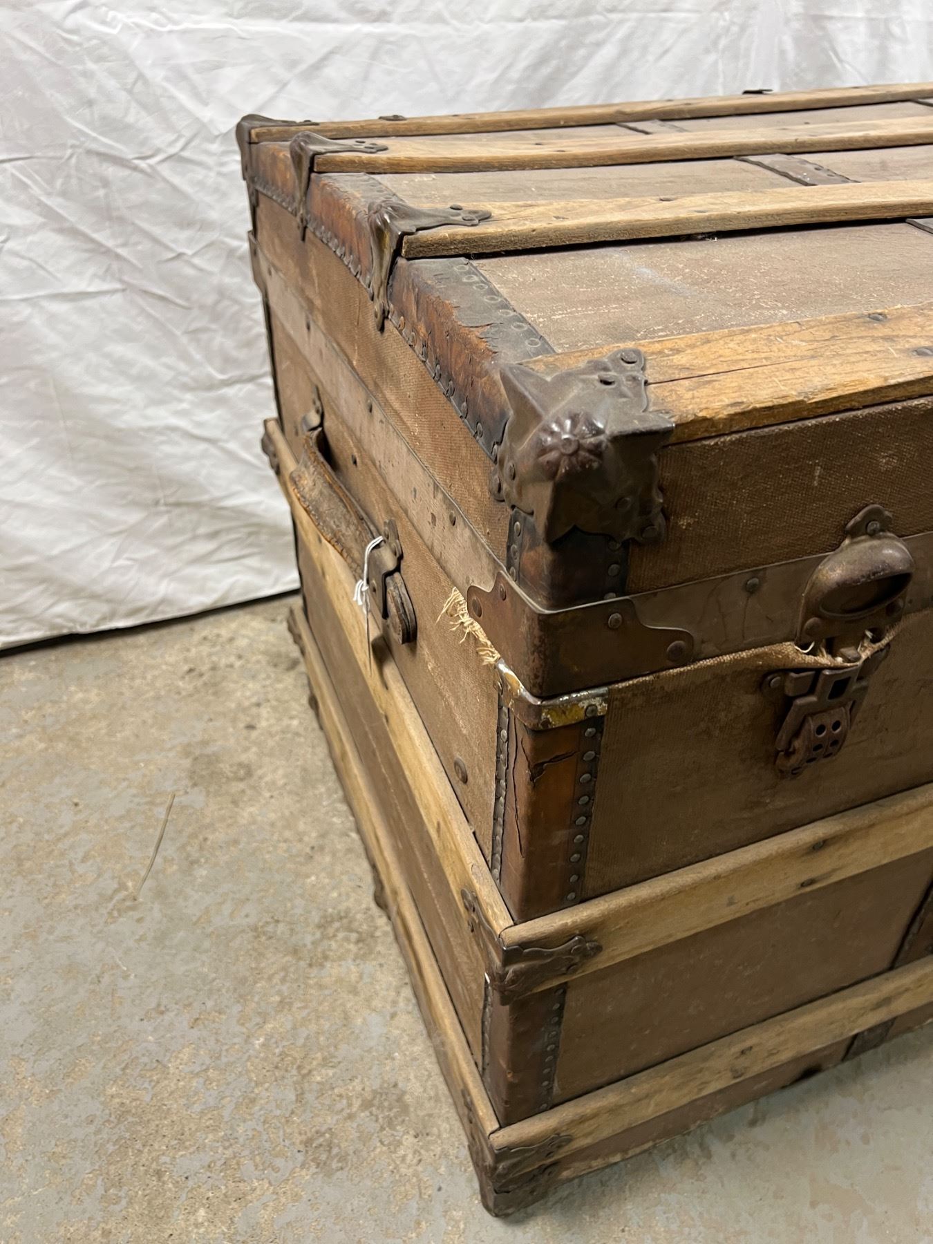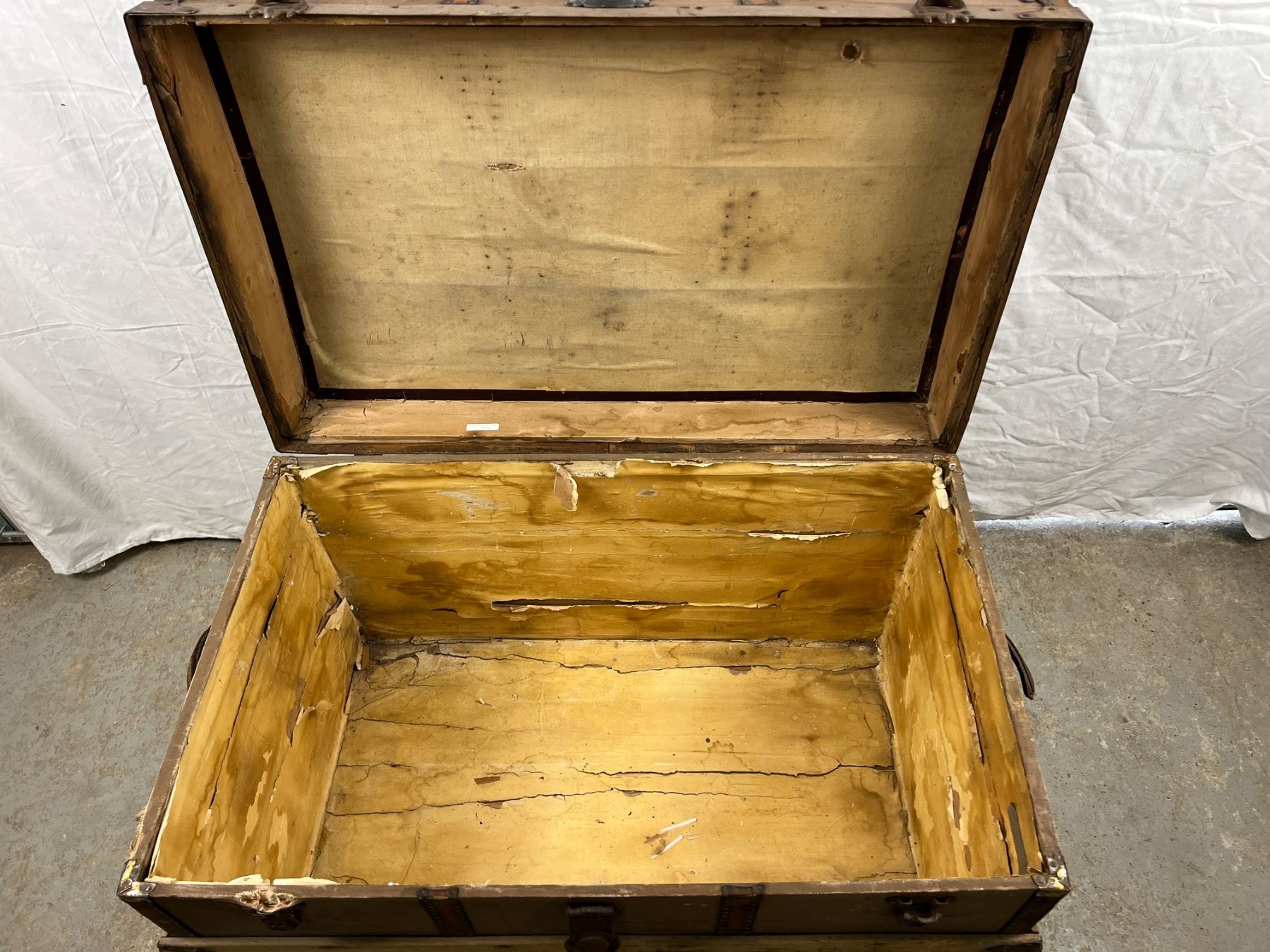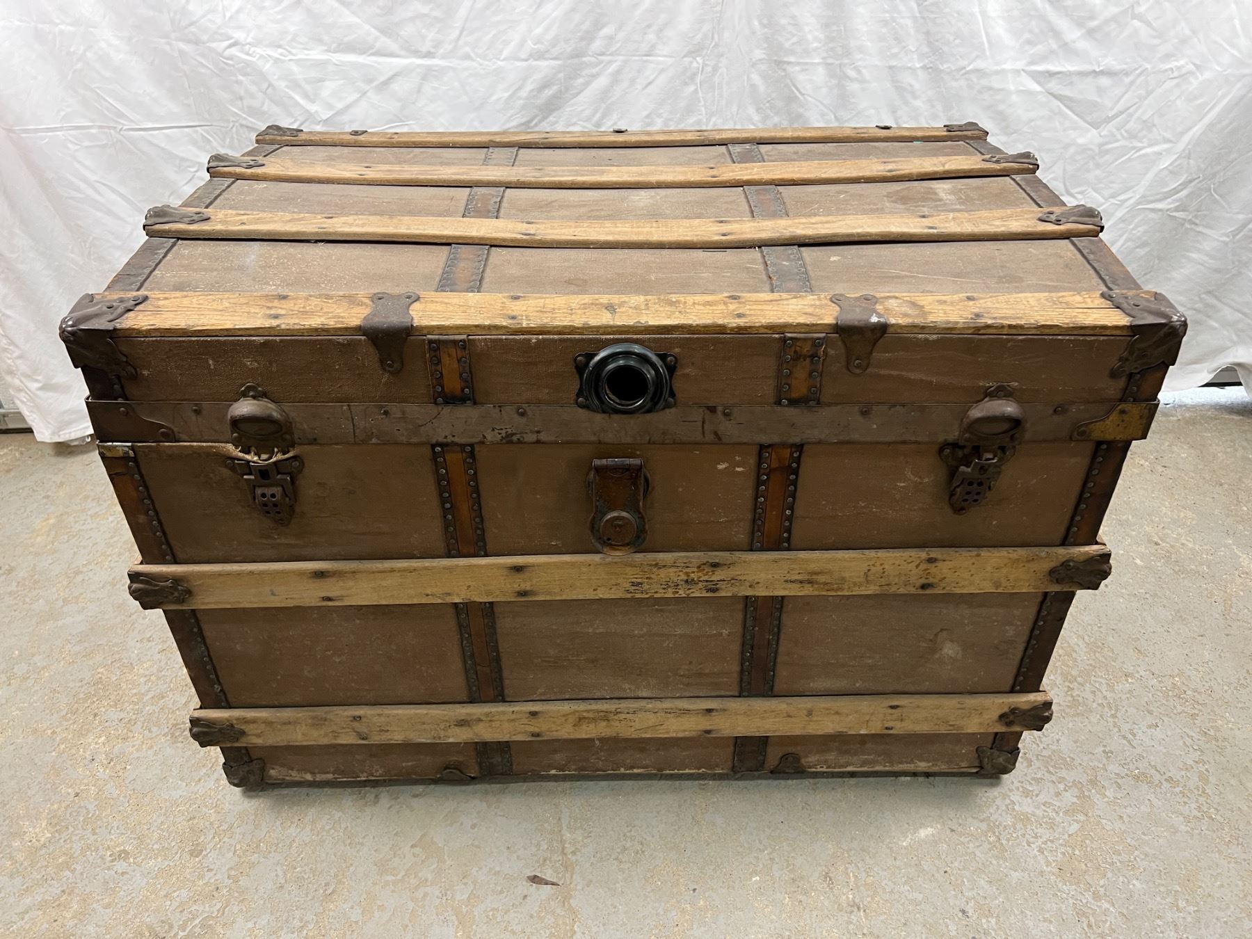 One of the leather handles is torn, has wear and tear, no key, 25"H x 36"L x 23"W