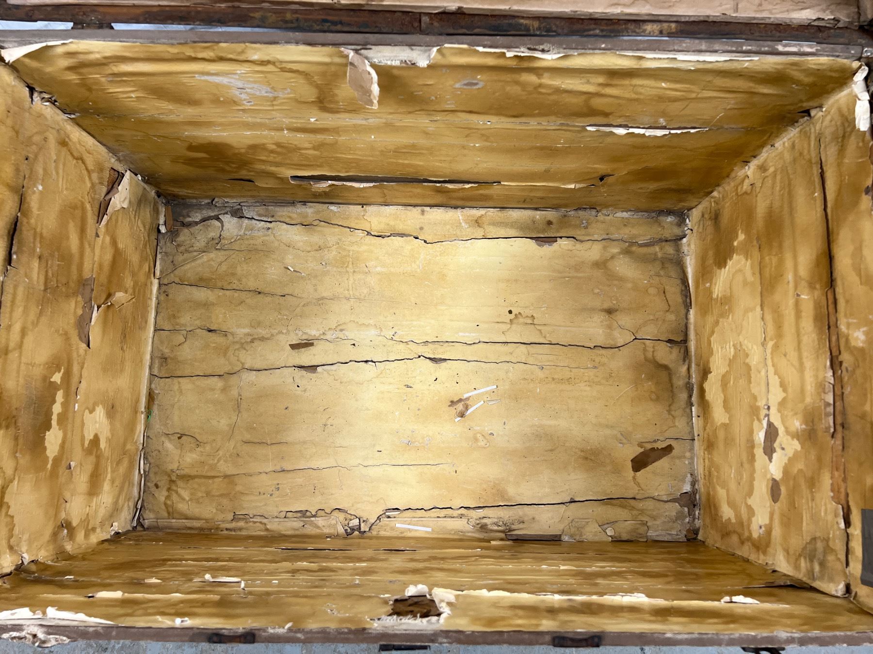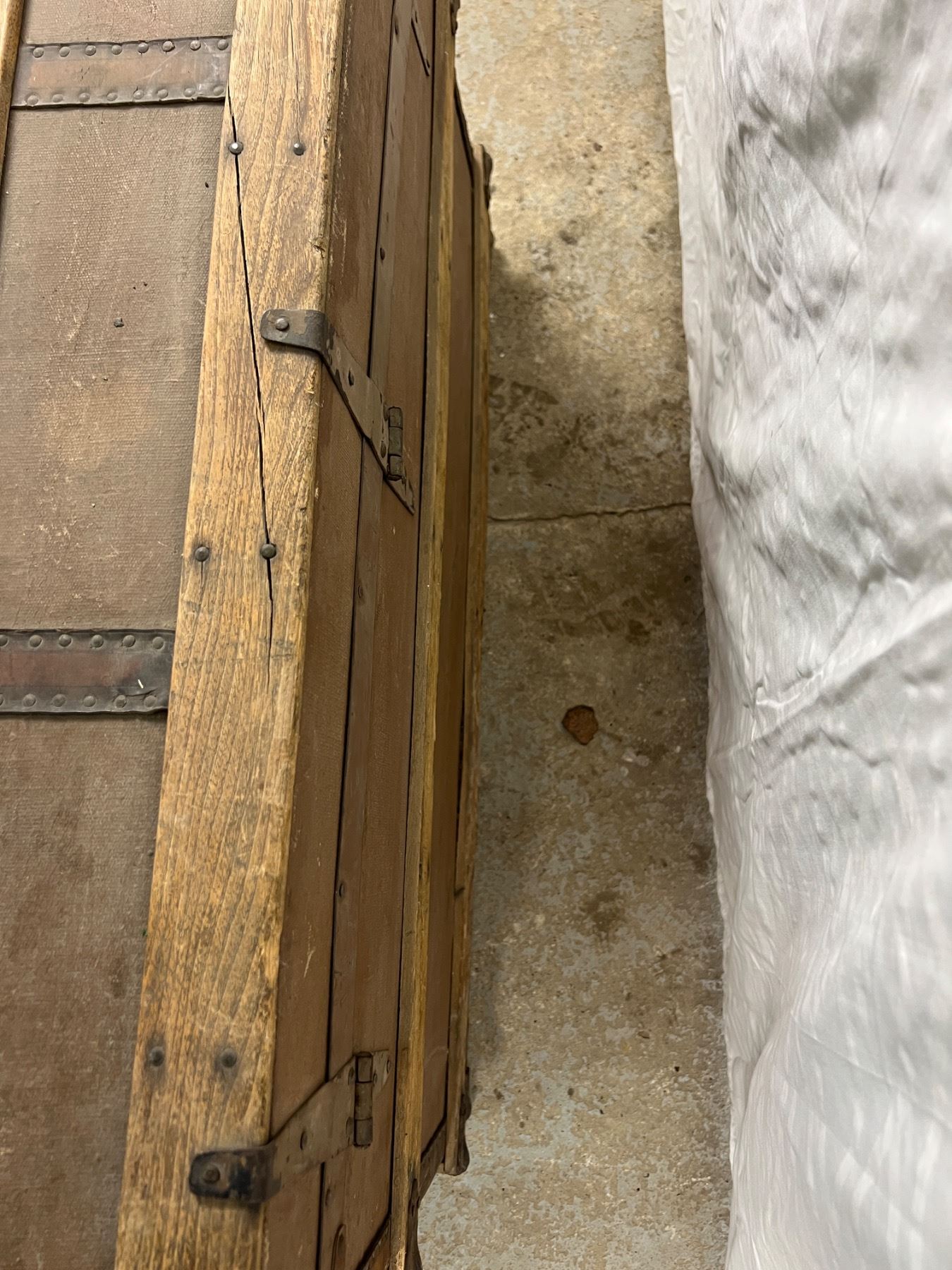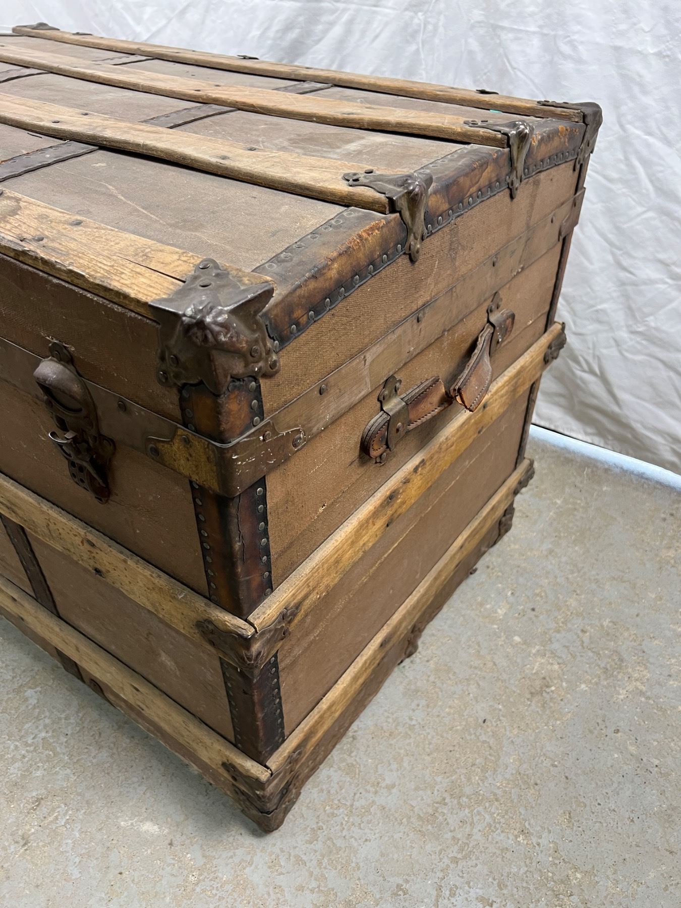 One of the leather handles is torn, has wear and tear, no key, 25"H x 36"L x 23"W