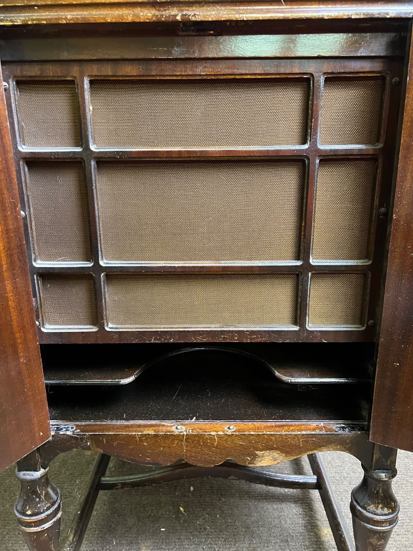 Model # VV4-3. Made before the multiple name changes the company underwent. Nipper is featured on the lid of the player and on the model badge. Scrapes and markings in wood across body panels of player. Unknown if working but crank does turn. Measures 36"H and 20" by 20"