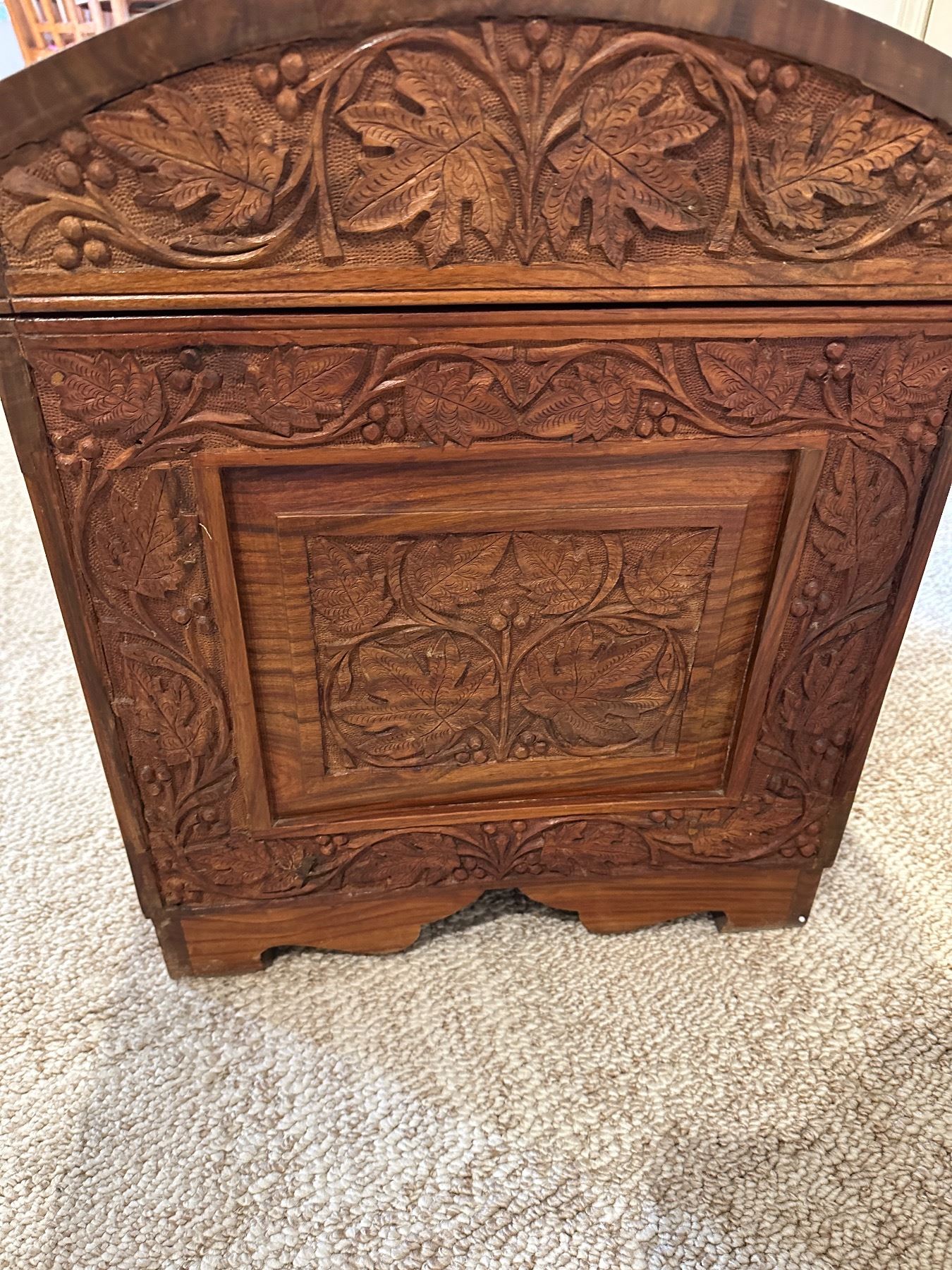Absolutely beautiful - 19" tall x 30" wide x 17" deep - has a small crack in the corner of the wood - does not affect structure.