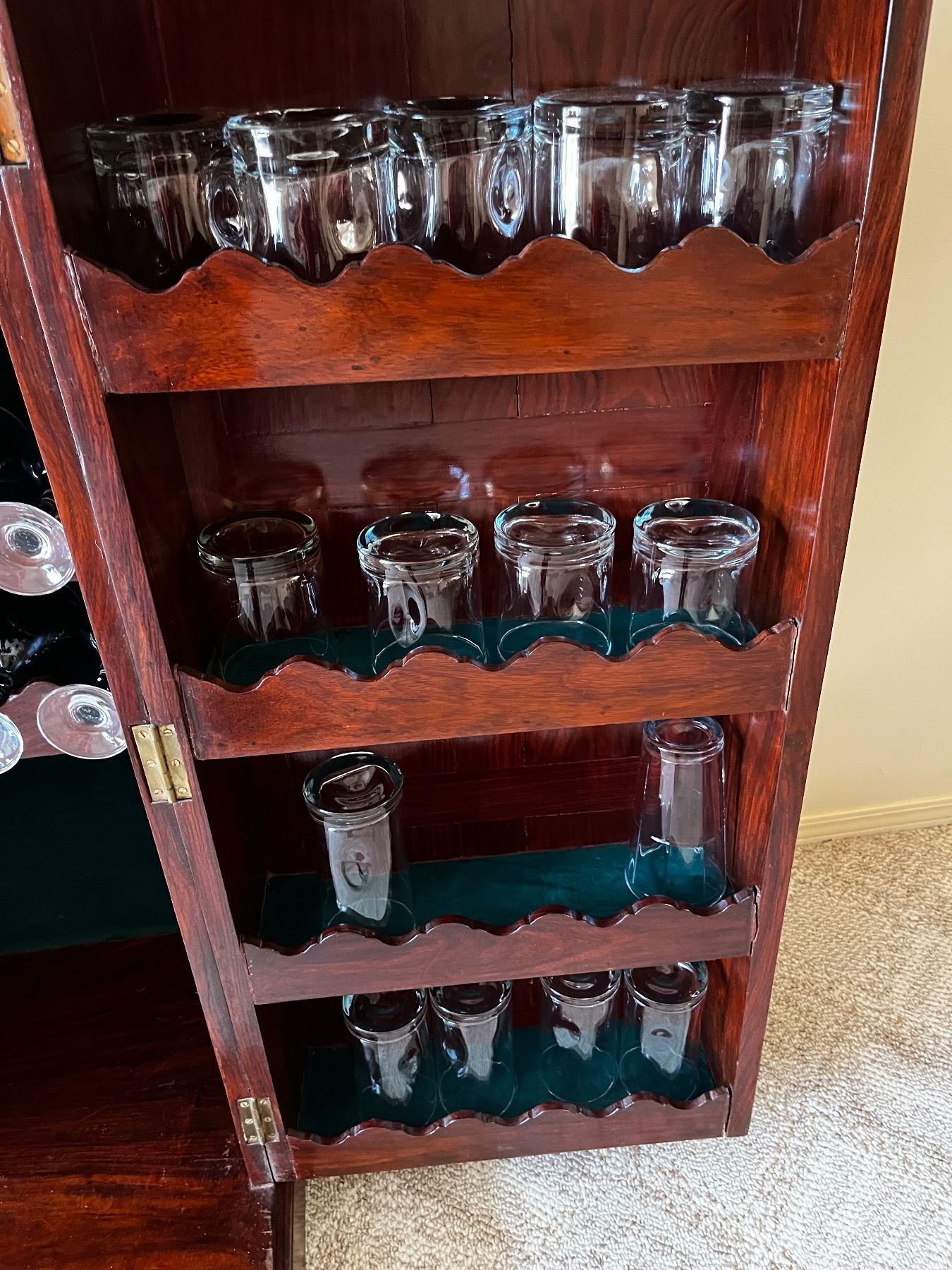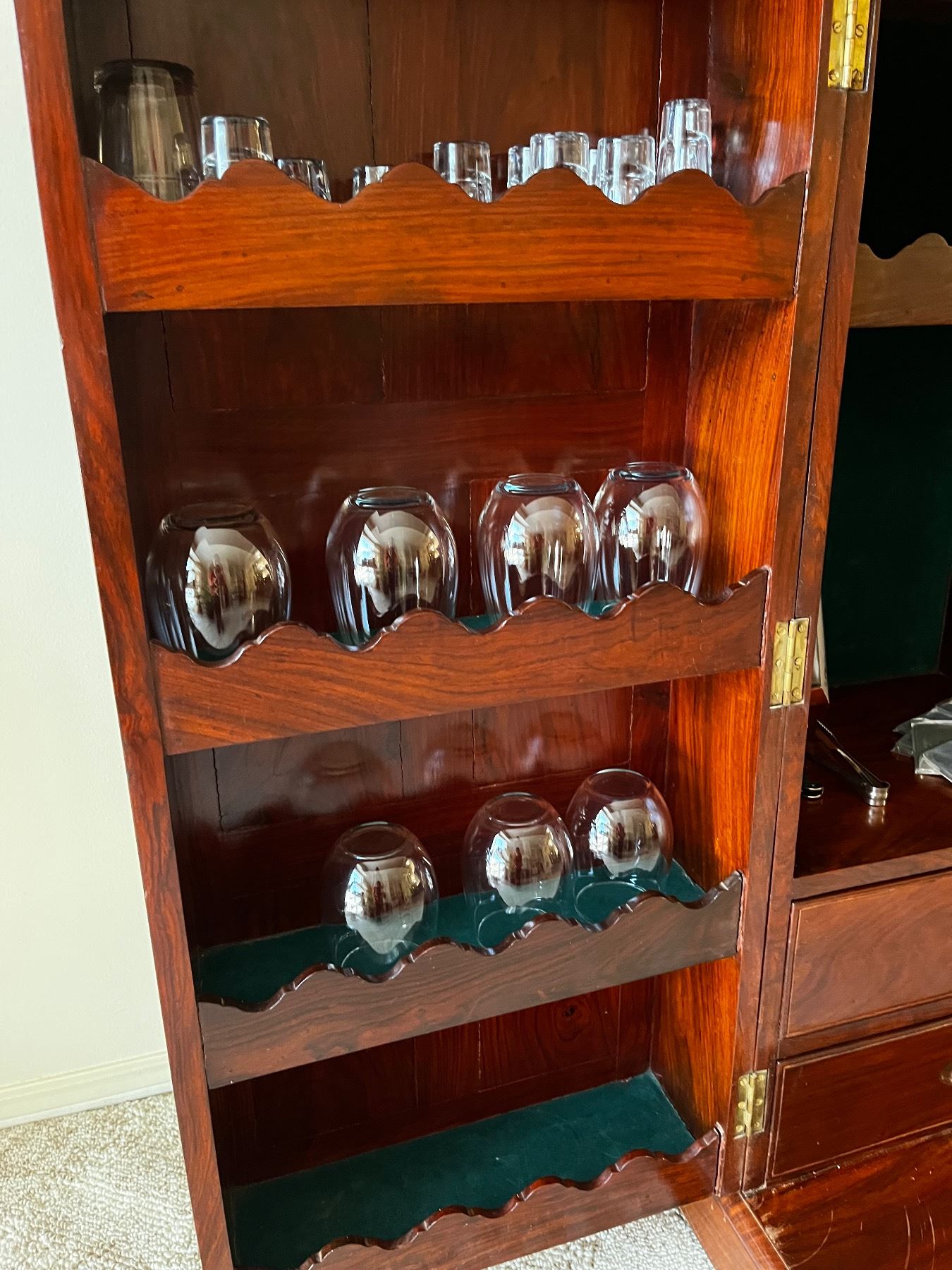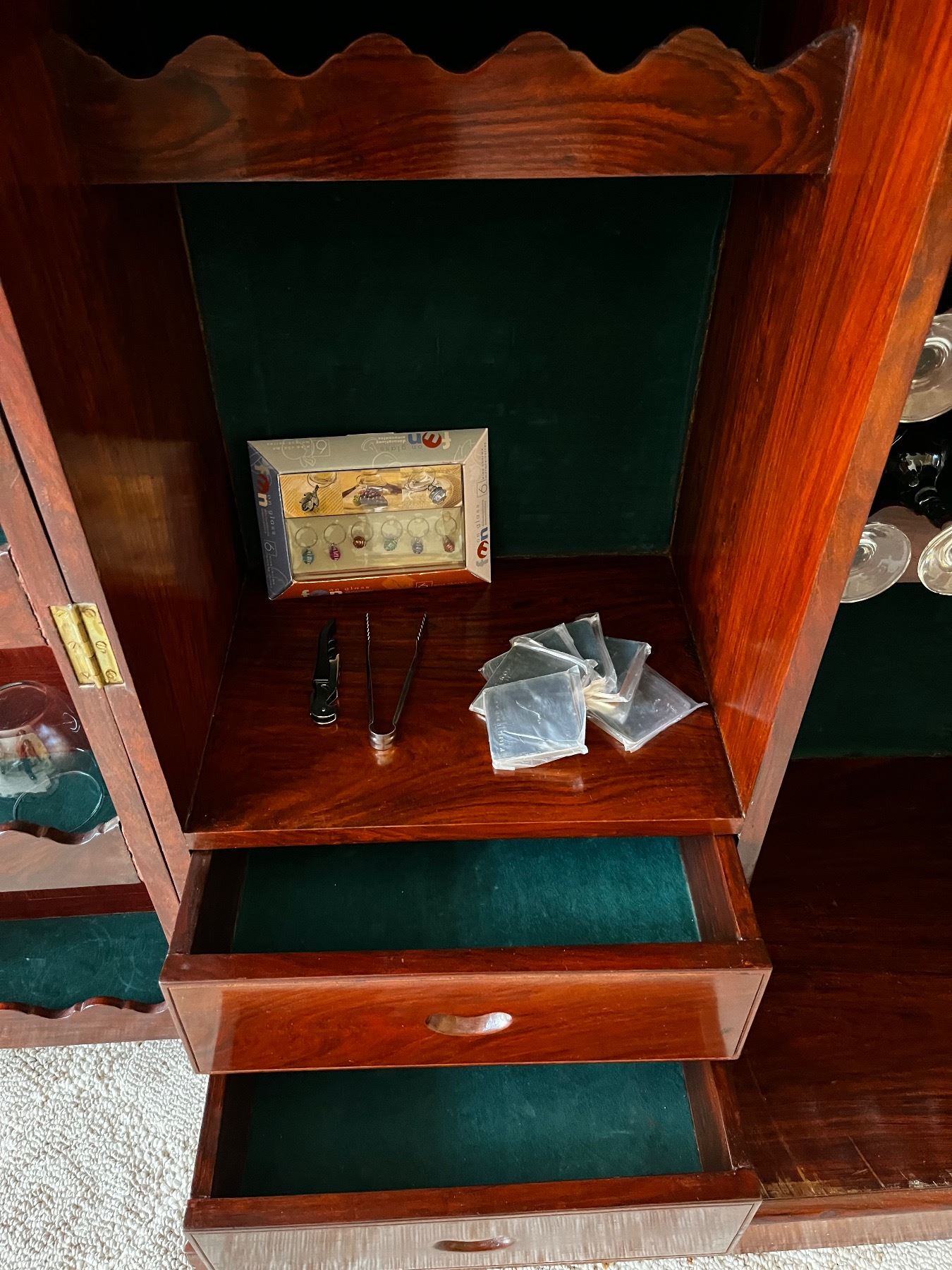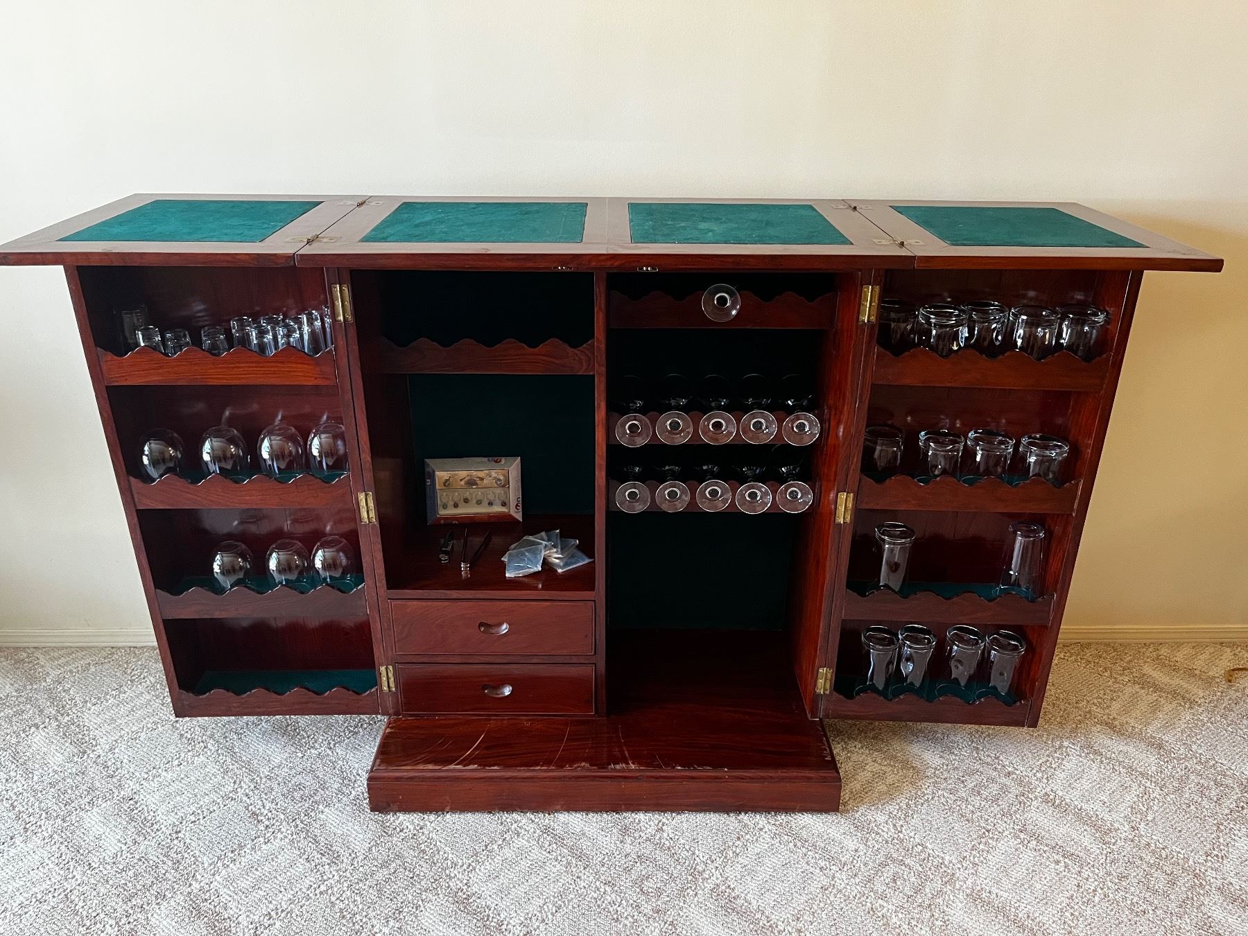 In good condition - has some scuffs - 70" long x 20" wide x 44" tall when fully expanded - includes assorted liquor glasses and accessories
