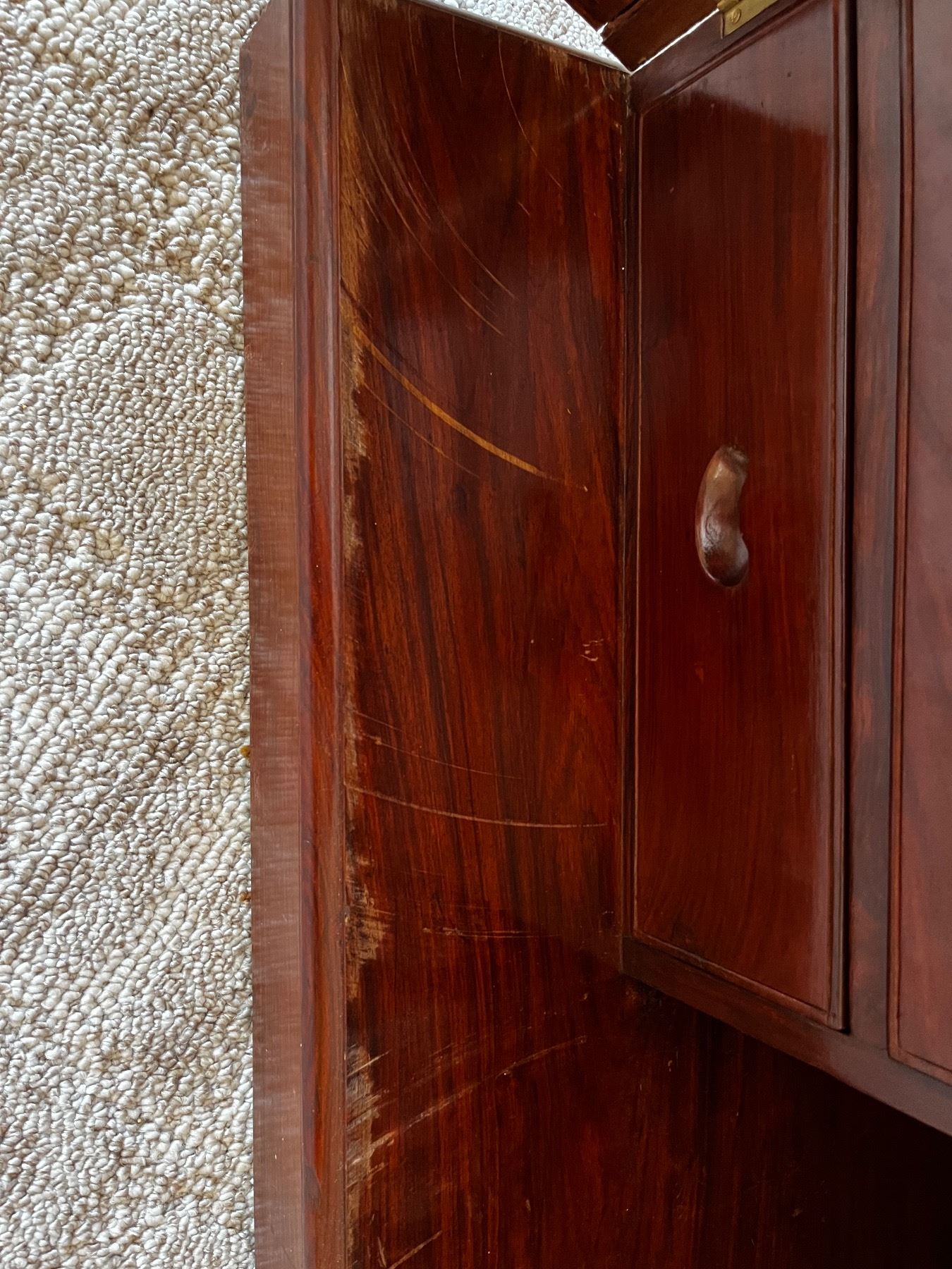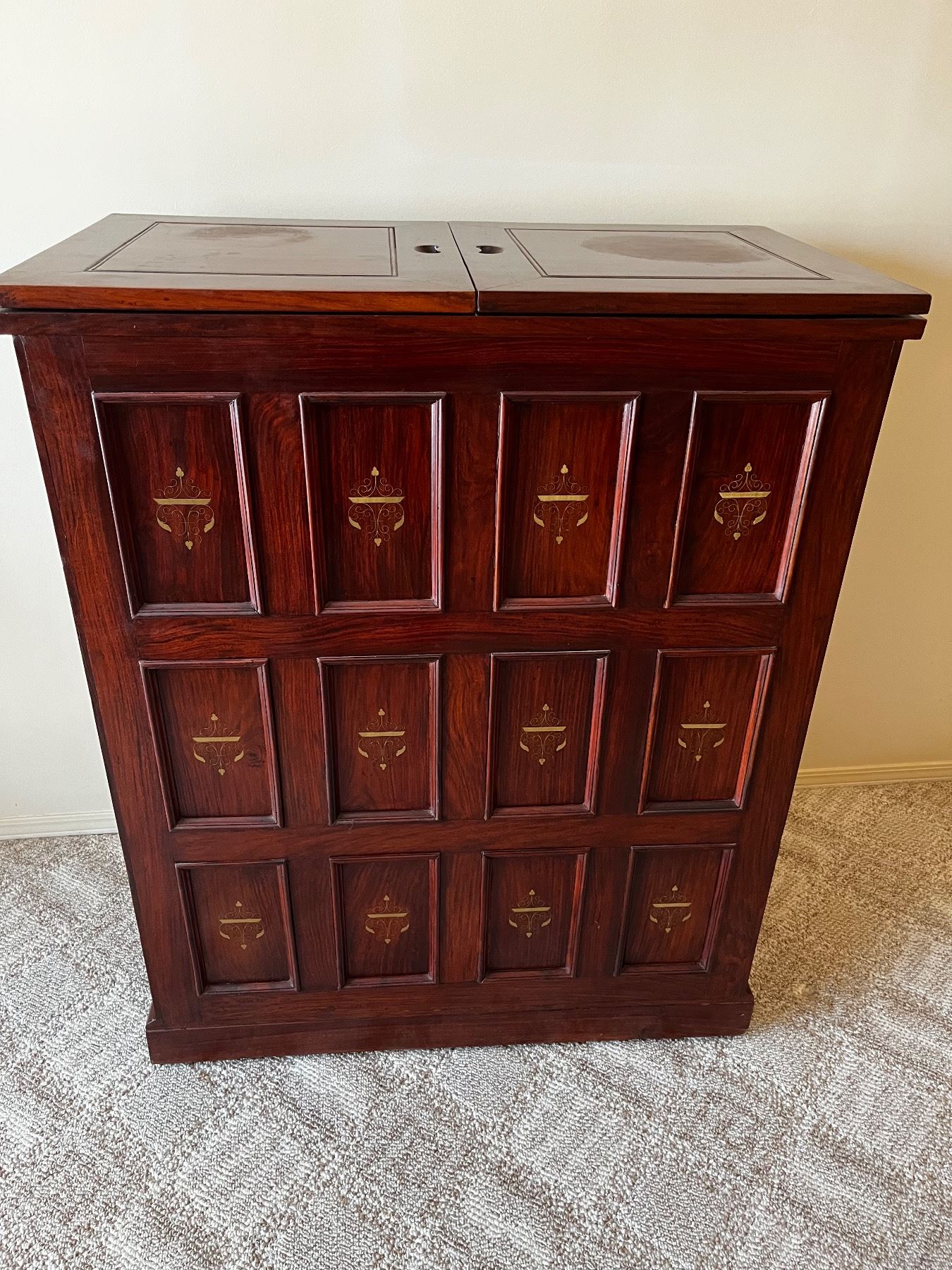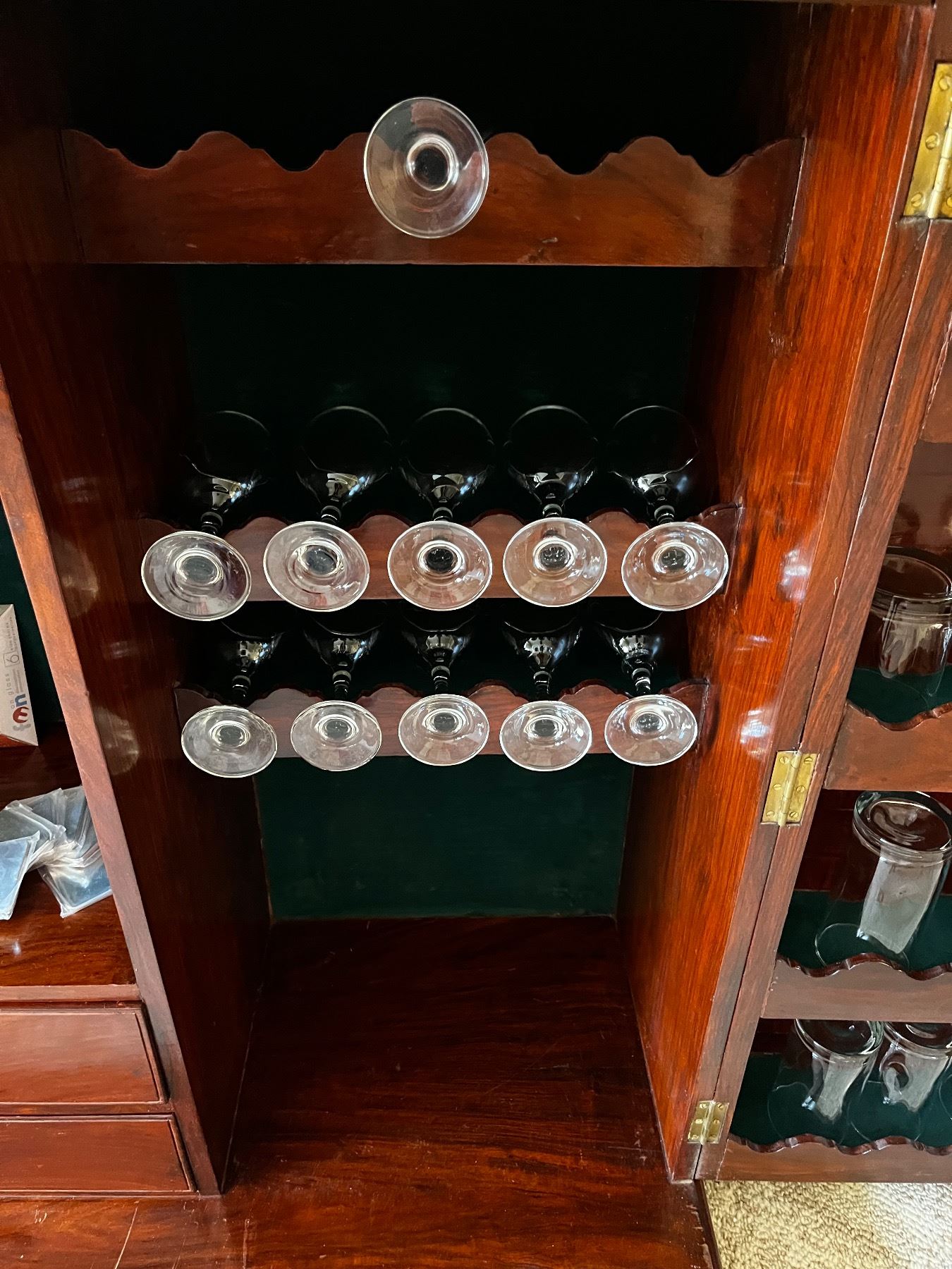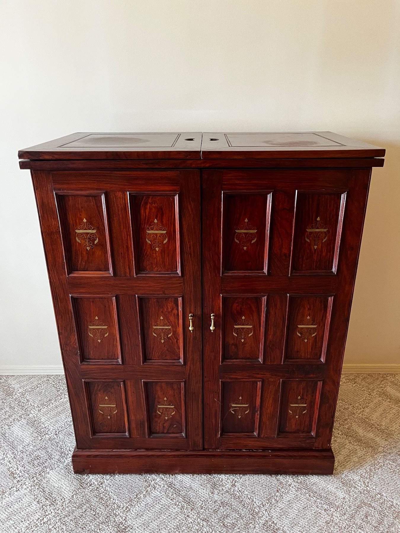 In good condition - has some scuffs - 70" long x 20" wide x 44" tall when fully expanded - includes assorted liquor glasses and accessories