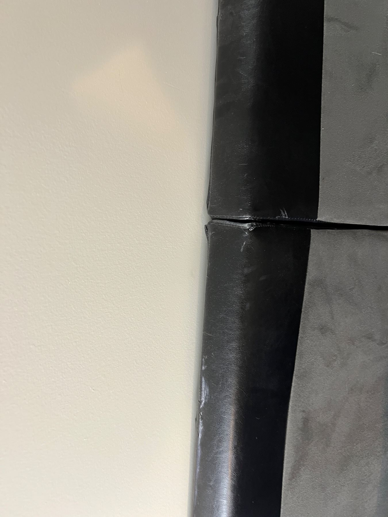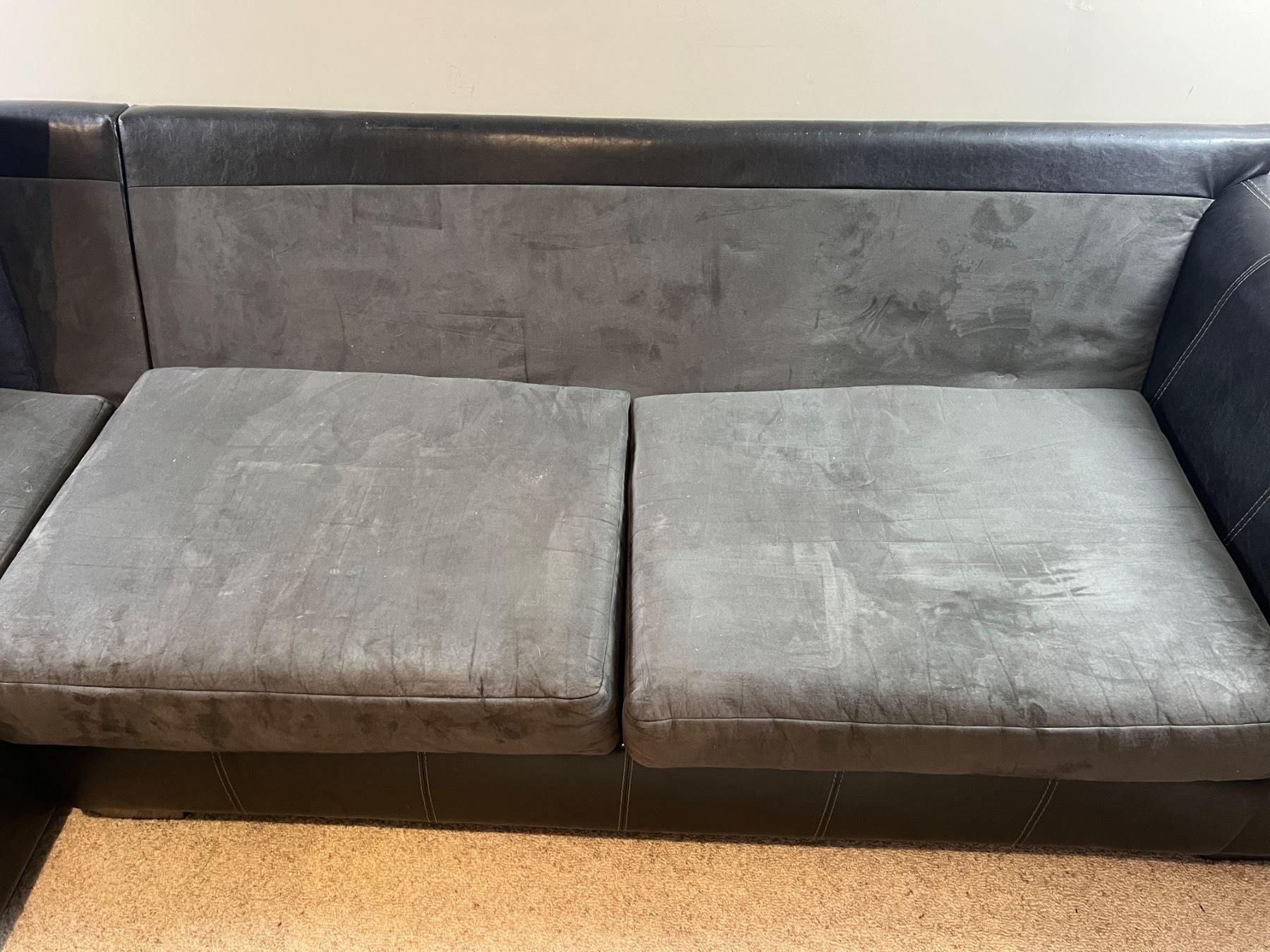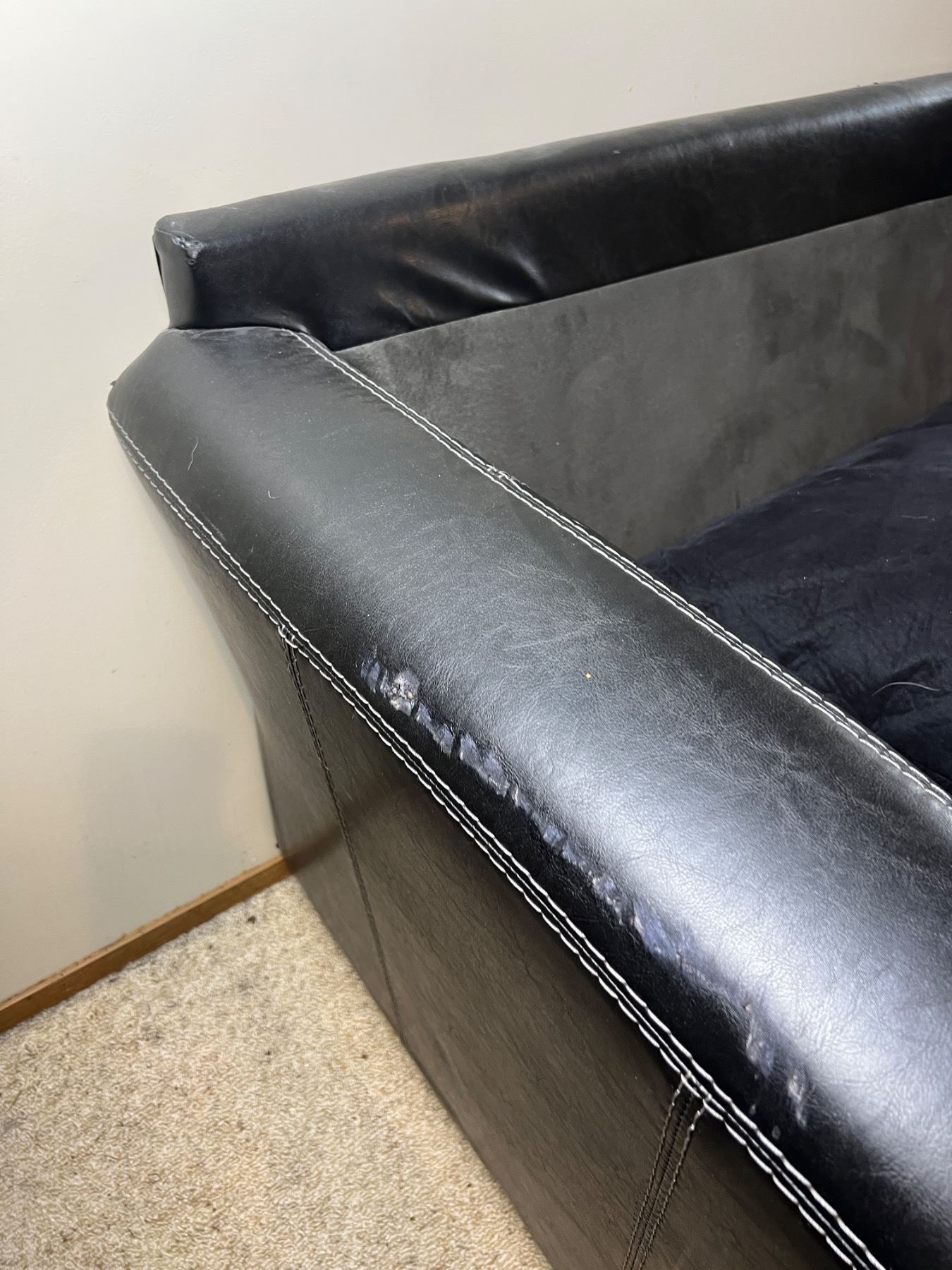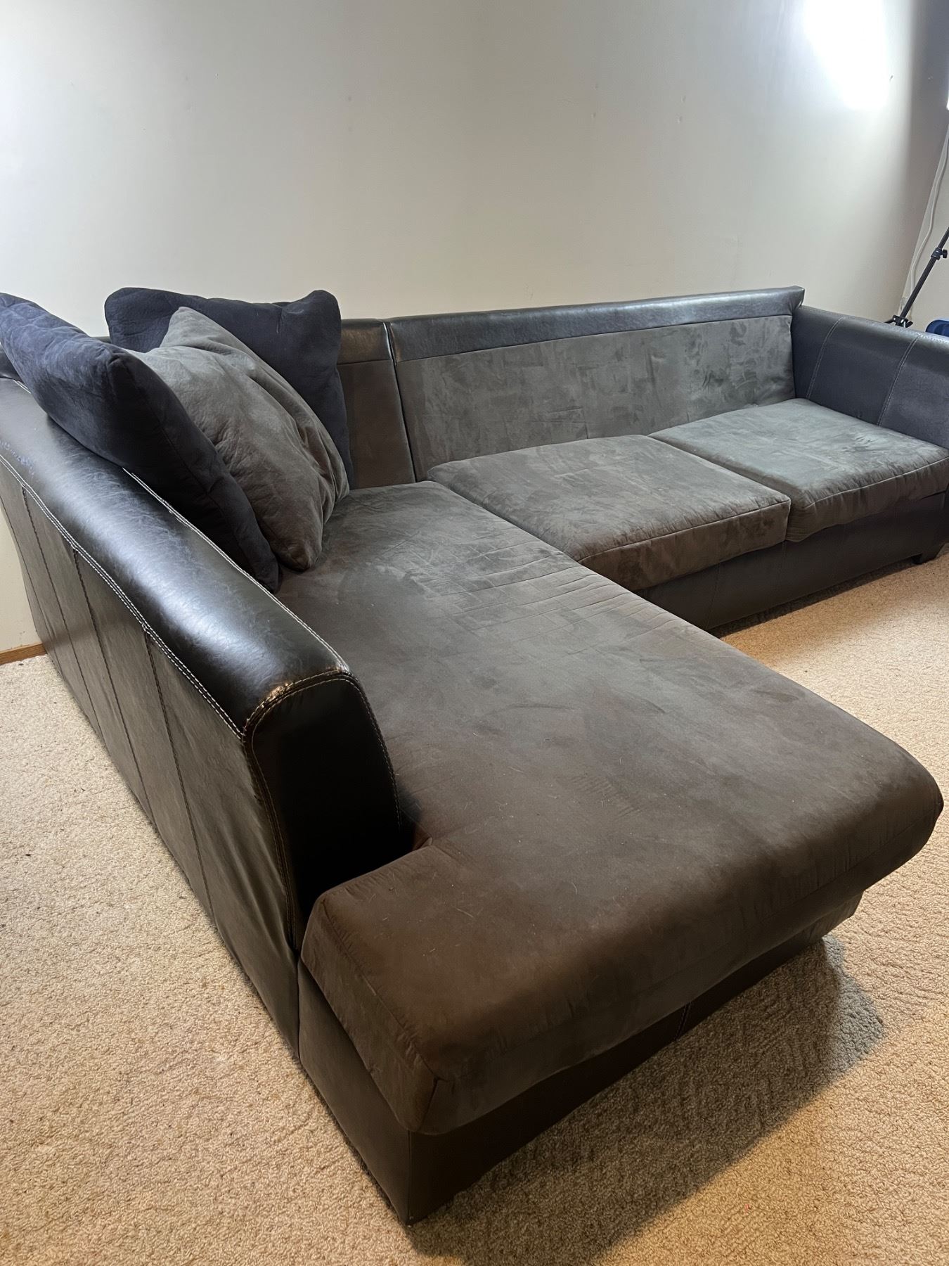 Has some rips and scuffs, 123"L x 34"D x 36"H, the long seat on the couch is 6'D