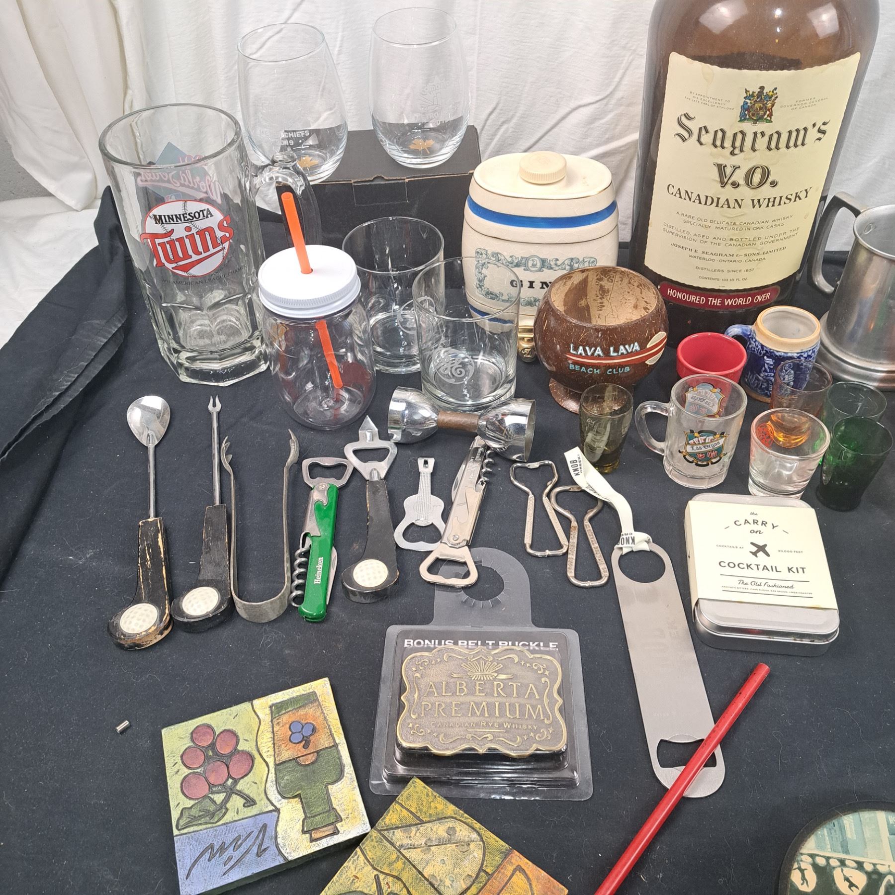 Includes Bottle Openers, Beer Steins, Glasses, Coasters, Empty Seagrams 1333 1/3 Oz Bottle & More