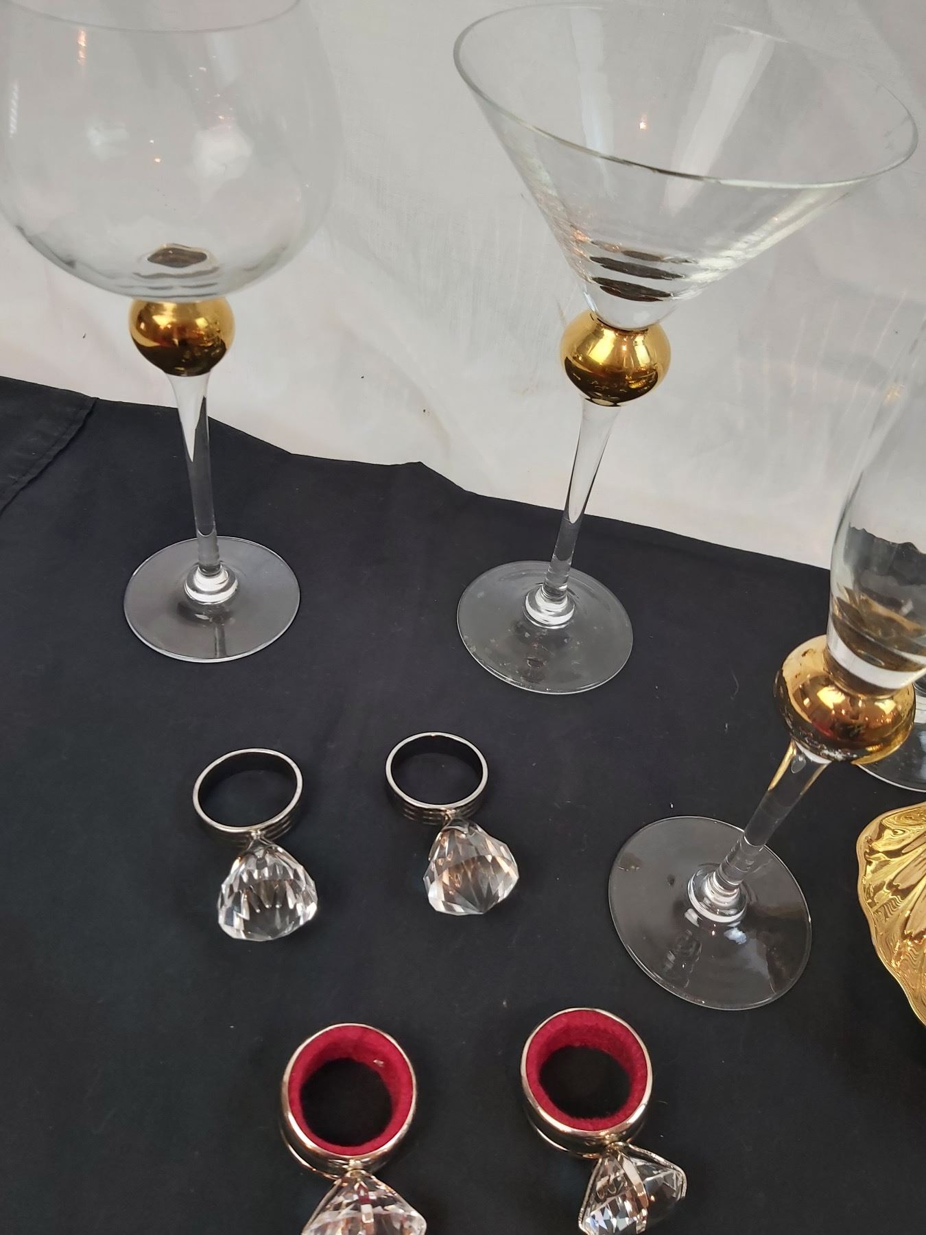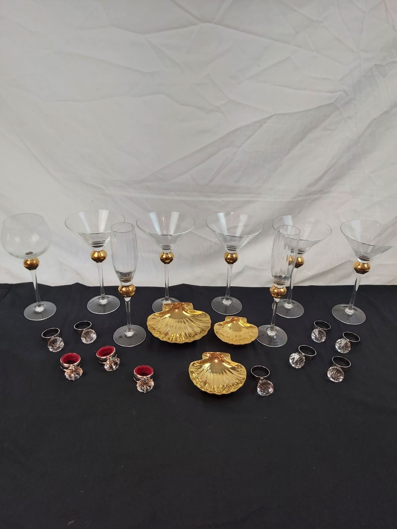 Includes Krosono Poland glasses (2 Martini glasses are chipped), napkin rings, Porcelaine De Paris dishes