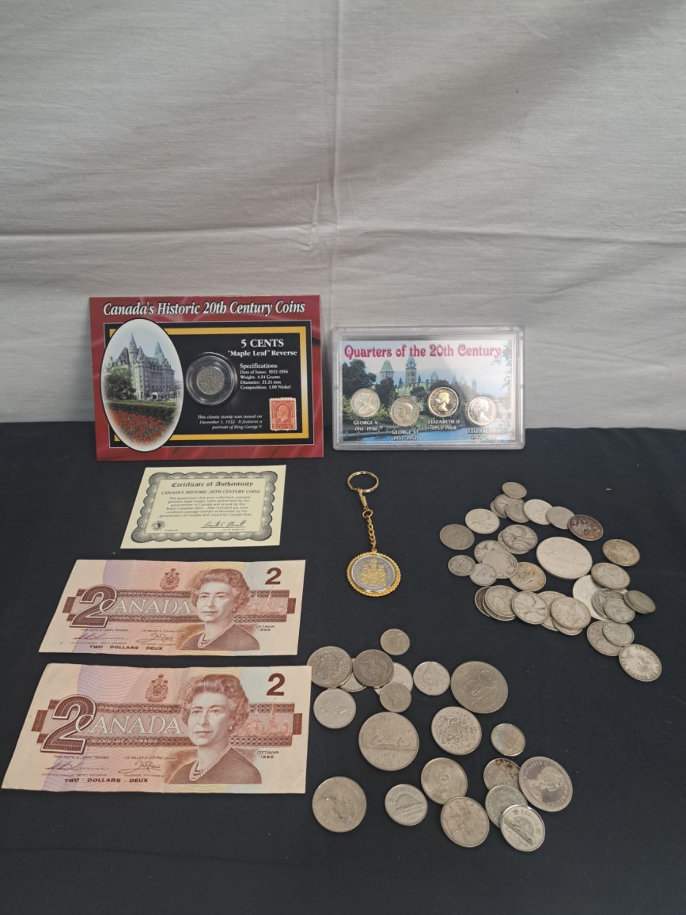 Includes 6 7/8 oz of 1968 & older Coins, Two $2 Bills, Maple Leaf Reserve Nickel, Quarters of the 20th Century & More