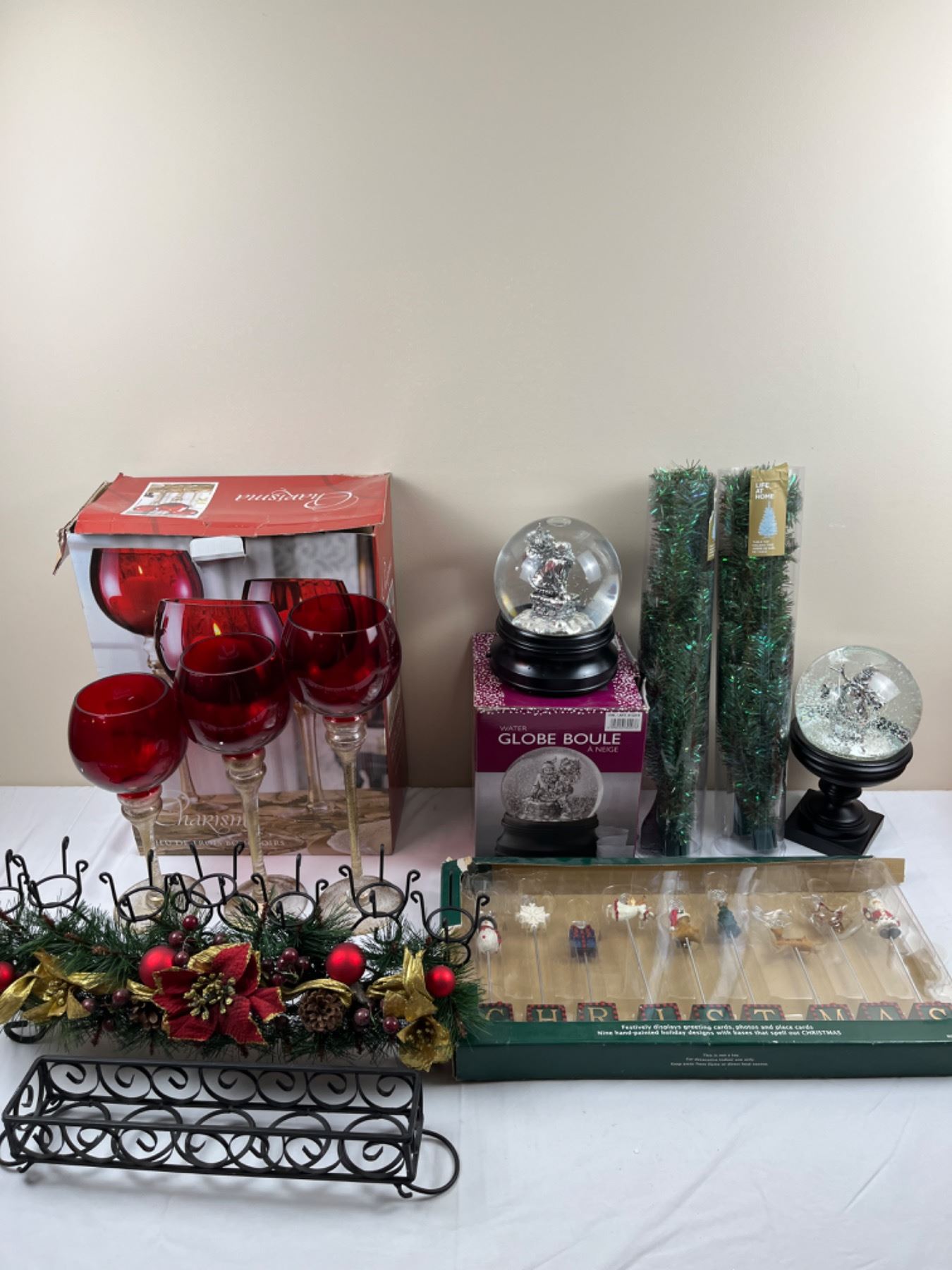 Includes Candle Holders, Snow Globe, Hurricane Glasses & More, One Candle Holder Missing Glass Cups 21" Long