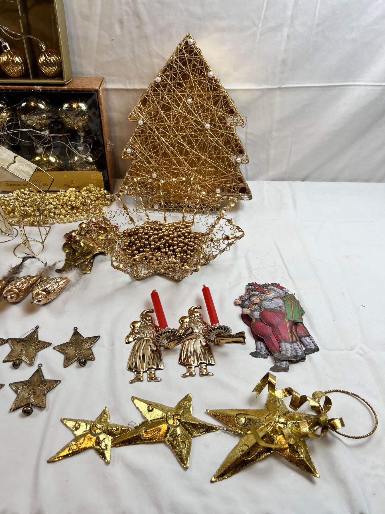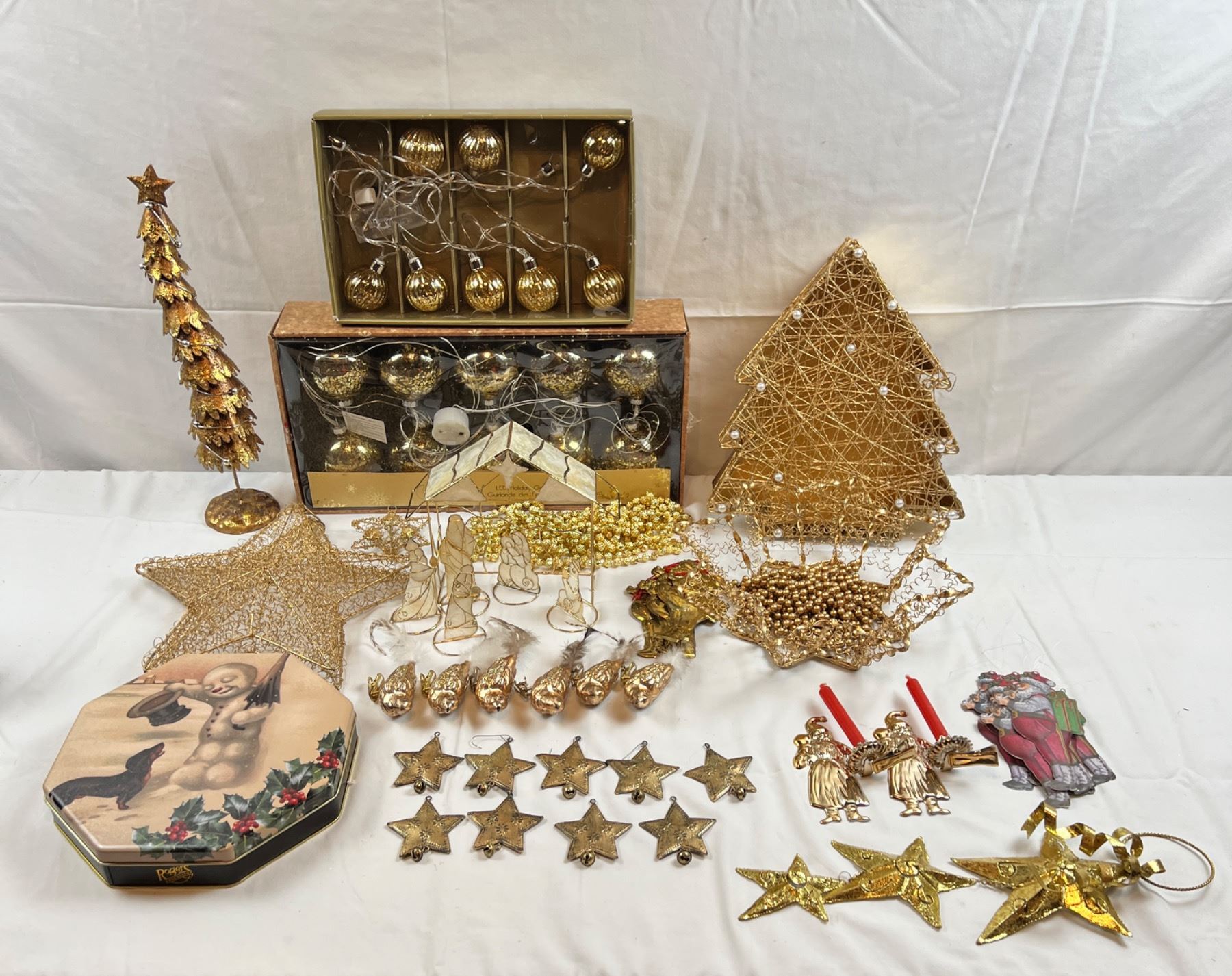 Gold tree stands 16" tall. Includes stars, trees and ornaments. Unknown if lights work, one has no batteries.