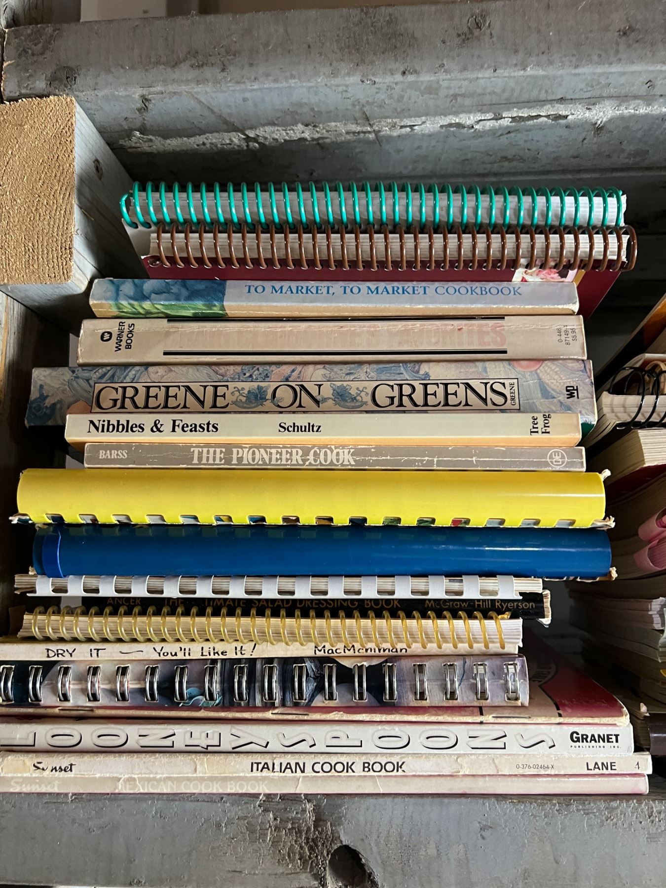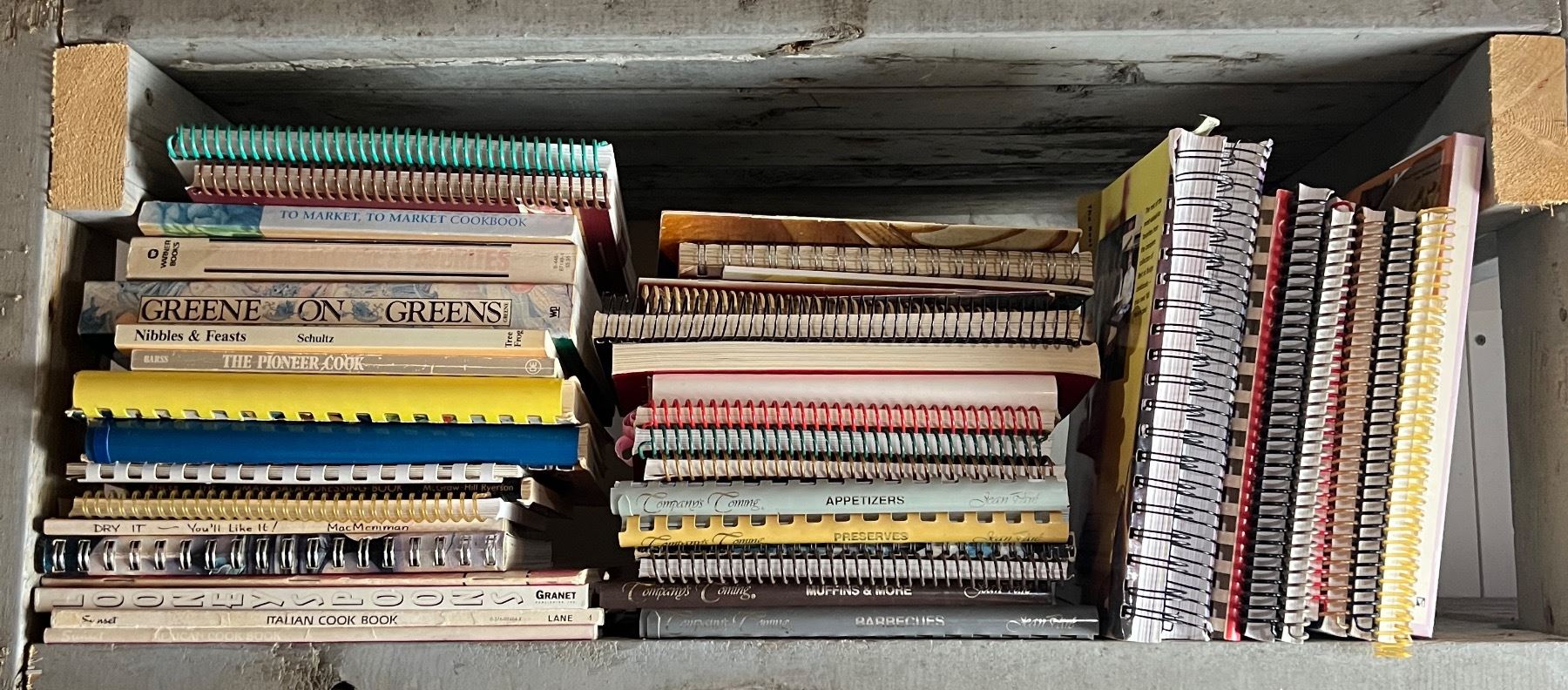Variety of cookbooks in varying levels of wear. Multiple different styles and recipes.