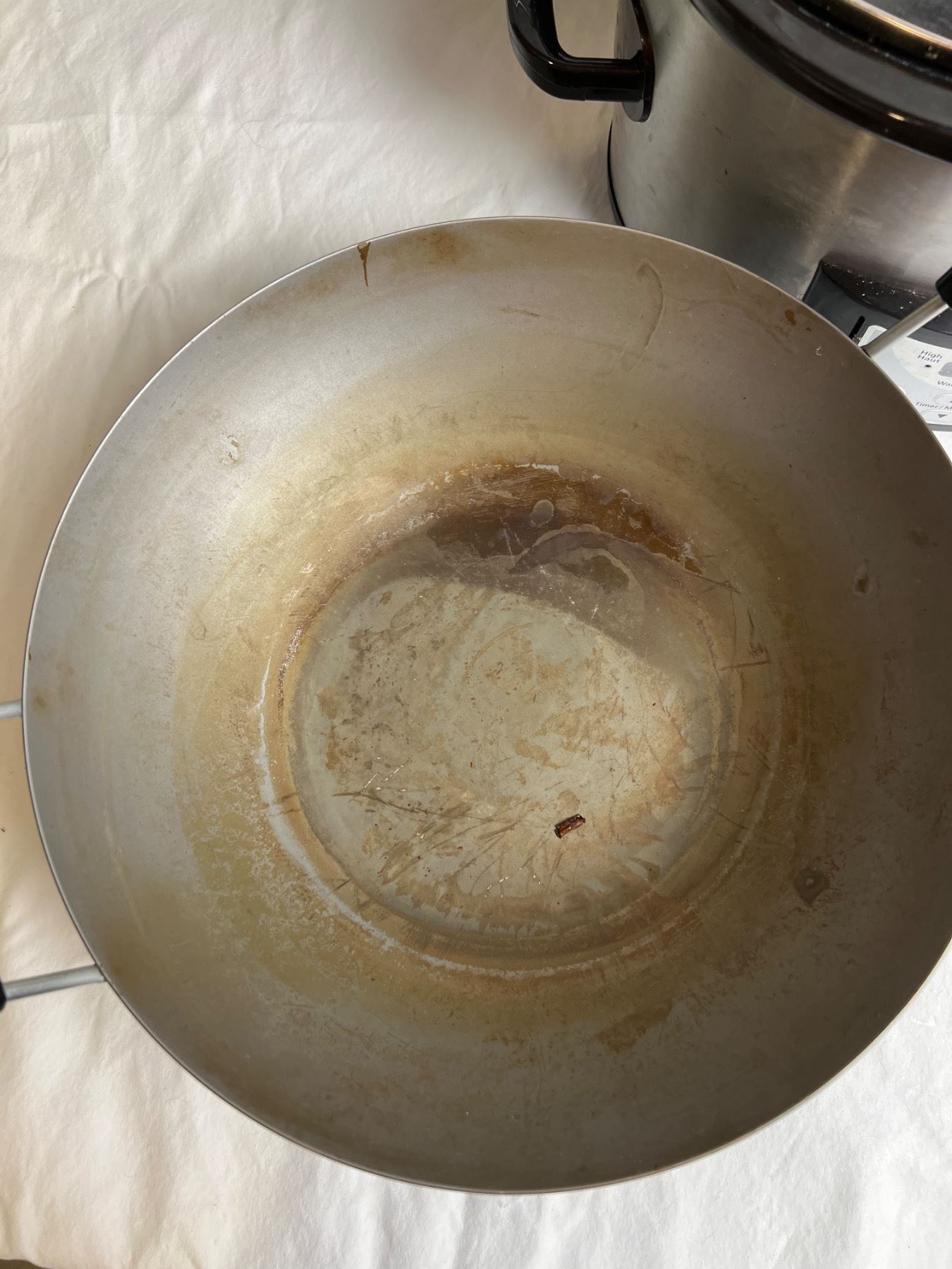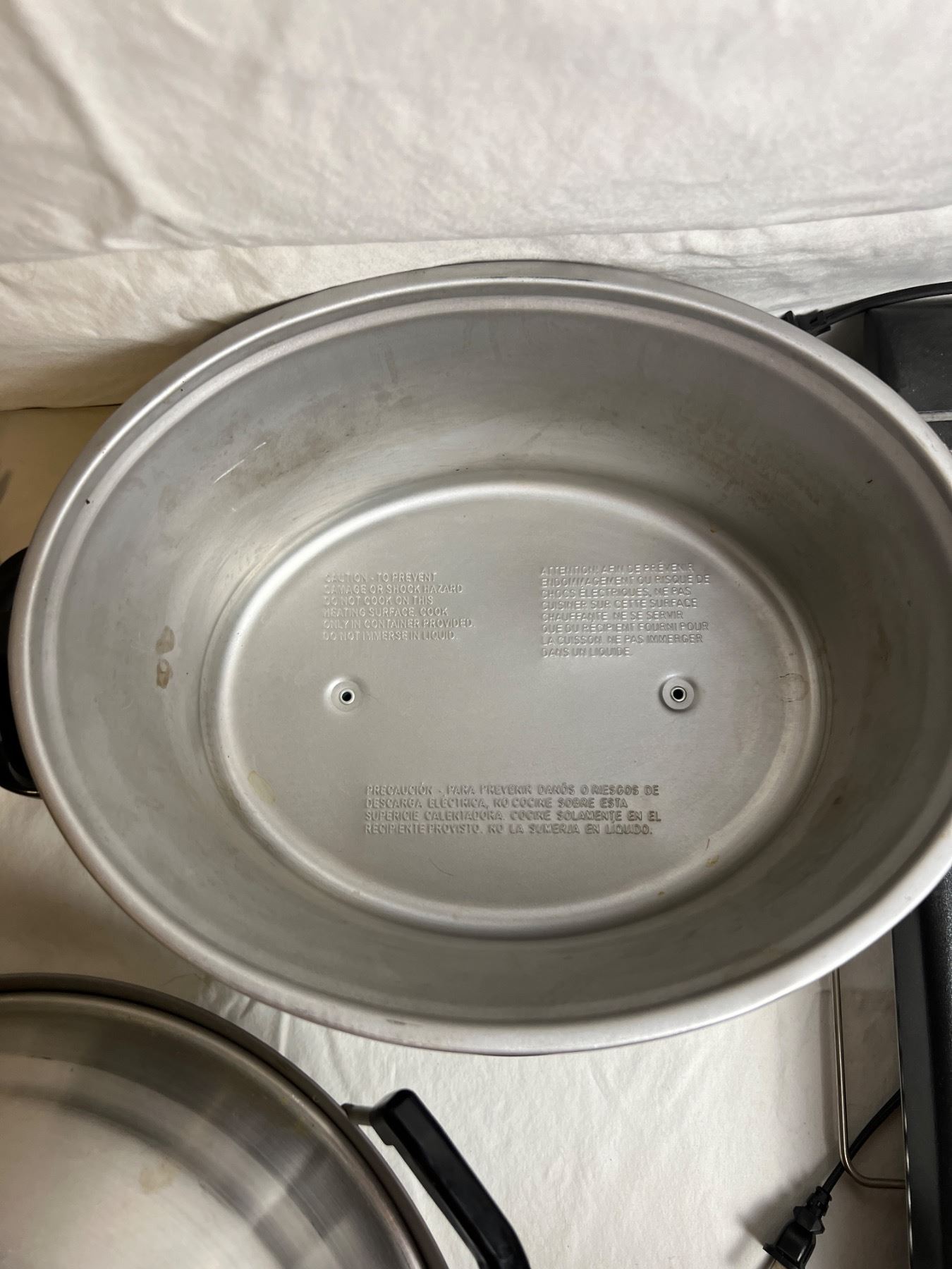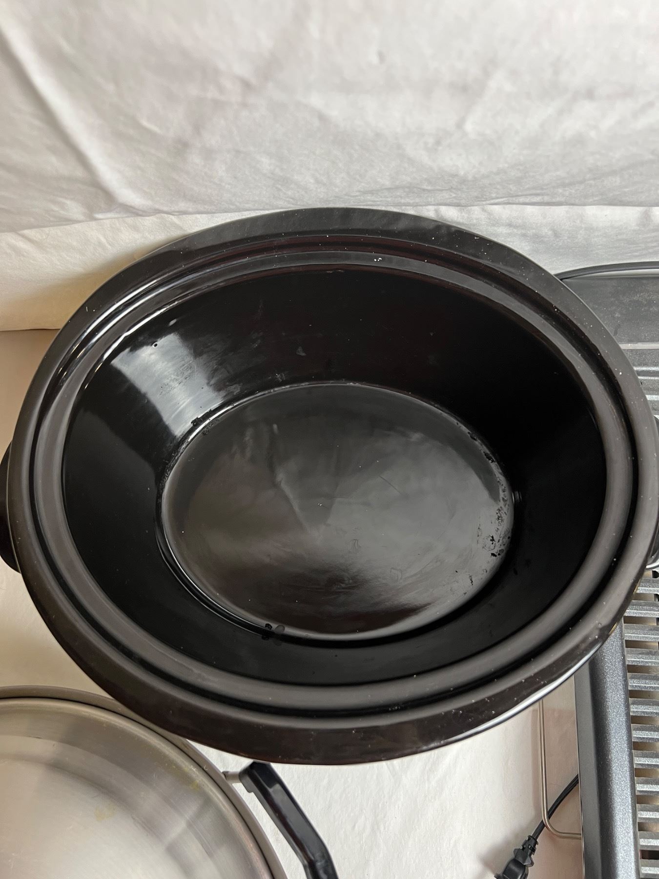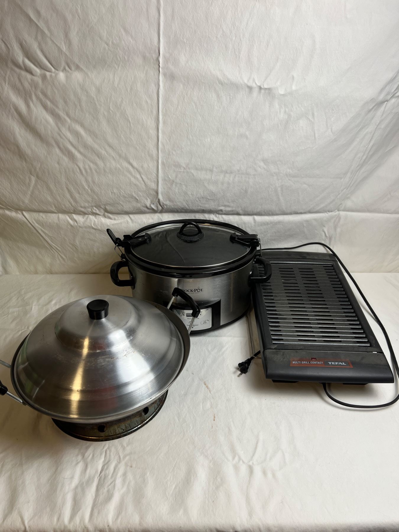 Both Crockpot and Tefal grill power on. Wok has burn marks to interior, bottom of base and burner.