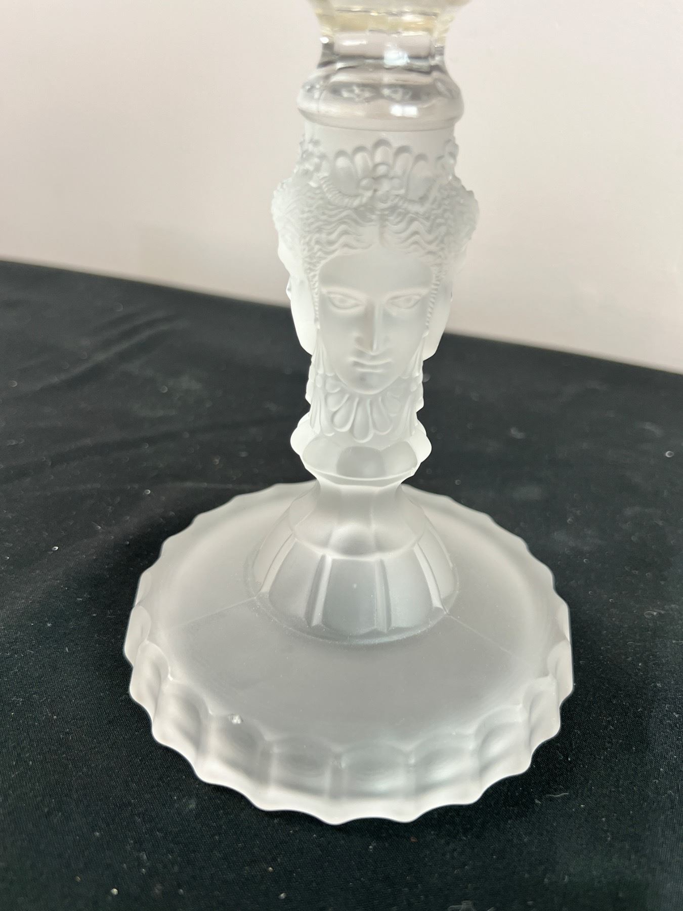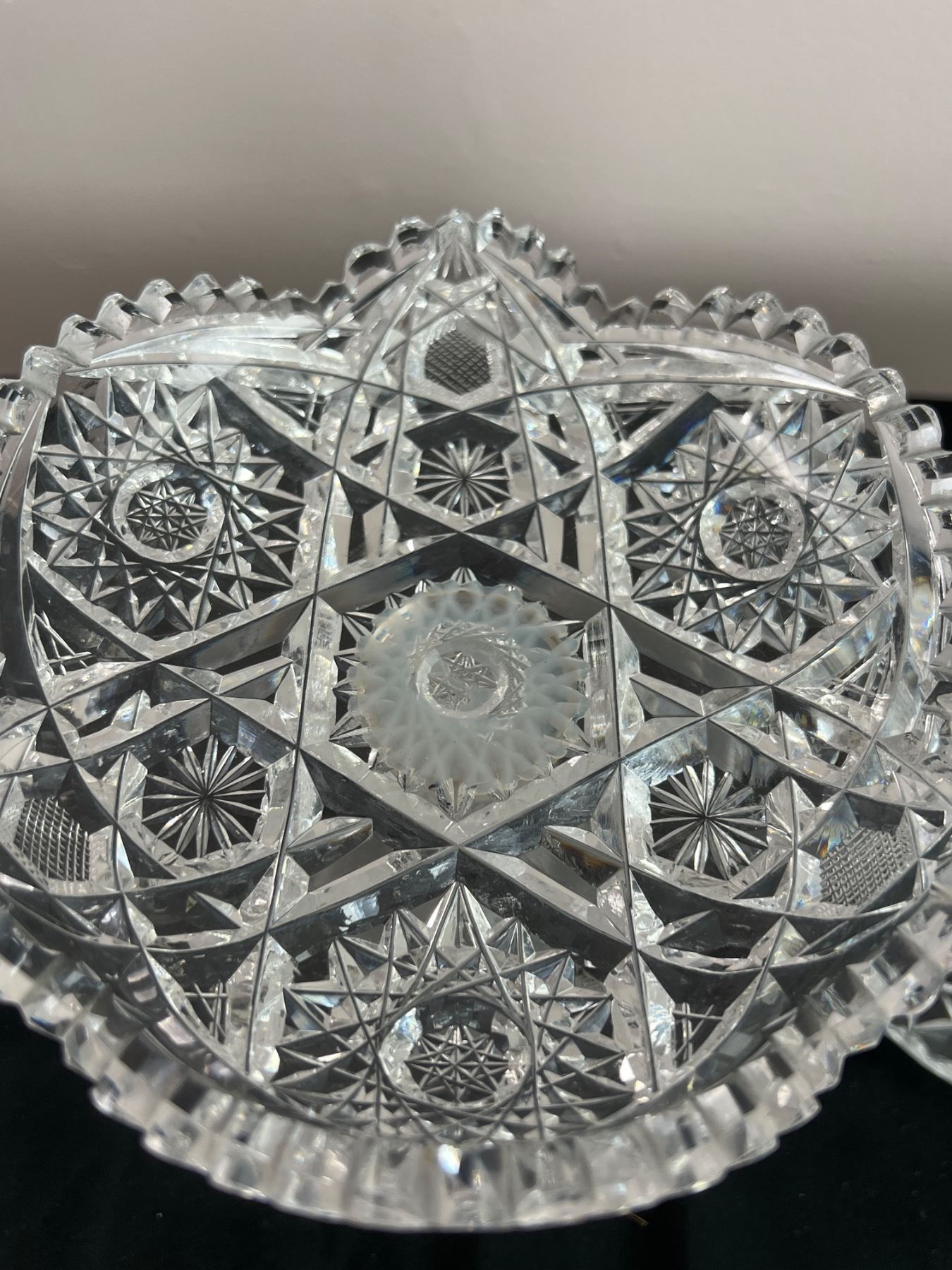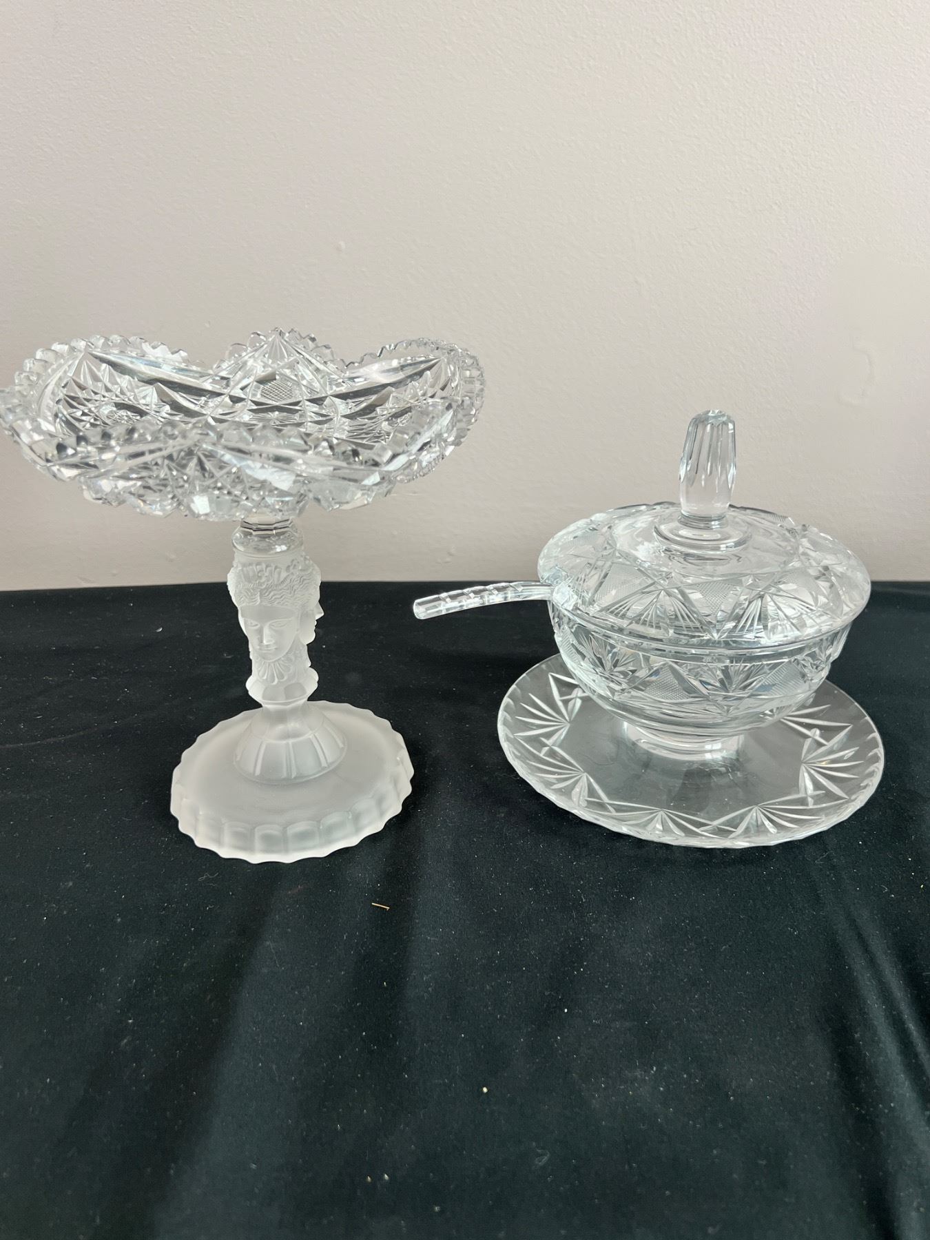 One large relish server and candy dish. Candy dish is 7" in diameter and 7" in height. Candy dish has decorative women's faces around stem.