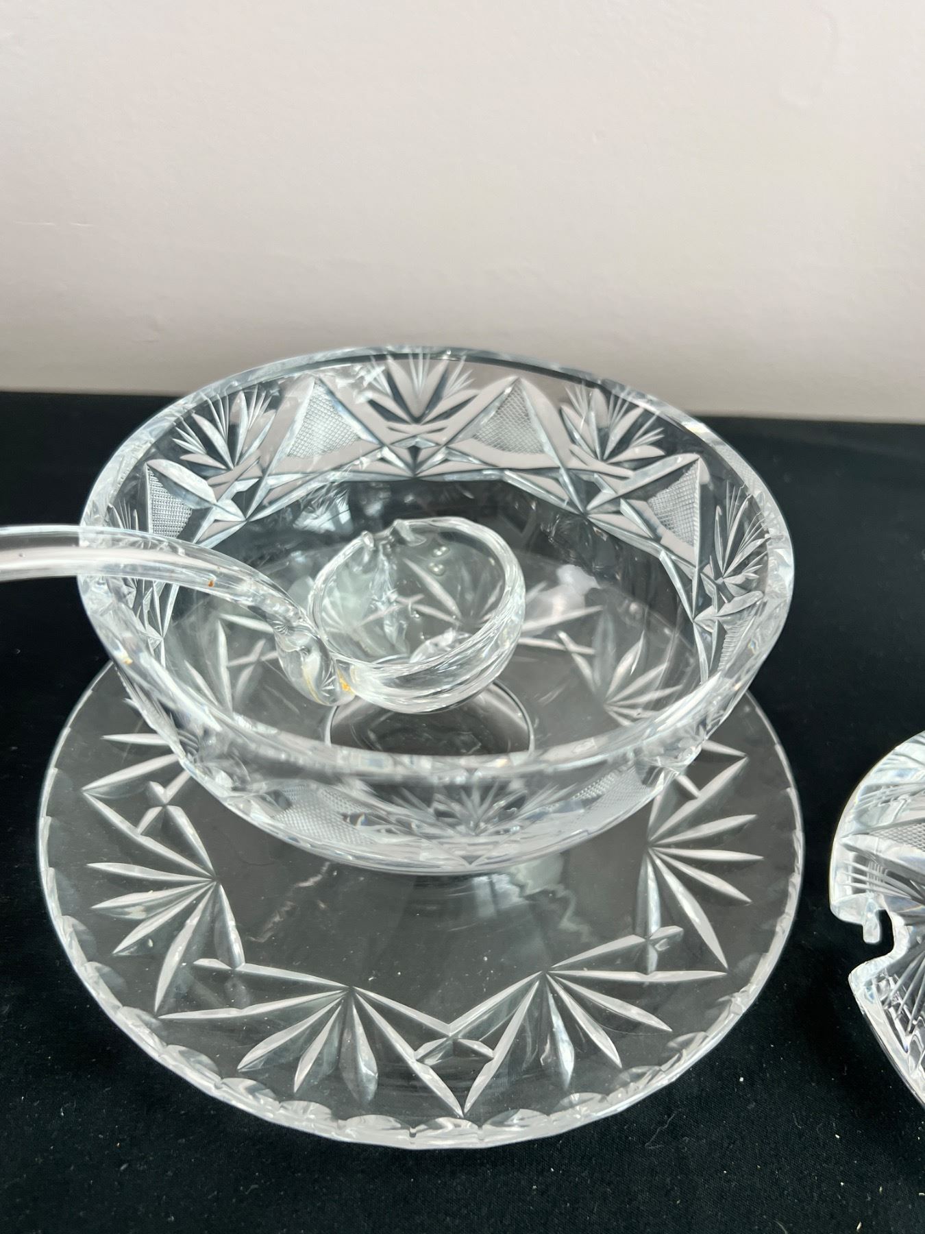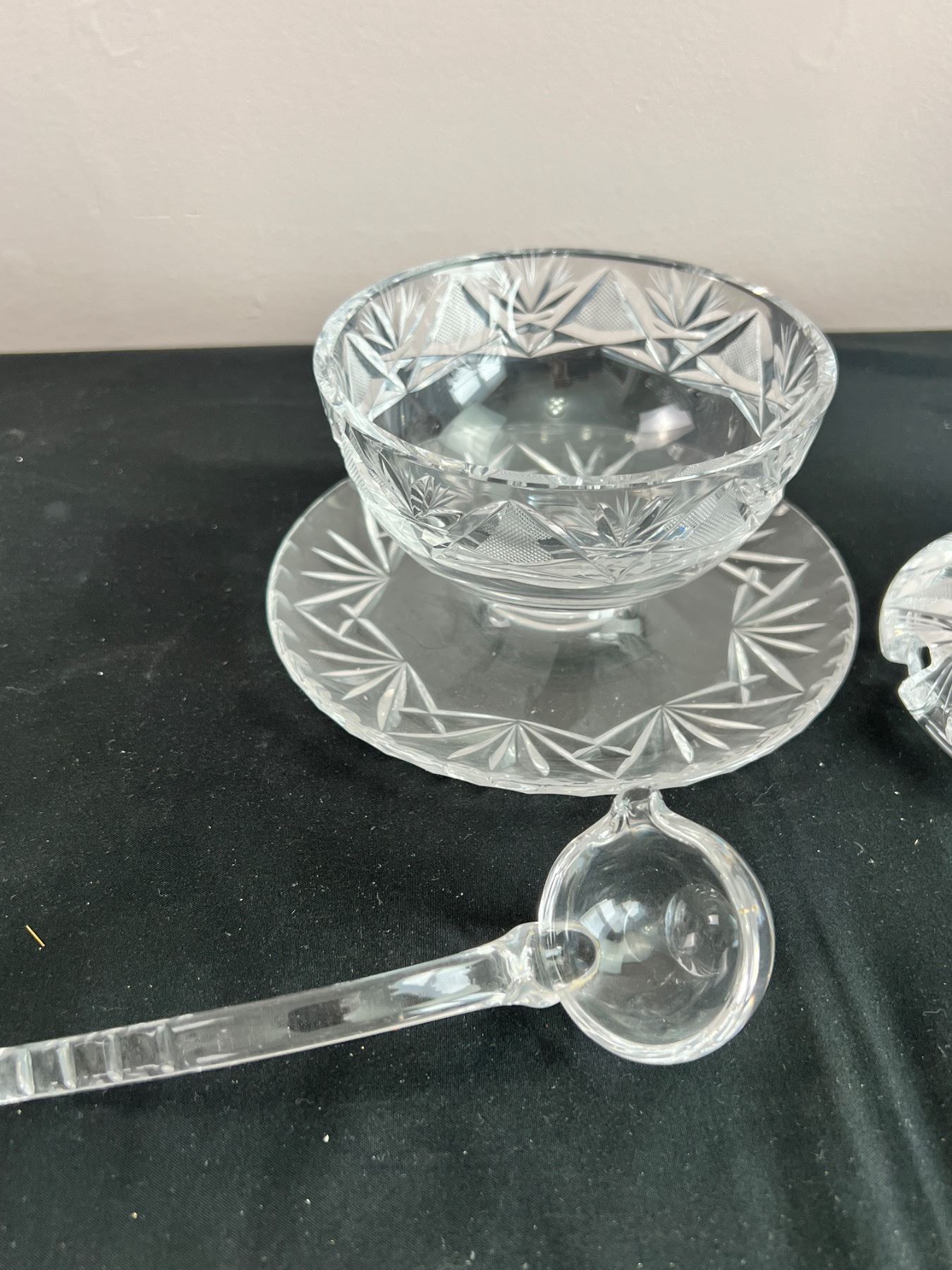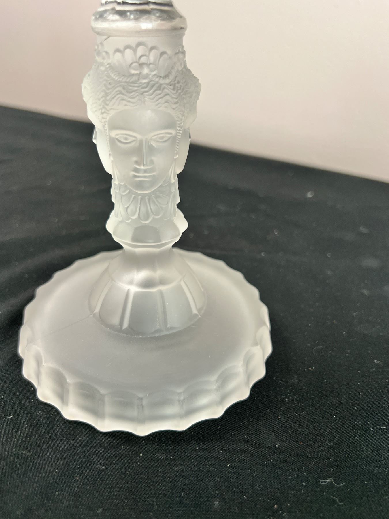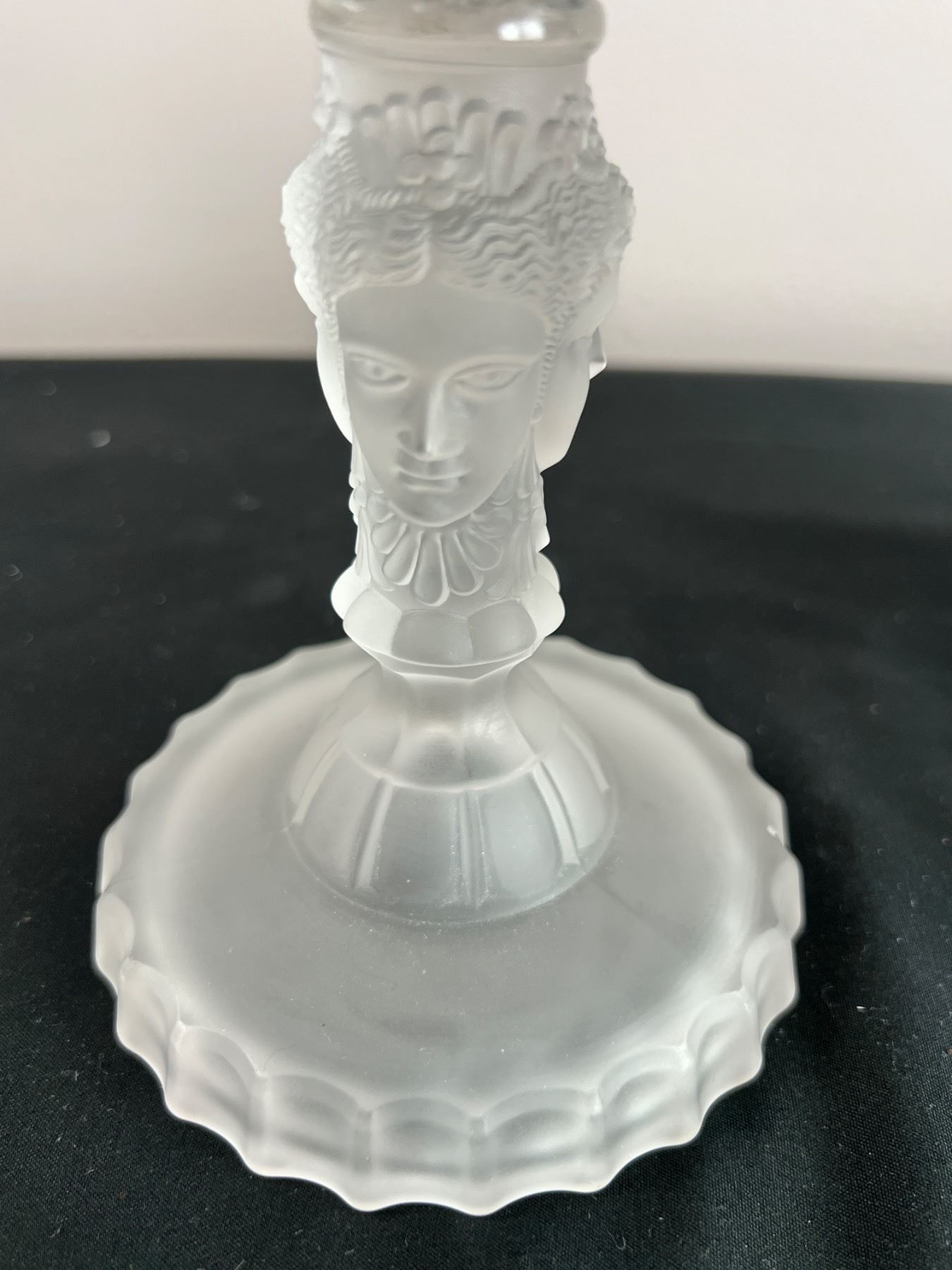 One large relish server and candy dish. Candy dish is 7" in diameter and 7" in height. Candy dish has decorative women's faces around stem.
