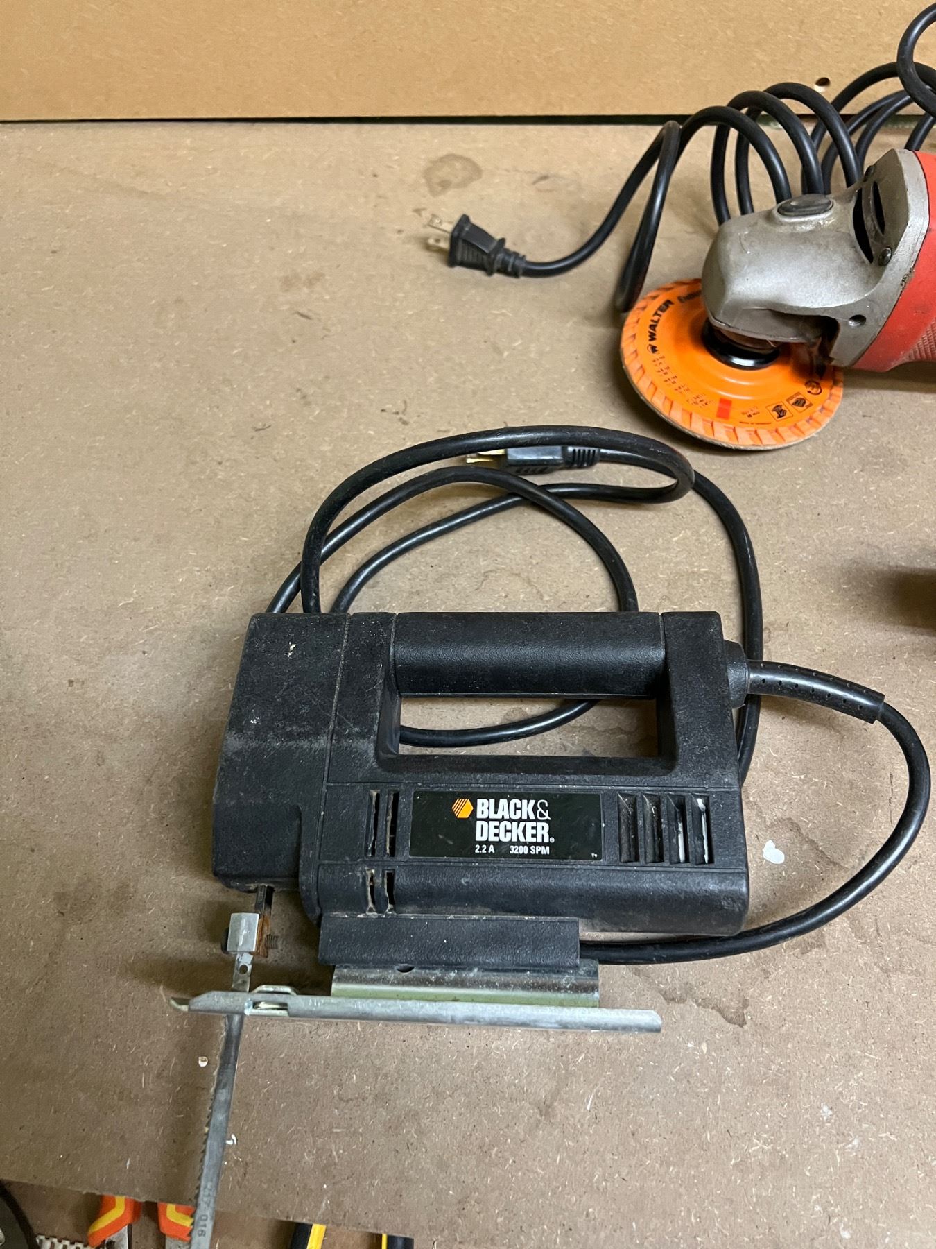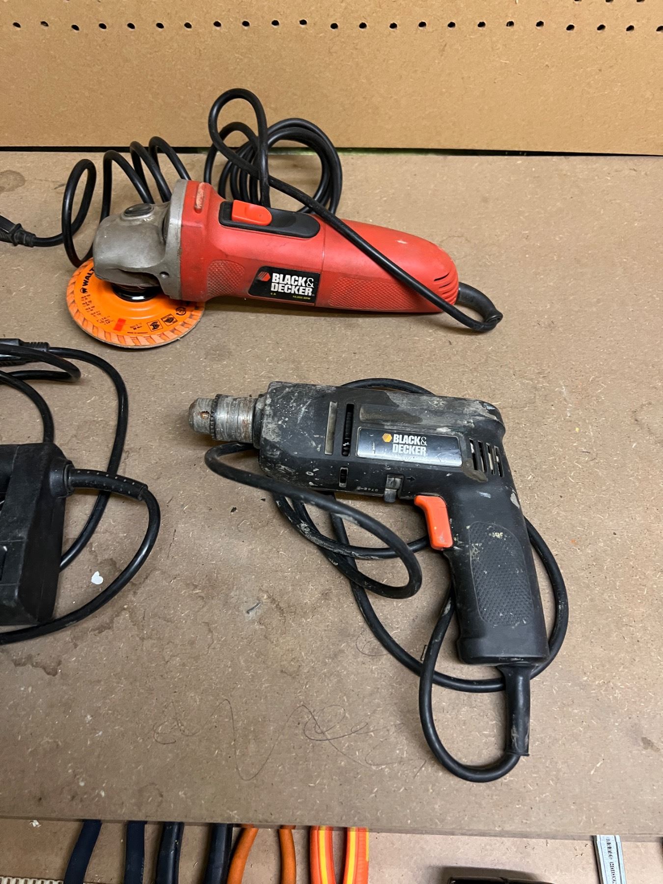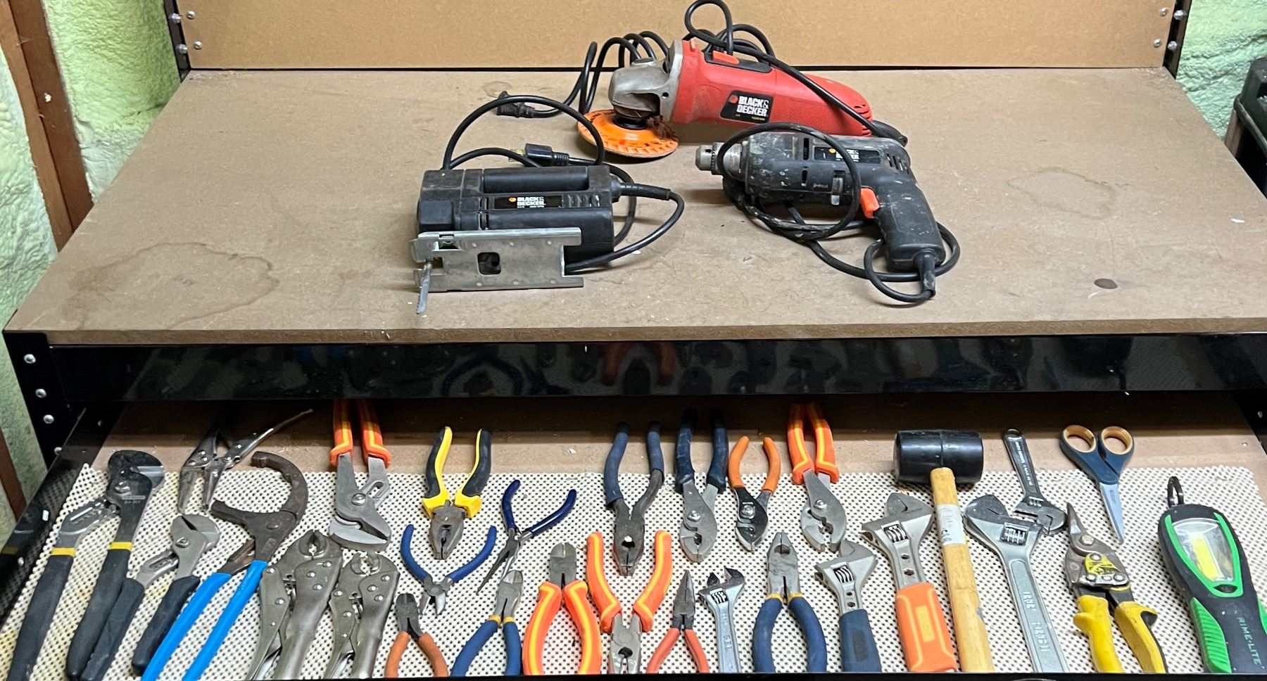 Variety of wear to hand tools. All power tools turn on.