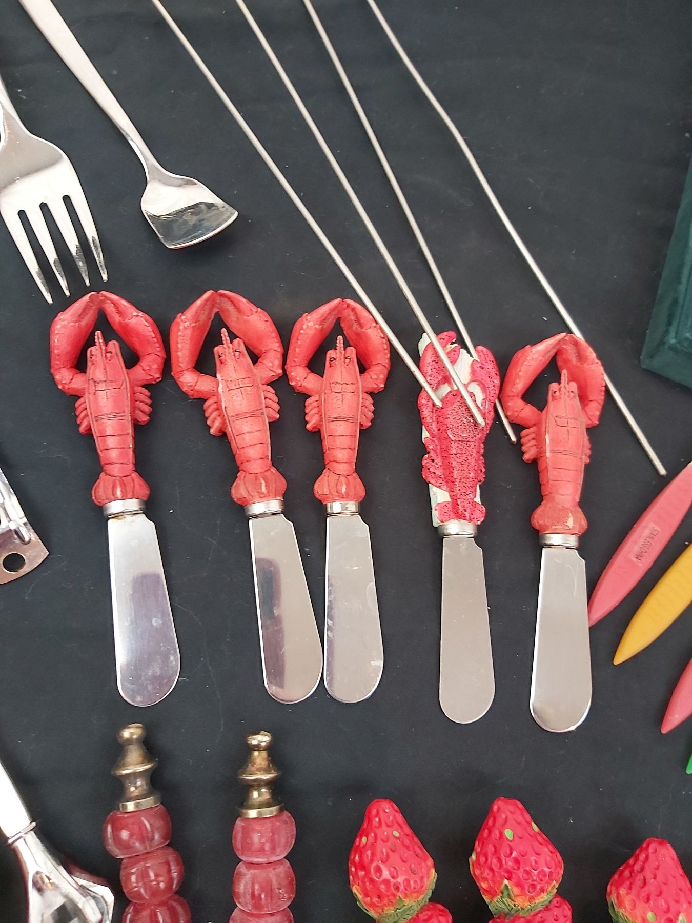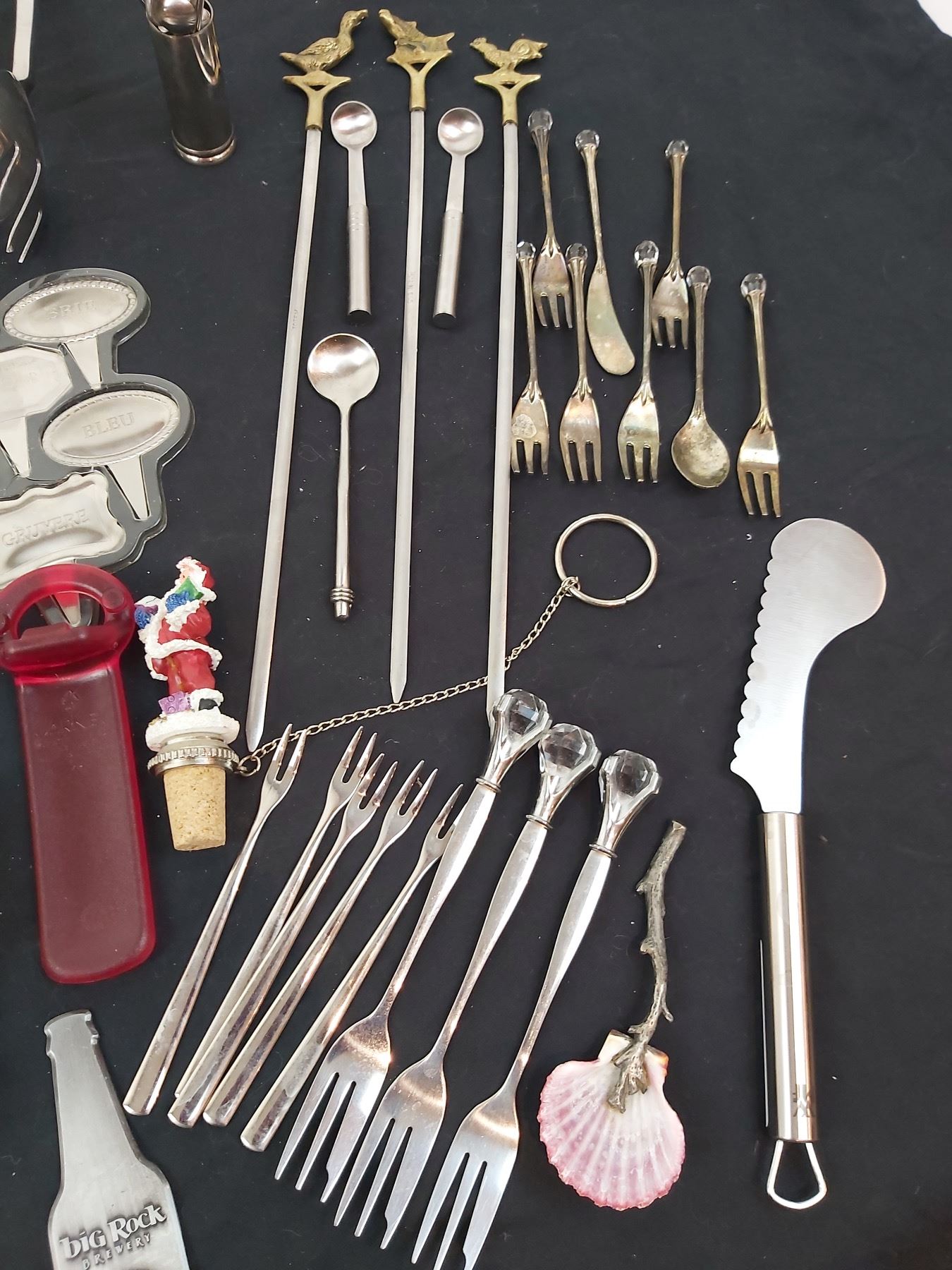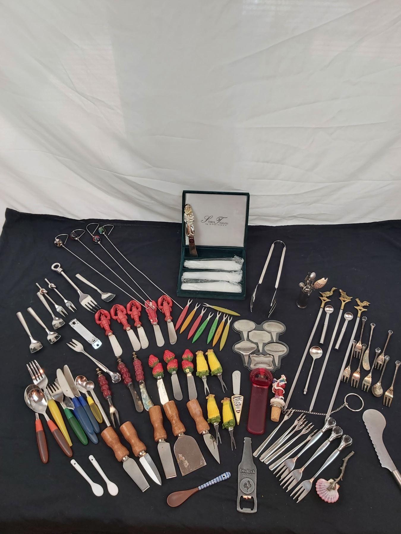 Includes various skewers, cheese knives and markers, orderve utensils, Silver Treasures by Godinger, etc.