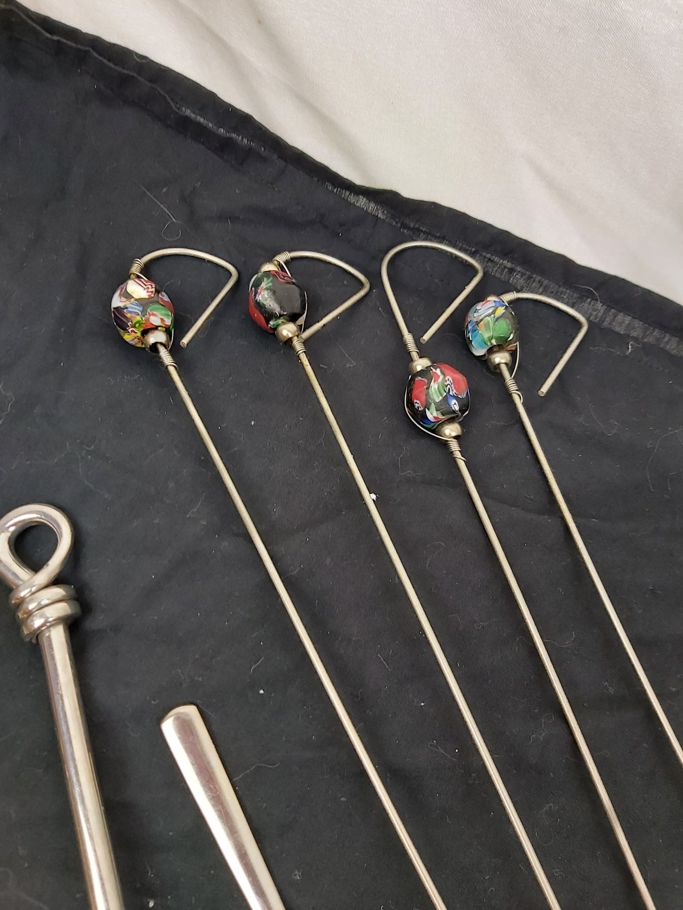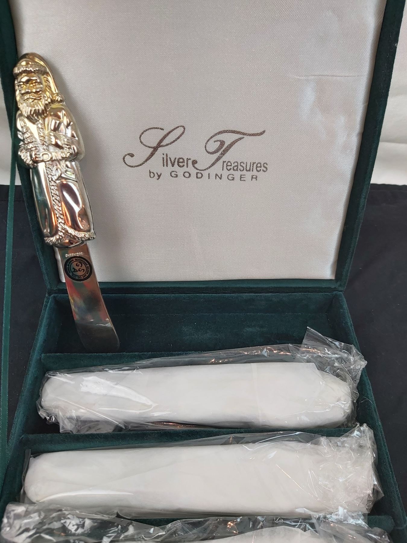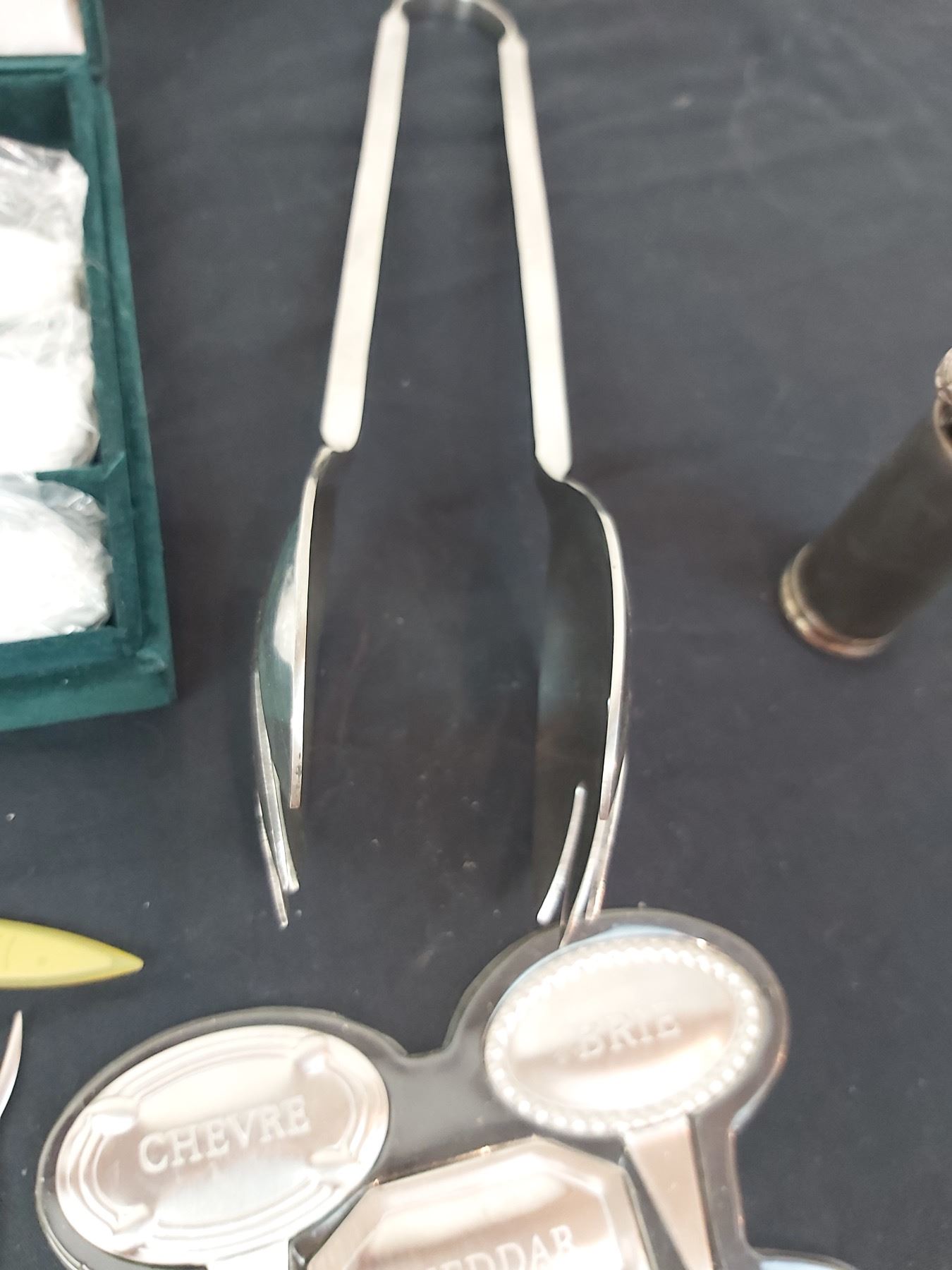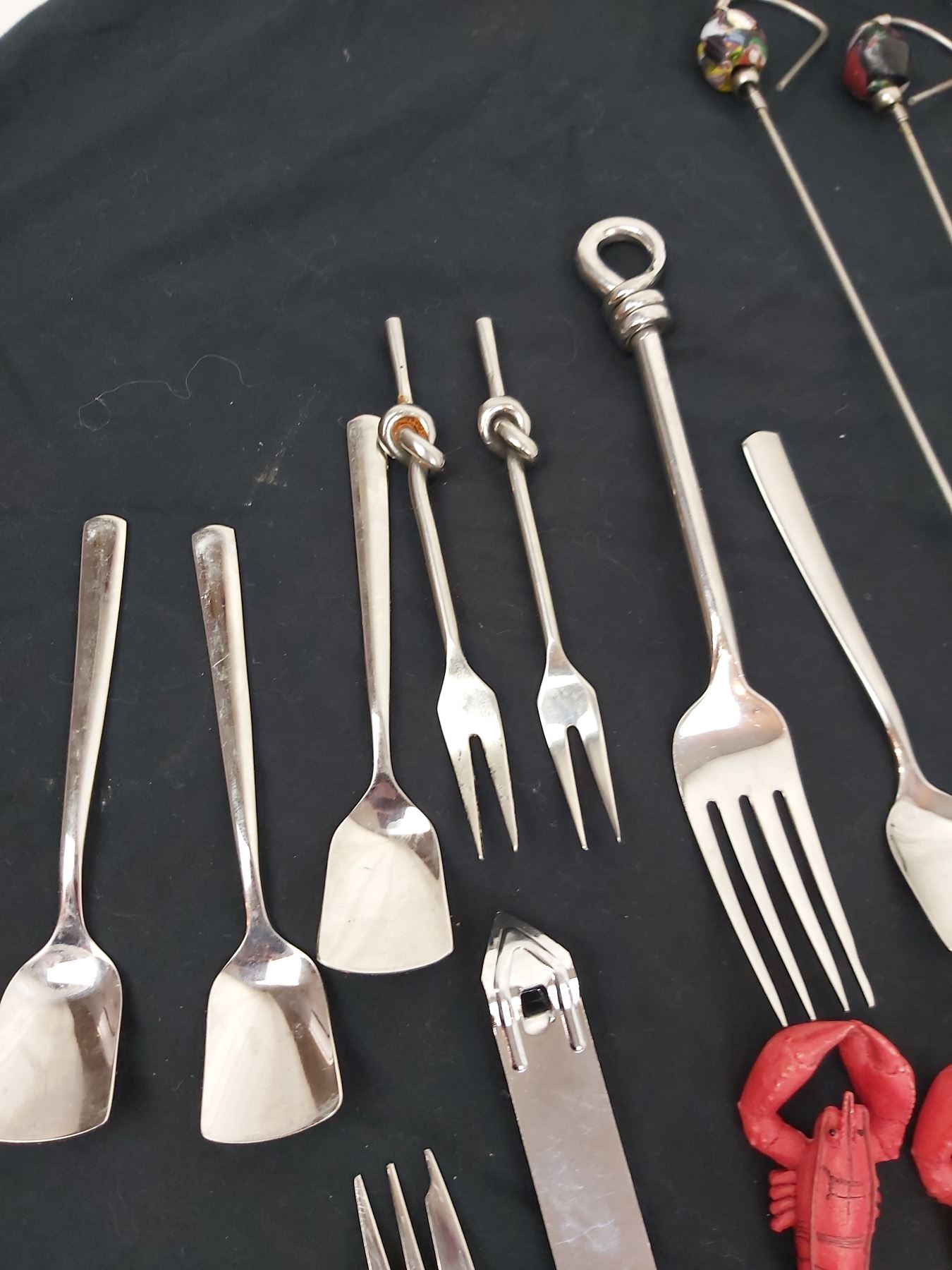 Includes various skewers, cheese knives and markers, orderve utensils, Silver Treasures by Godinger, etc.