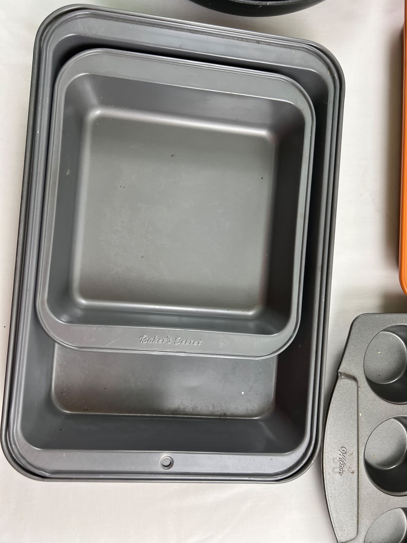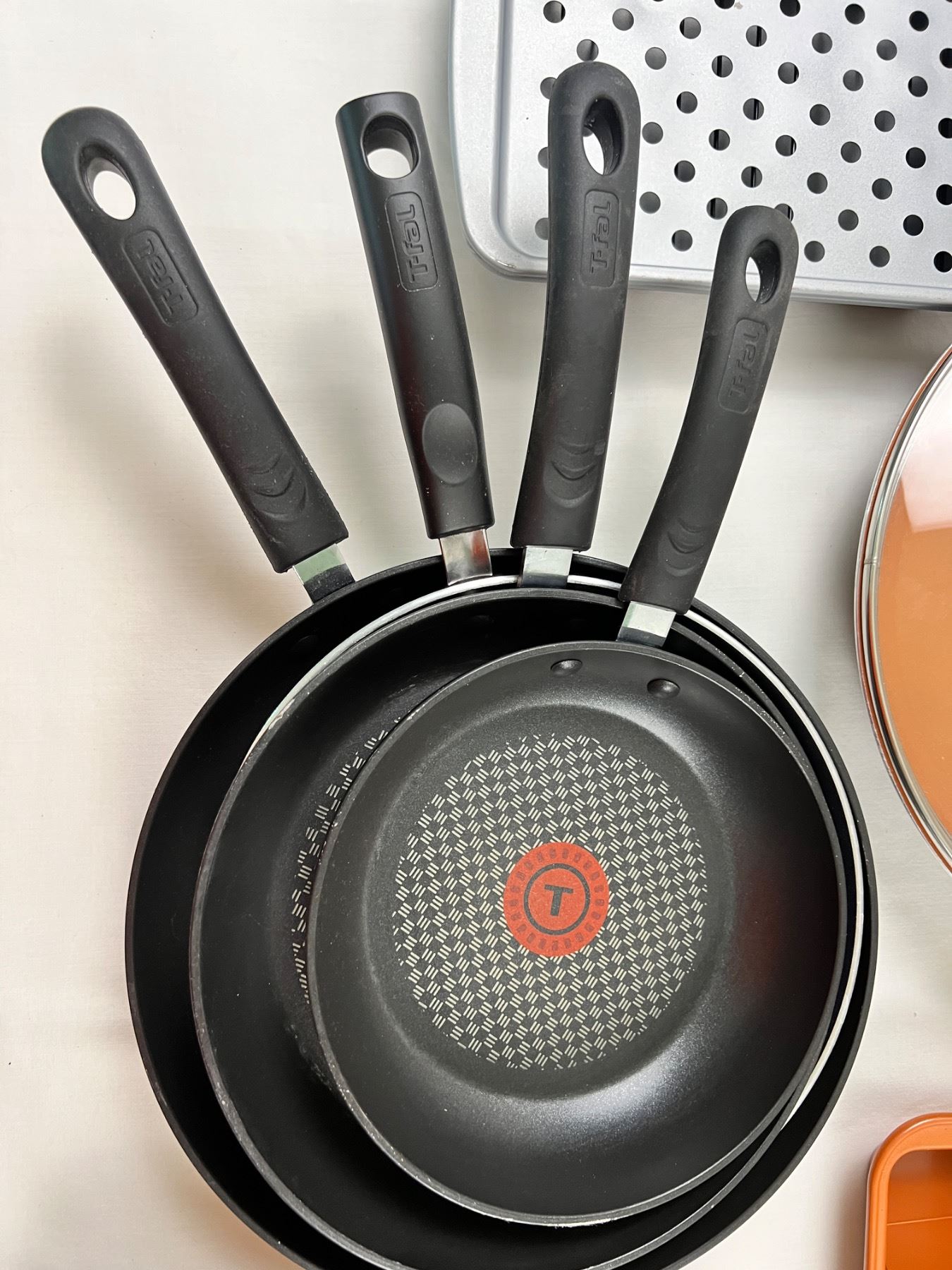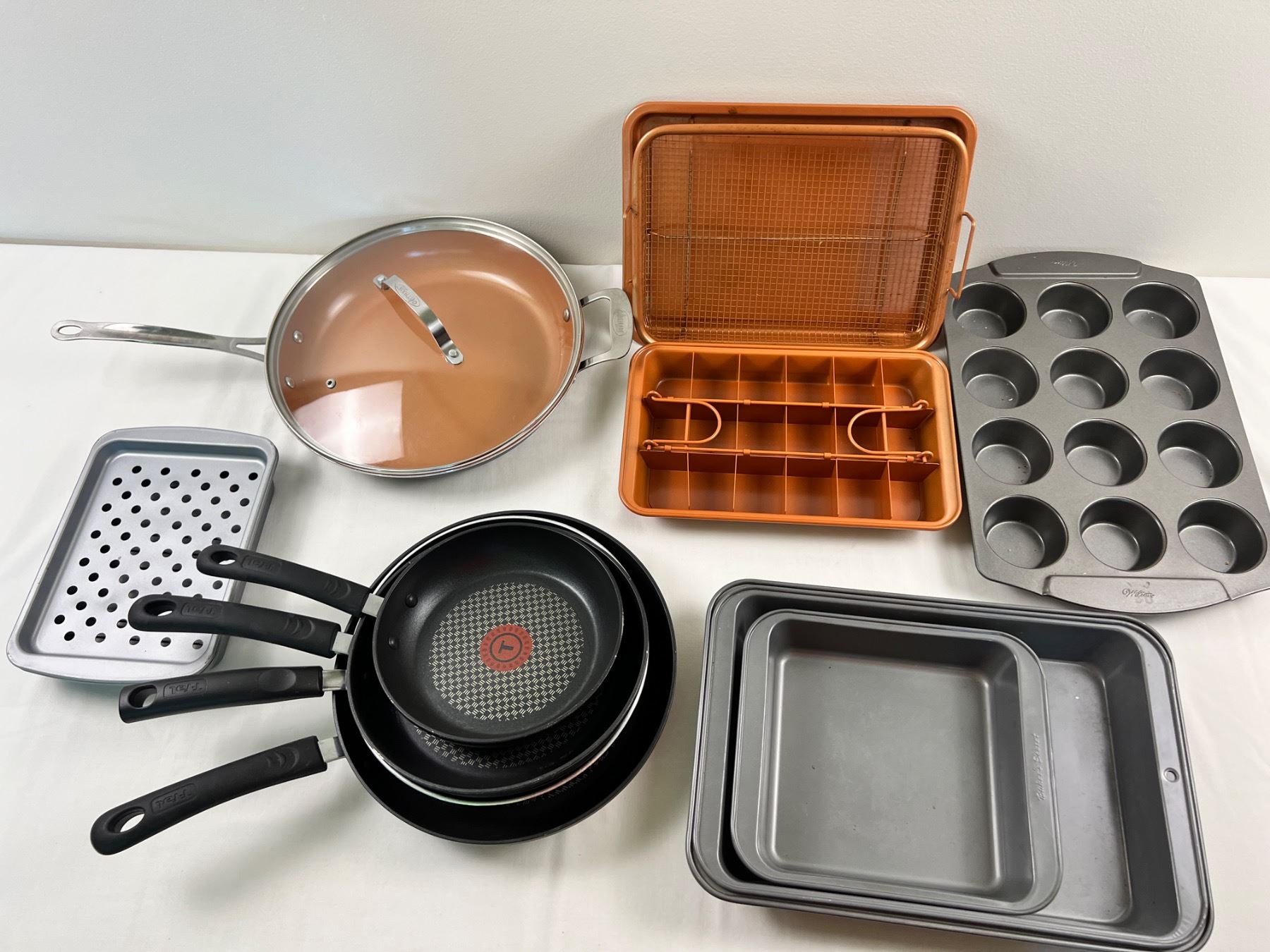 Includes Gotham Steel frying pan measures 12', Wilton muffin pan, 5 T-Fal pans, and more