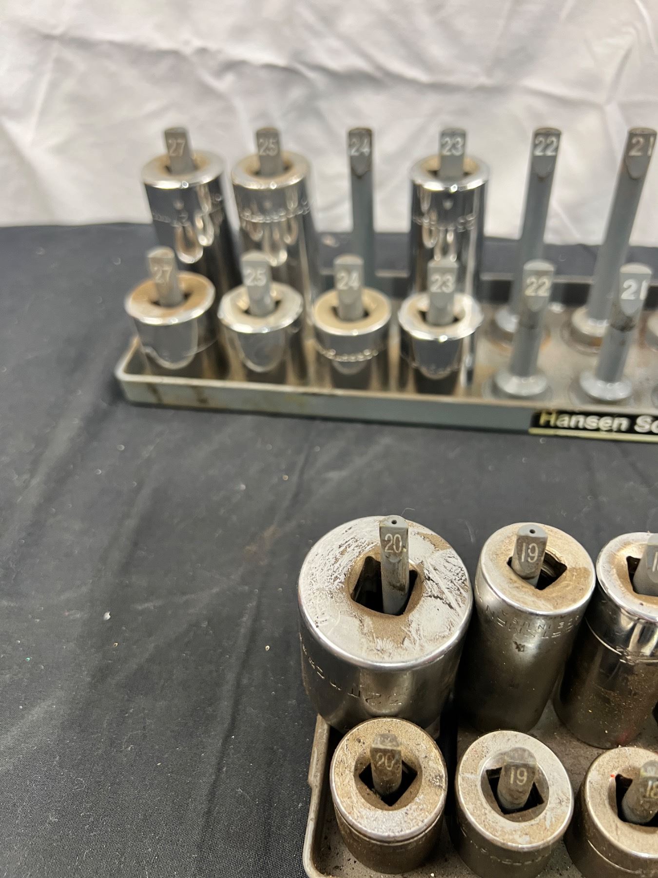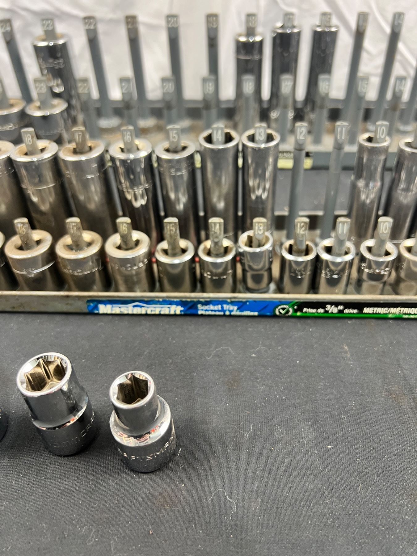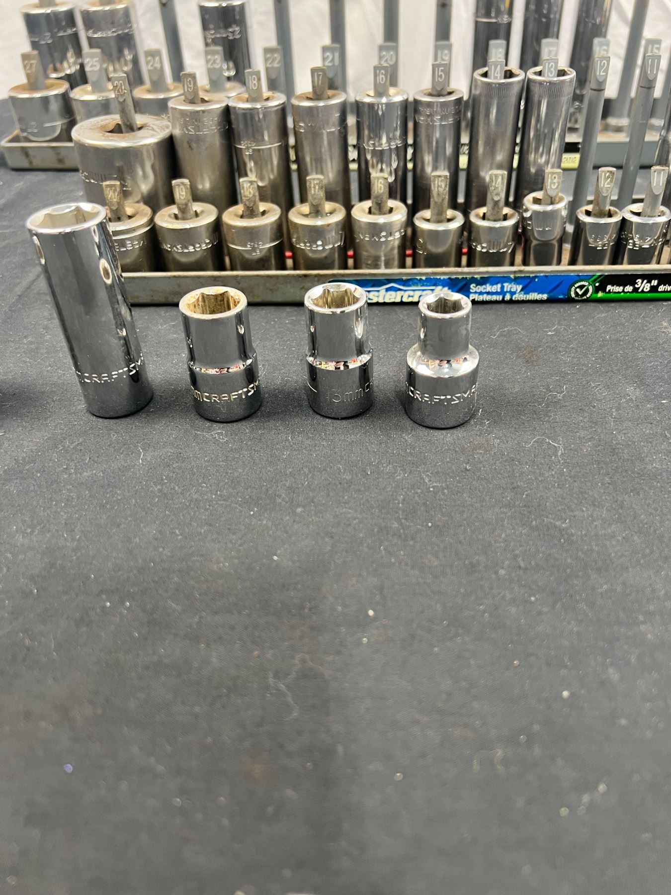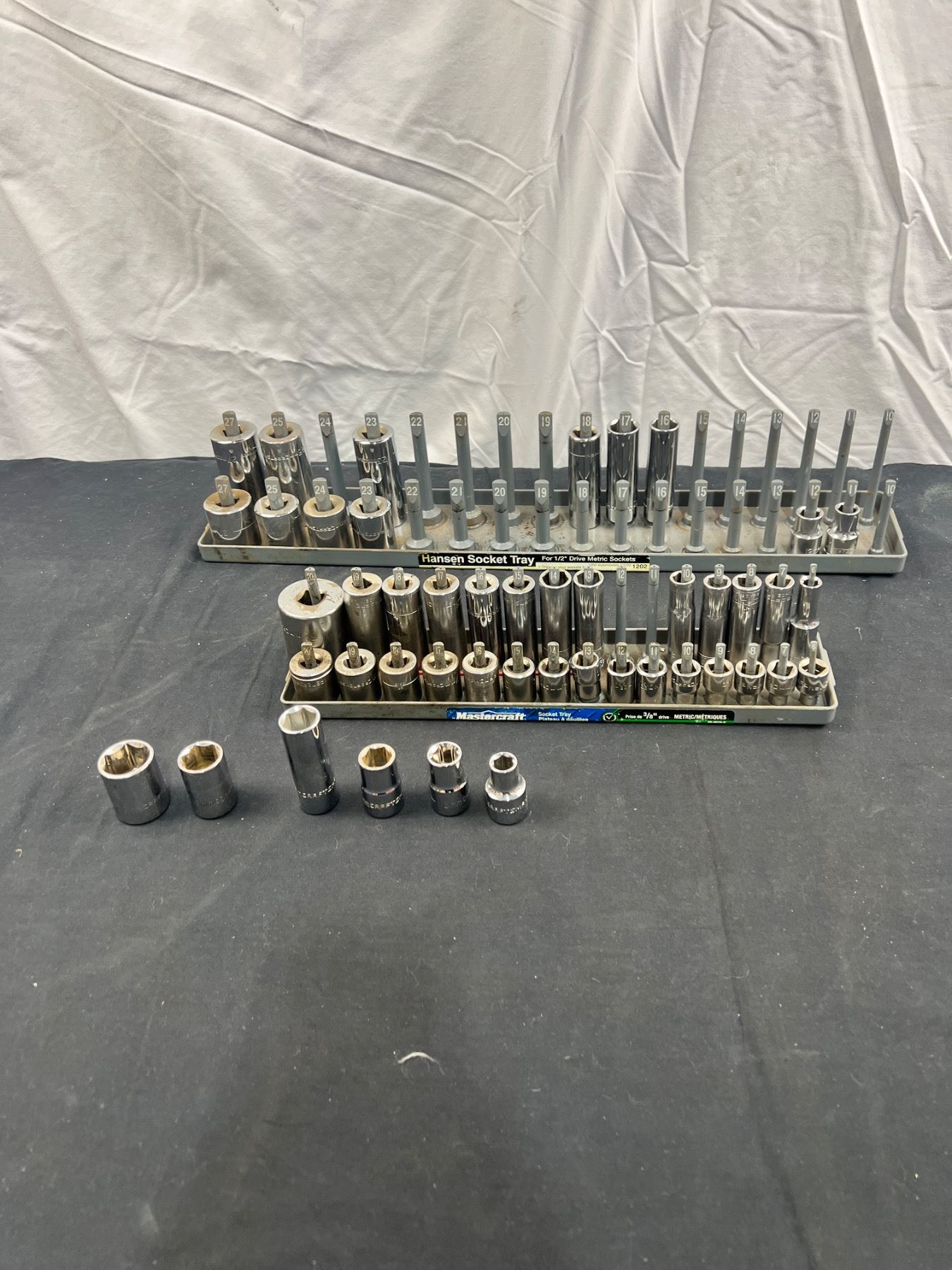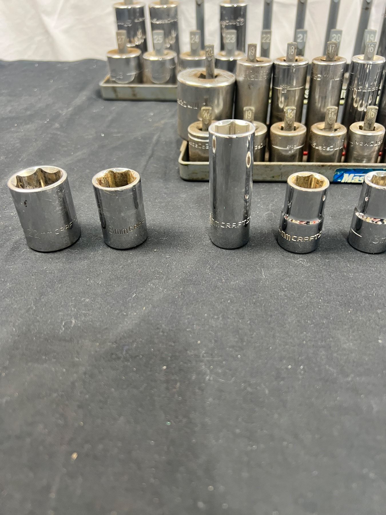 Assorted sockets from varying brands in varying states of wear. Includes two socket organizers.