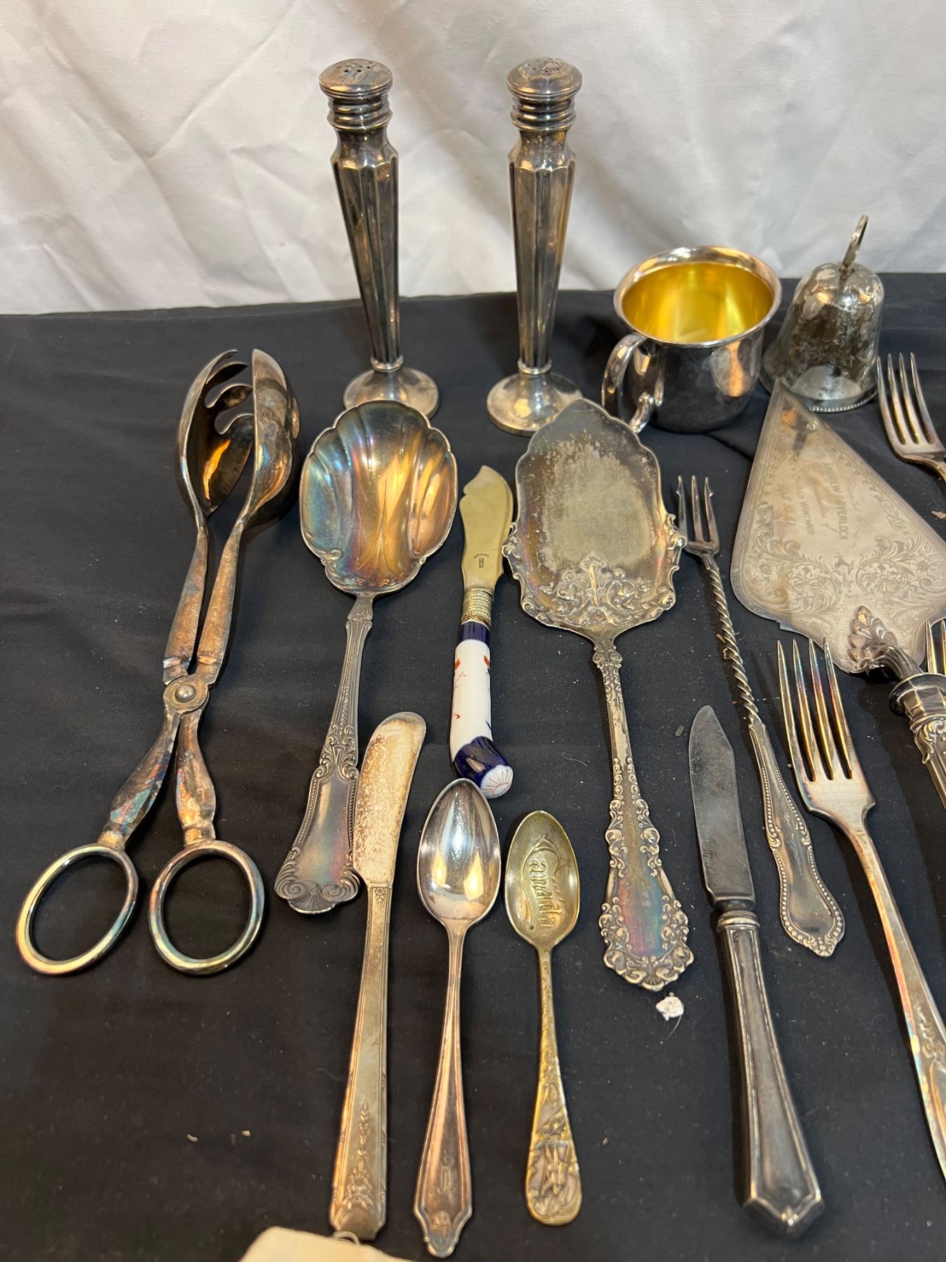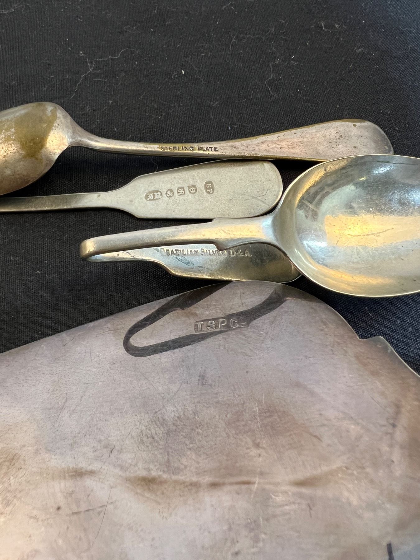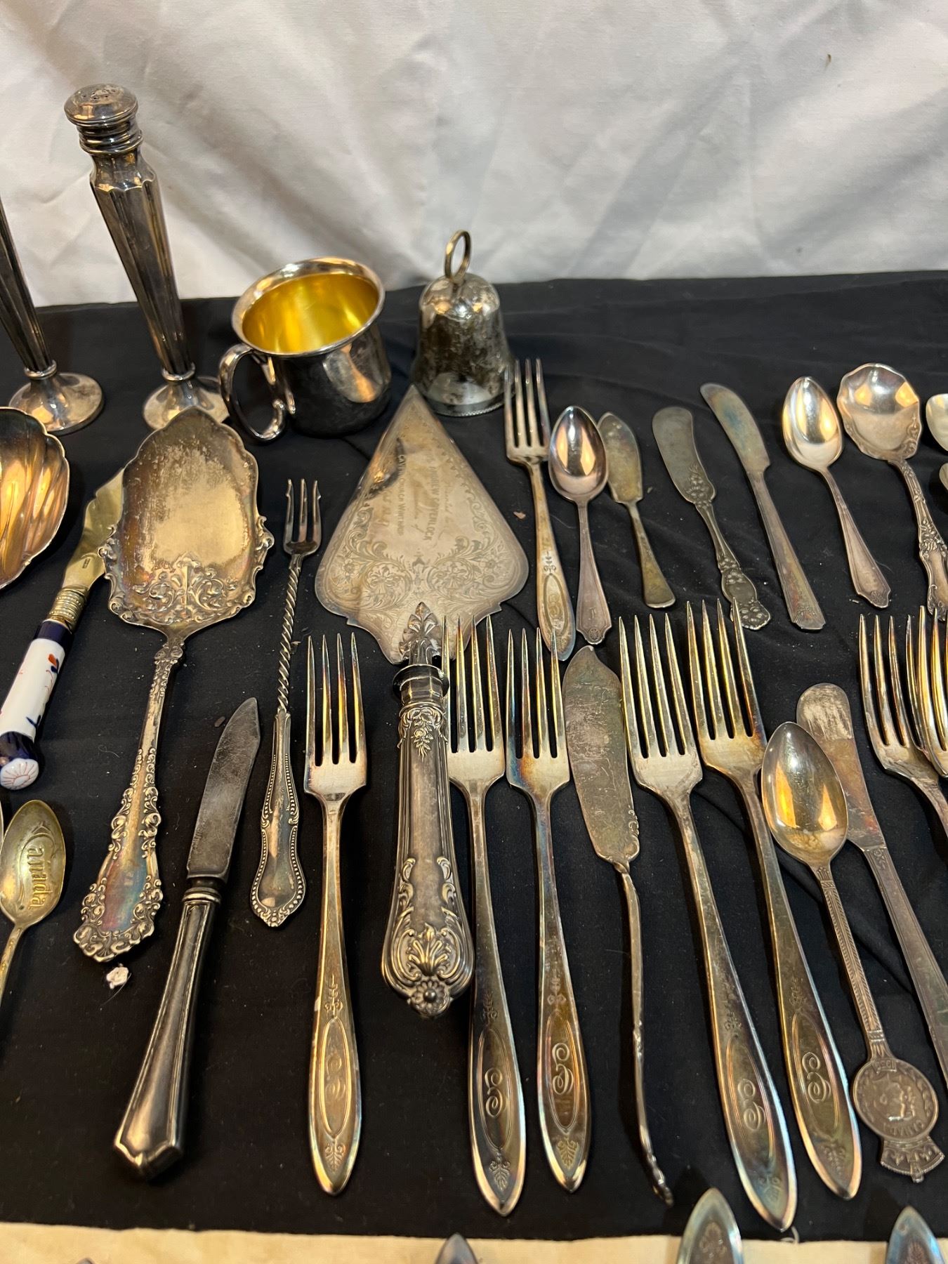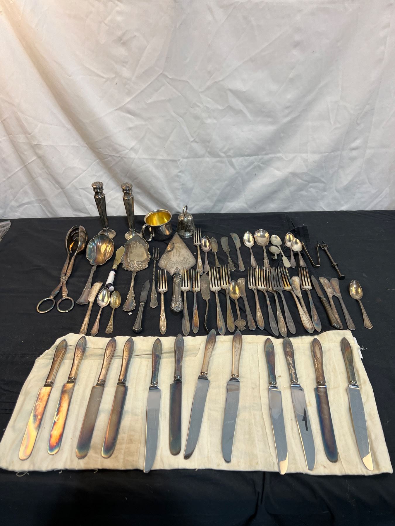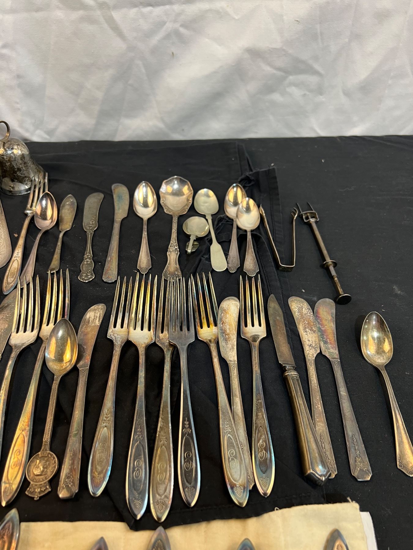 Various brands but largely Community Plate. Varying levels of tarnish to pieces. One piece is sterling plated.