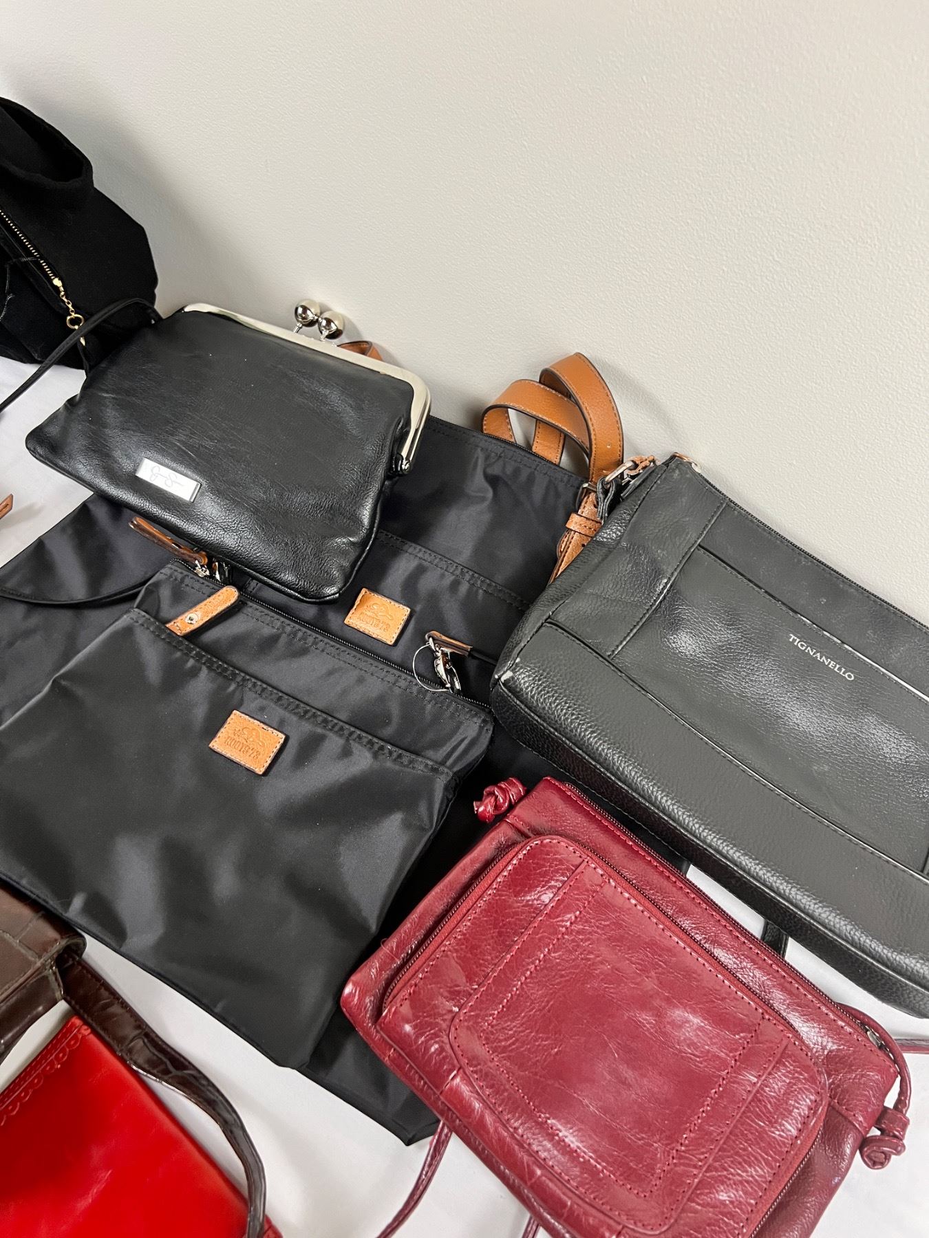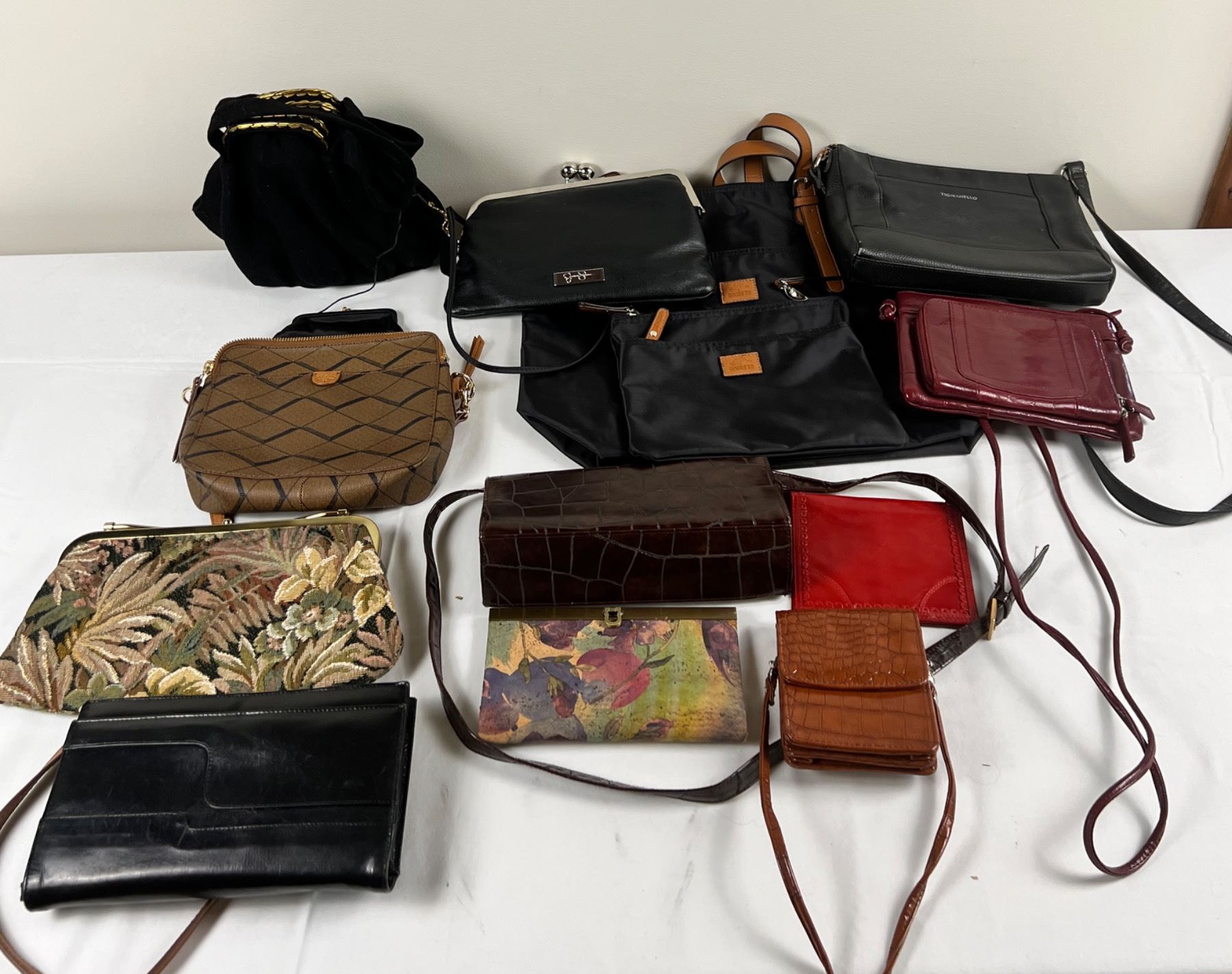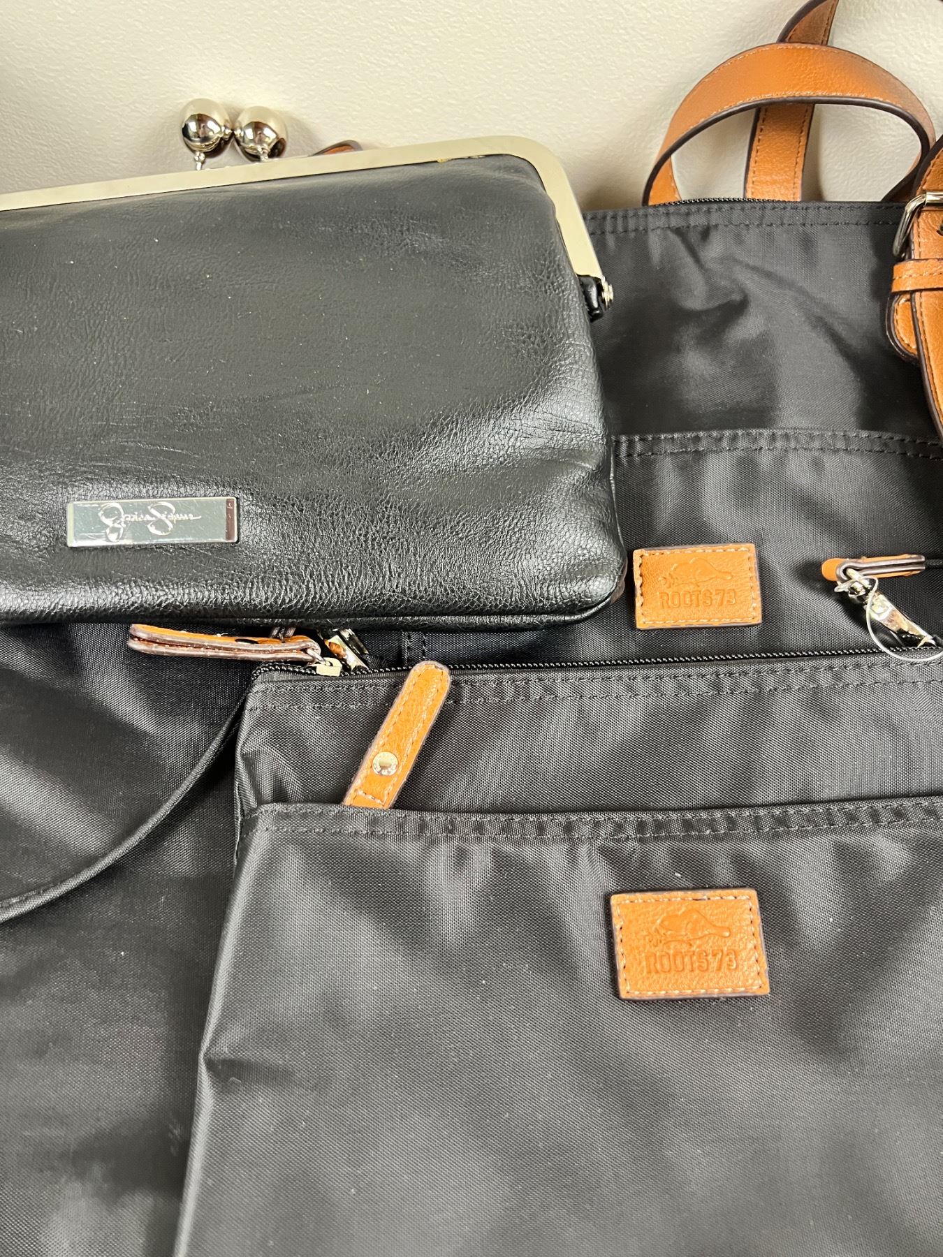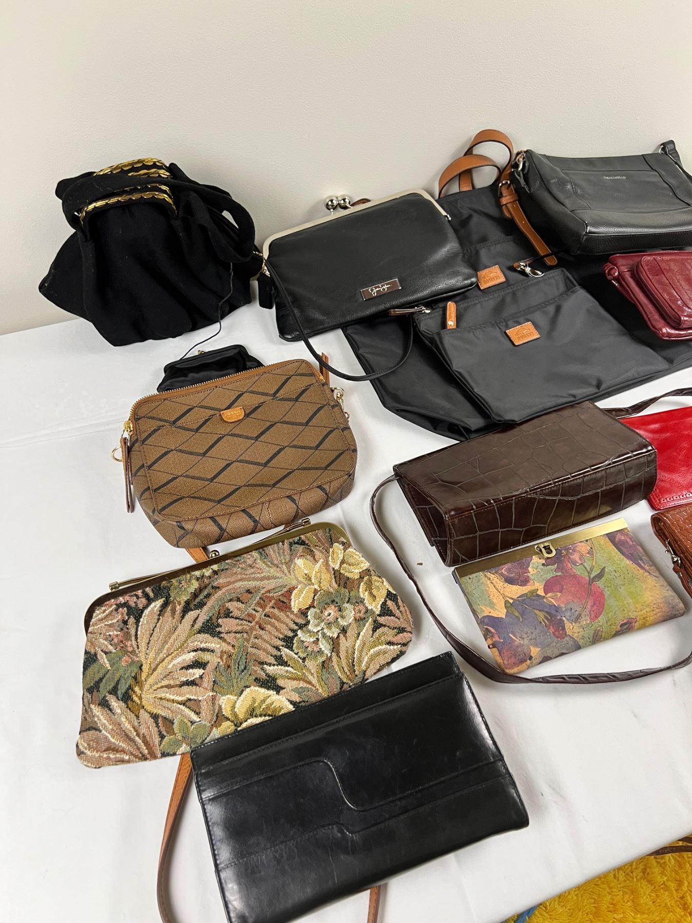 Brands vary shown in photo above. Includes purses, wallets and coin purses. Cannot verify authenticity of Fossil purse. Largest purse (Roots) is 14.5" by 17.5"