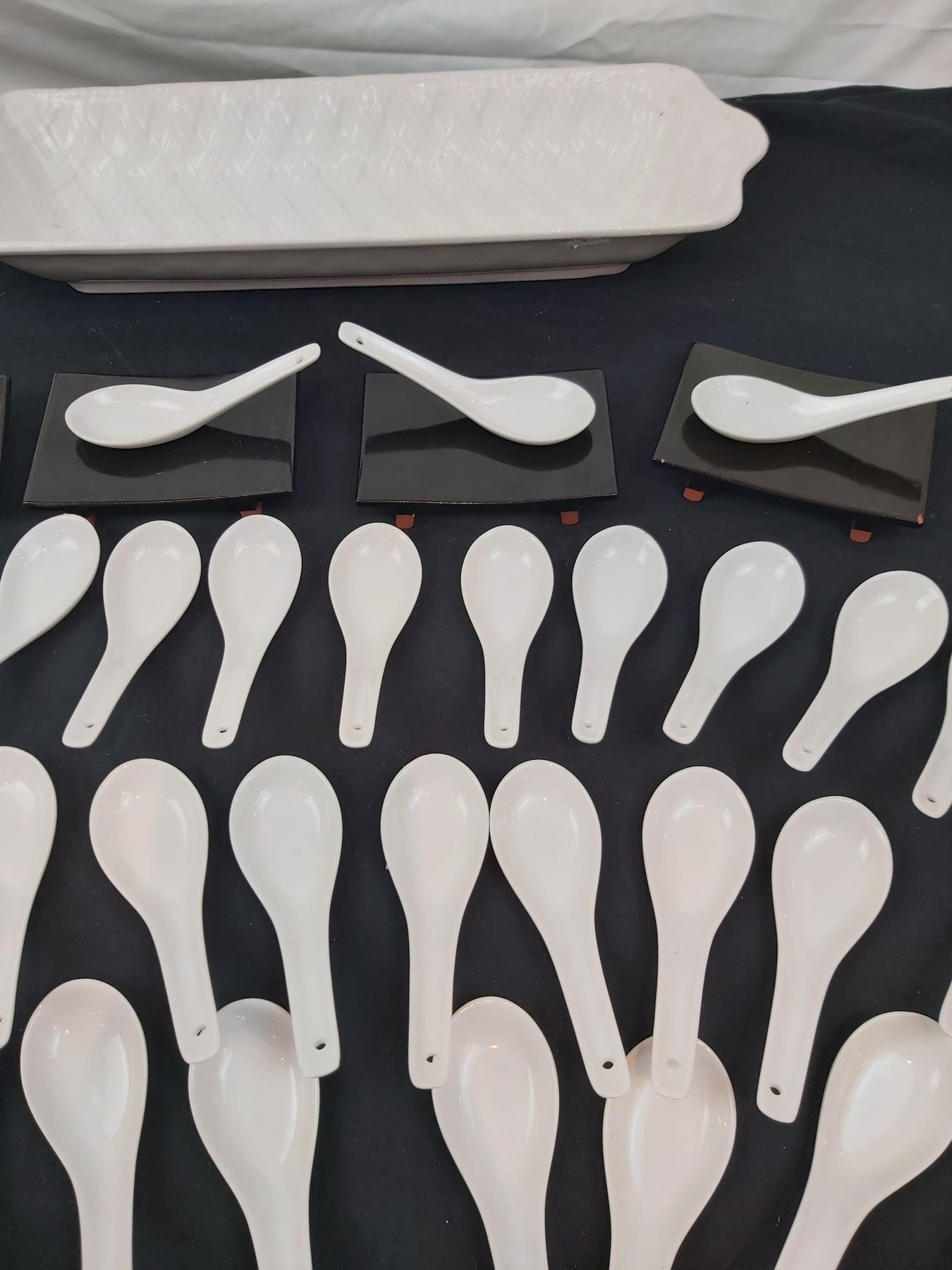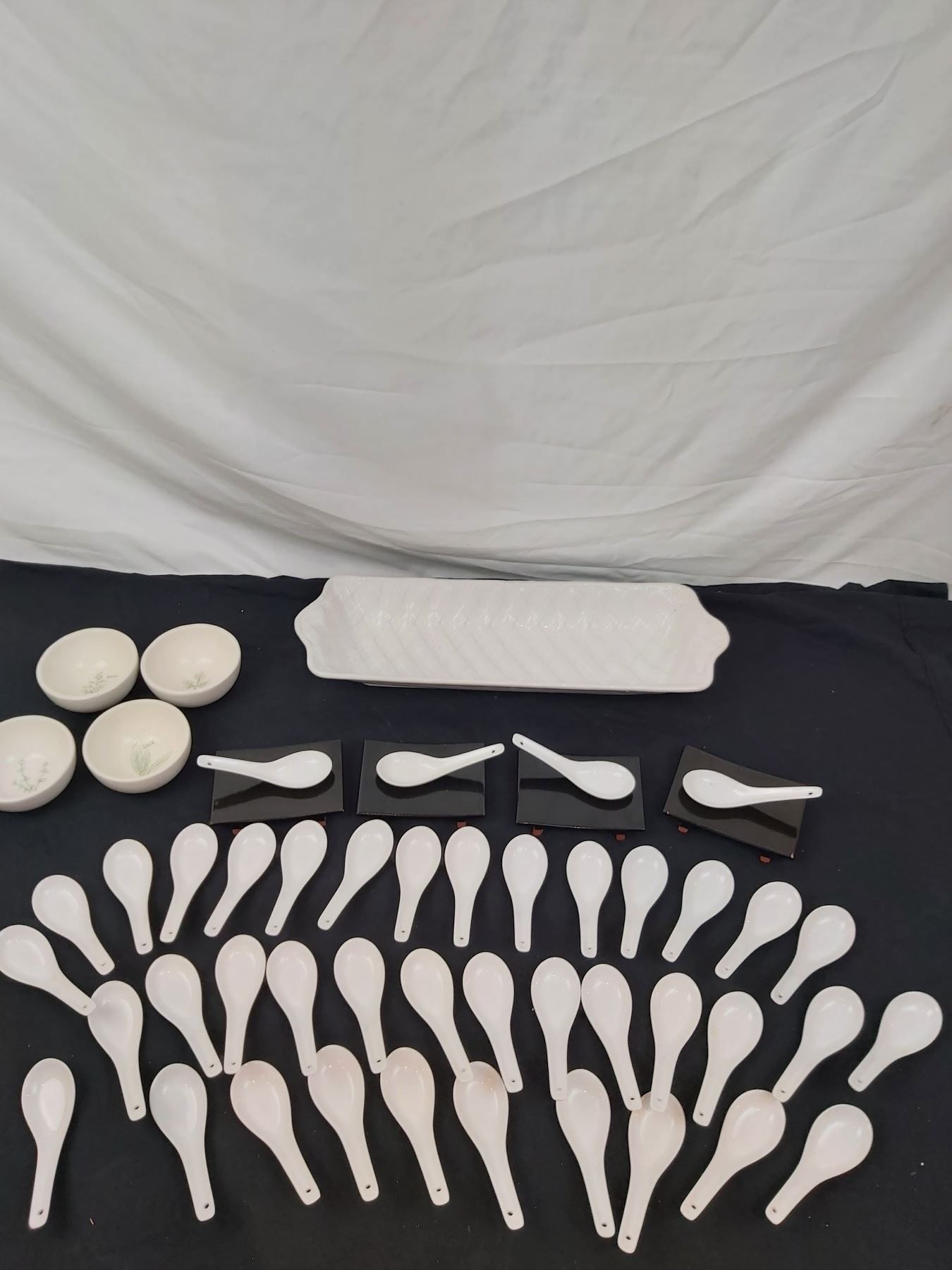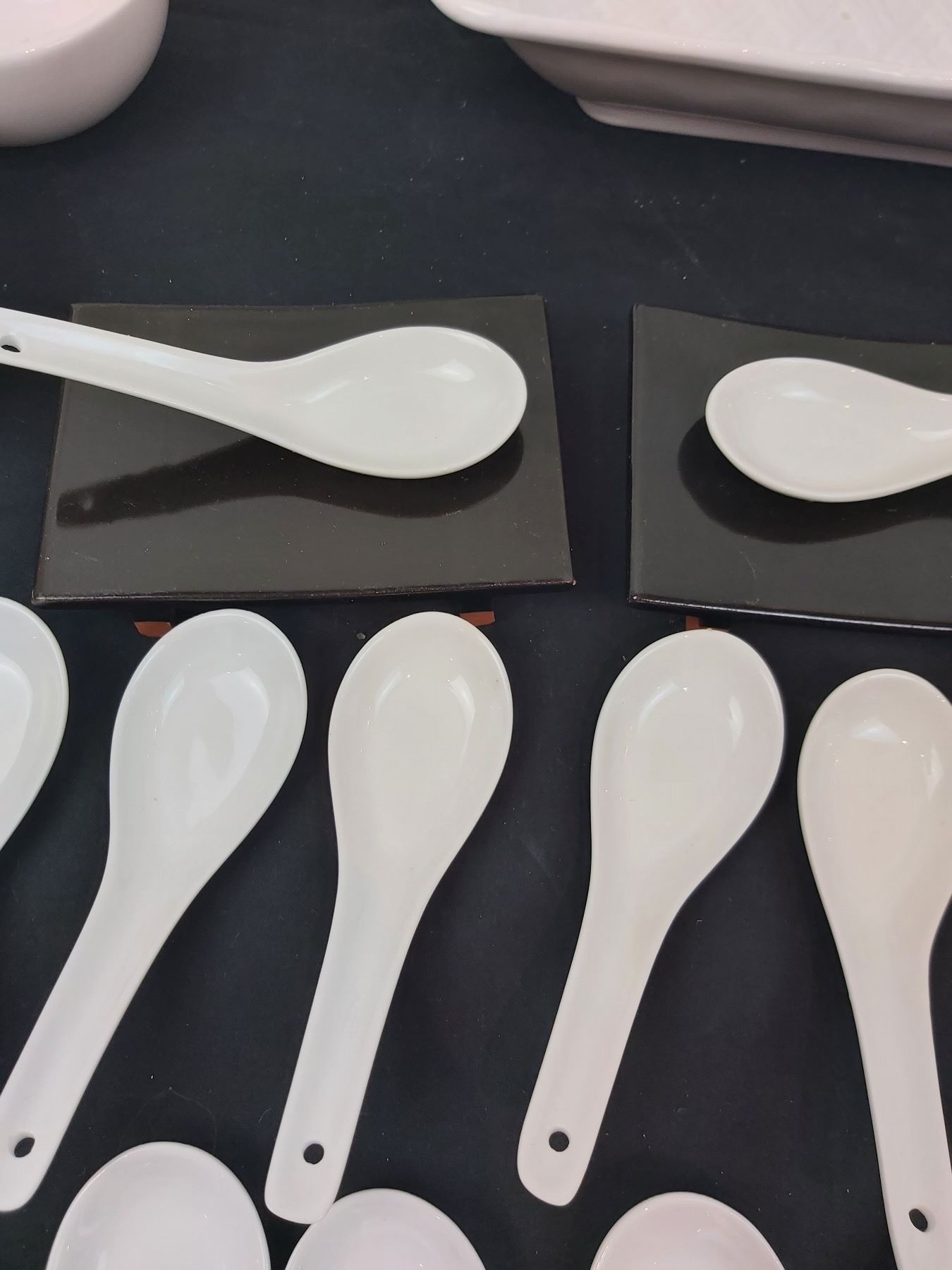 Includes, 4 bowls, 4 plates, 1 large tray, soup spoons